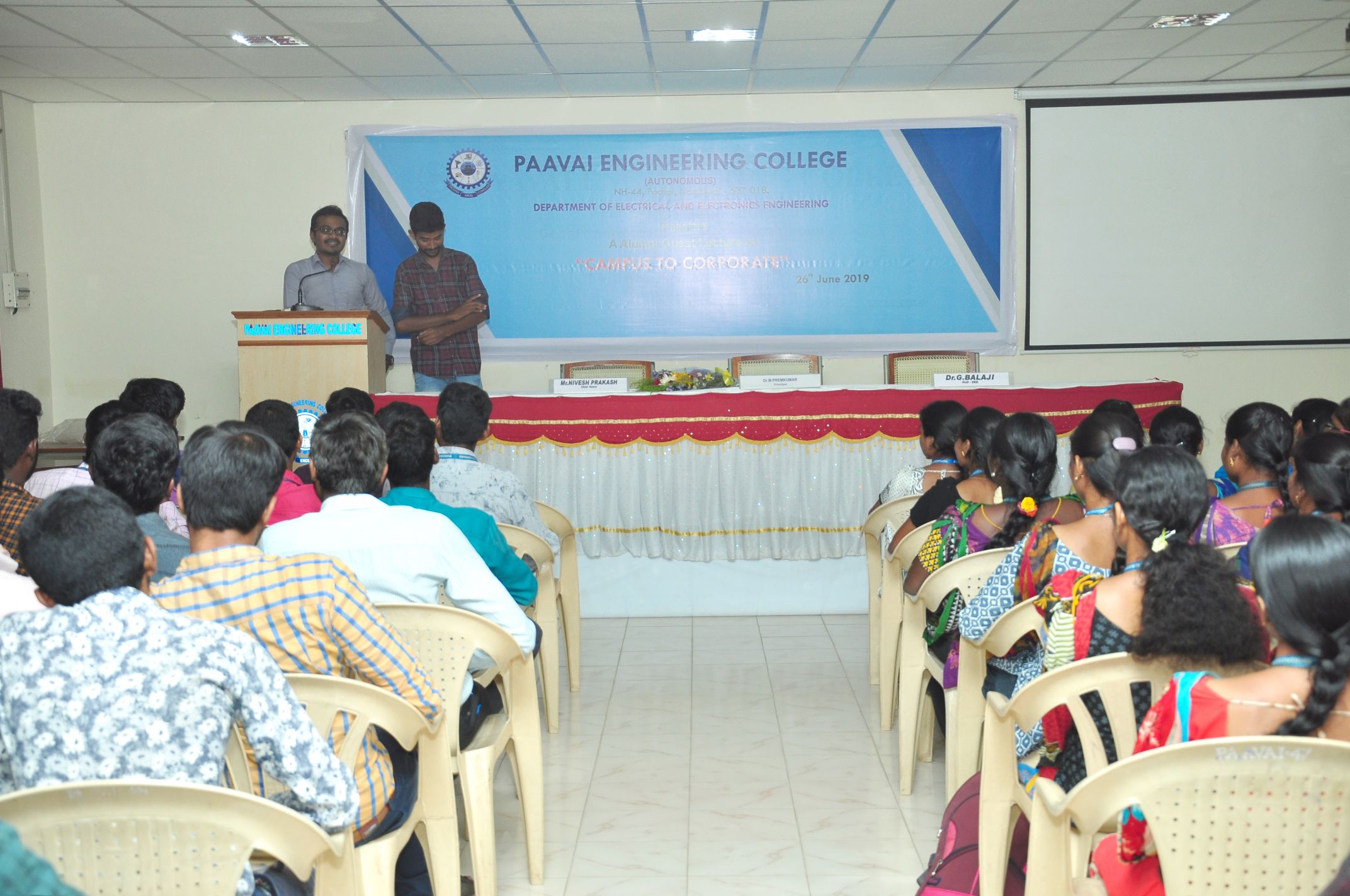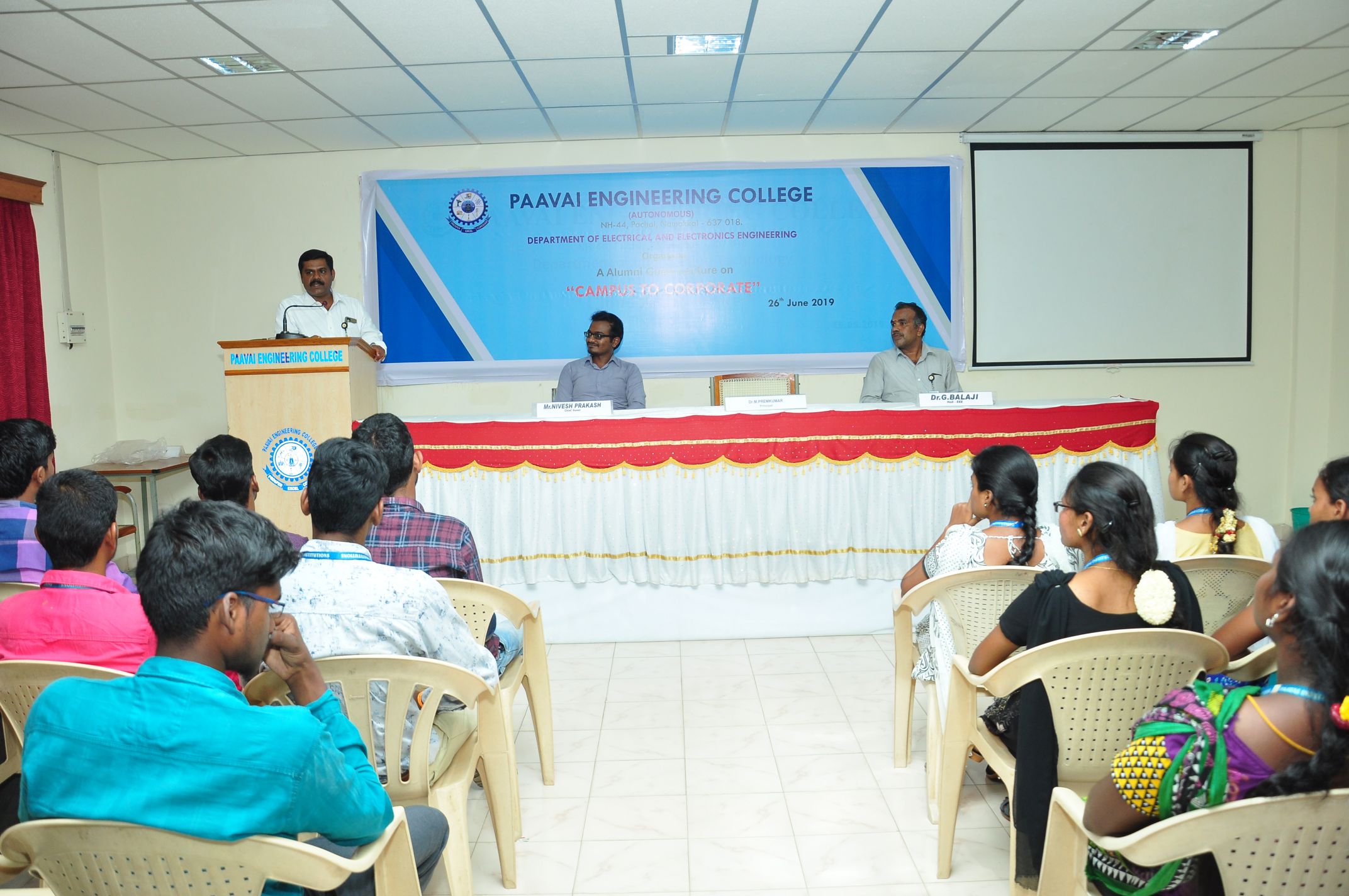 The Department of Electrical and Electronics Engineering, Paavai engineering college conducted an alumni guest lecture on the title, “CAMPUS TO CORPORATE” on 26.06.2019 at cute hall. Dr.M.Premkumar, Principal, Paavai Engineering College presided over the function.