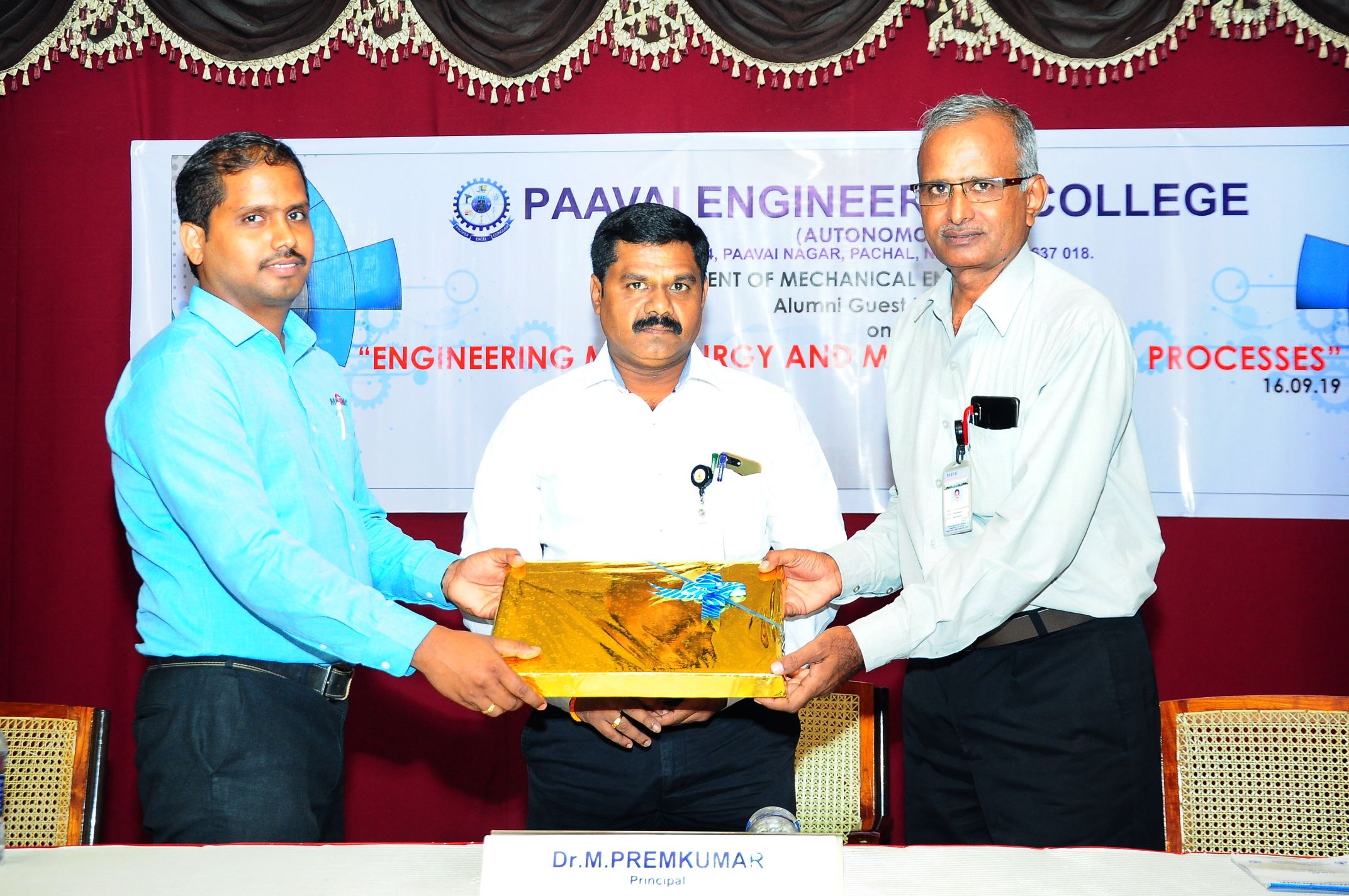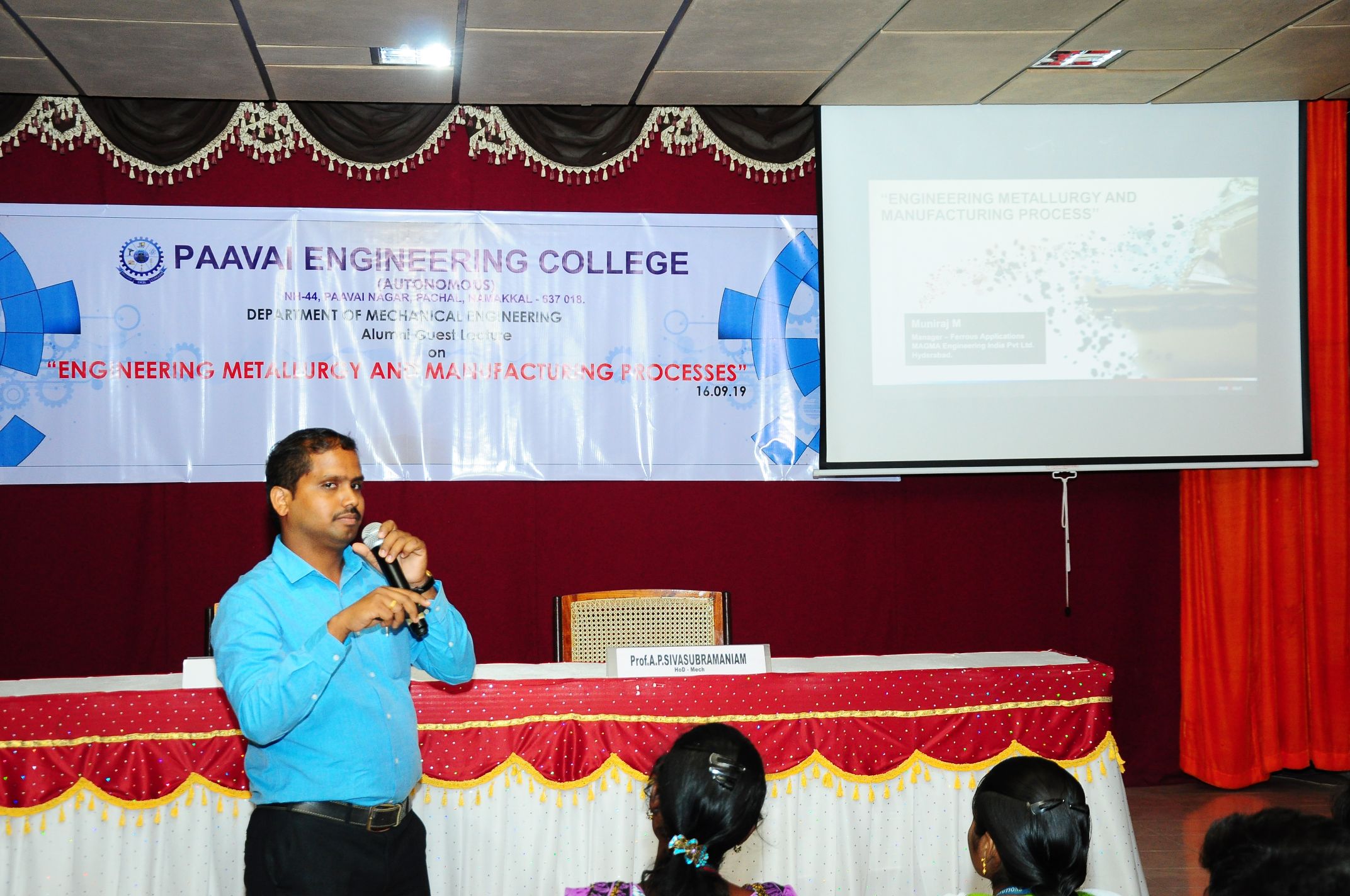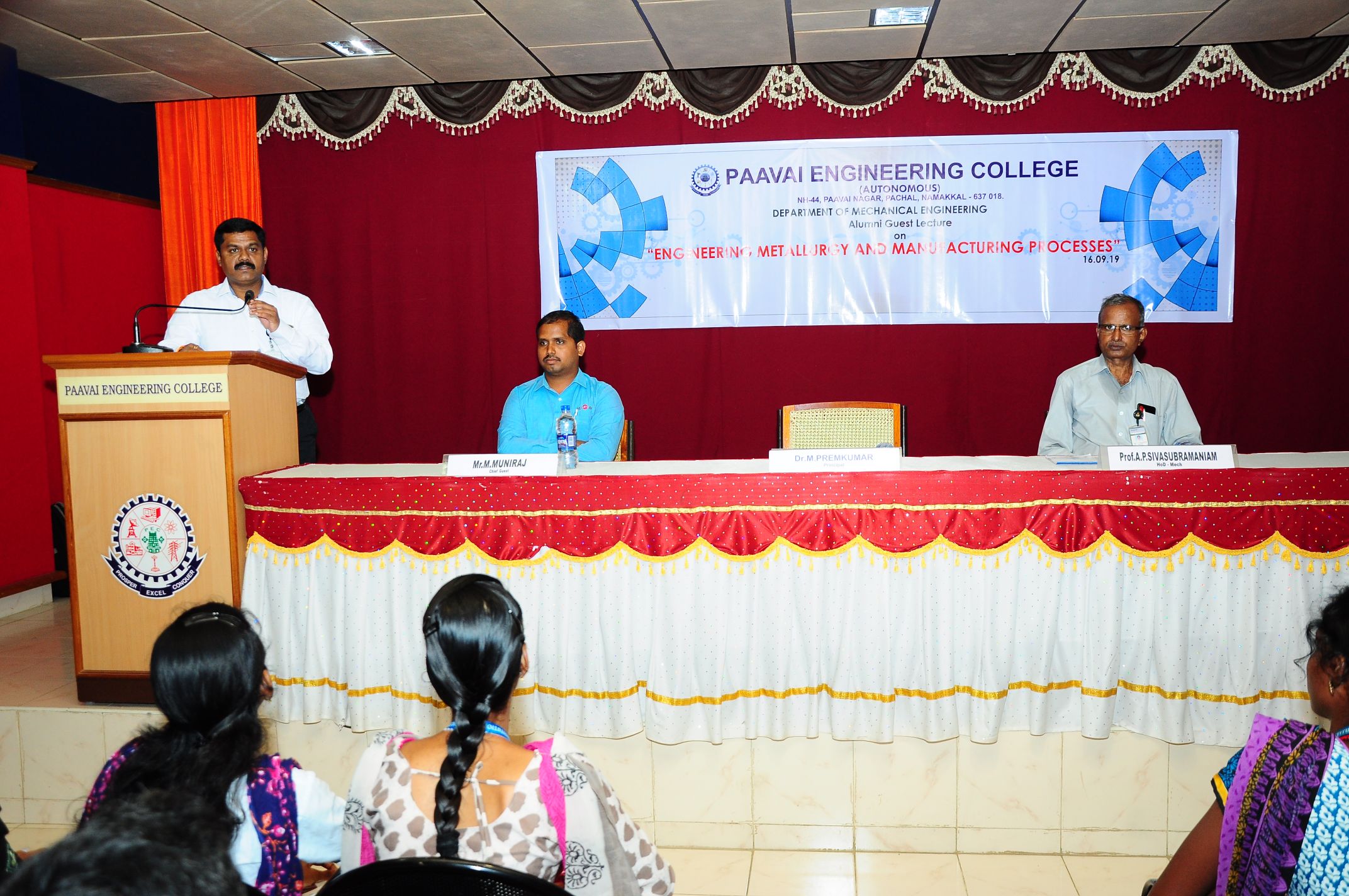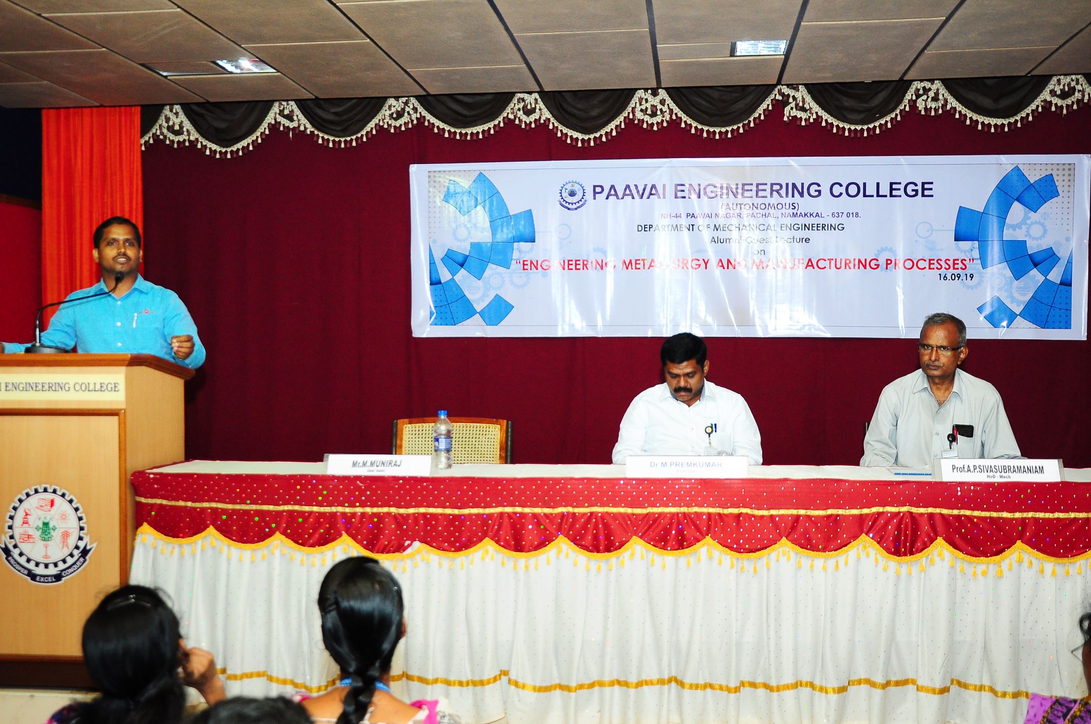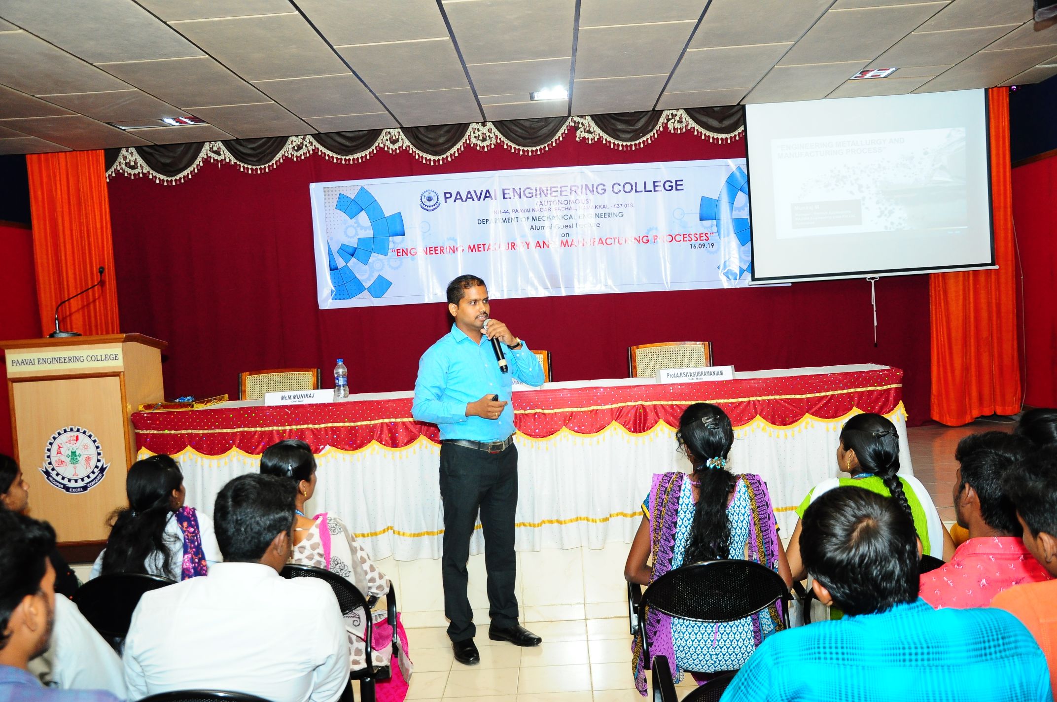 An alumni guest lecture on the topic of “Engineering Metallurgy and Manufacturing Processes” was organized by the Department of Mechanical Engineering on 16.09.2019 in Paavai Engineering College at Kalam chambers. An alumni of our college Mr. M.Muni Raj, Manager- Ferrous Applications,Magma Engineering India Pvt. Ltd., Hyderabad was the chief guest and delivered the special lecture. The programme was presided over by Dr.M.Premkumar, Principal, Paavai Engineering College. Prof.A.P.Sivasubramaniam, Head of Mechanical Engineering Department, Paavai Engineering College and faculty members took part and graced the occasion. Ms.K.Subasri, final year Mechanical Engineering student welcomed the gathering and Mr. B. Vigneshwaran, final year Mechanical Engineering student introduced the chief guest. Dr.M.Premkumar, Principal, Paavai Engineering College, in his presidential address urged that the students have to work hard to succeed in the job market. He insisted that, just desire and dream would not help, it is only the devotion towards our work, family, society that ultimately brings success for us. One can achieve higher positions in life through hard work and devotion irrespective of being talented or not. He also told that the alumni speaker was an expert in the field of foundry and could provide lot of inputs on present scenario in casting industries such as casting simulation software, advancements in foundry and employability requirements which would be helpful to the students to know about the outside world. He further stressed that the students should not miss such opportunities to enrich their academic and career related knowledge. The chief guest in his lecture explained through power point presentations as how ferrous materials are used in the casting processes along with their properties. He also described different types of casting techniques with examples, how simulation software is used in the casting industry for optimization, improving quality and design and reducing cost. The video clippings he used were very effective and received well by the students.He shared his industrial experience with the students and advised them to stick in a job at least for three year and learn the basics without worrying about the hardships which will bring them success in the later years. He further told the students have to self-monitor themselves on daily-basis, monthly-basis etc to improve their knowledge and skill to achieve success in career and life. The lecture was well received with interaction. Mr.R.Visnu, final year Mechanical Engineering student delivered the Vote of Thanks.