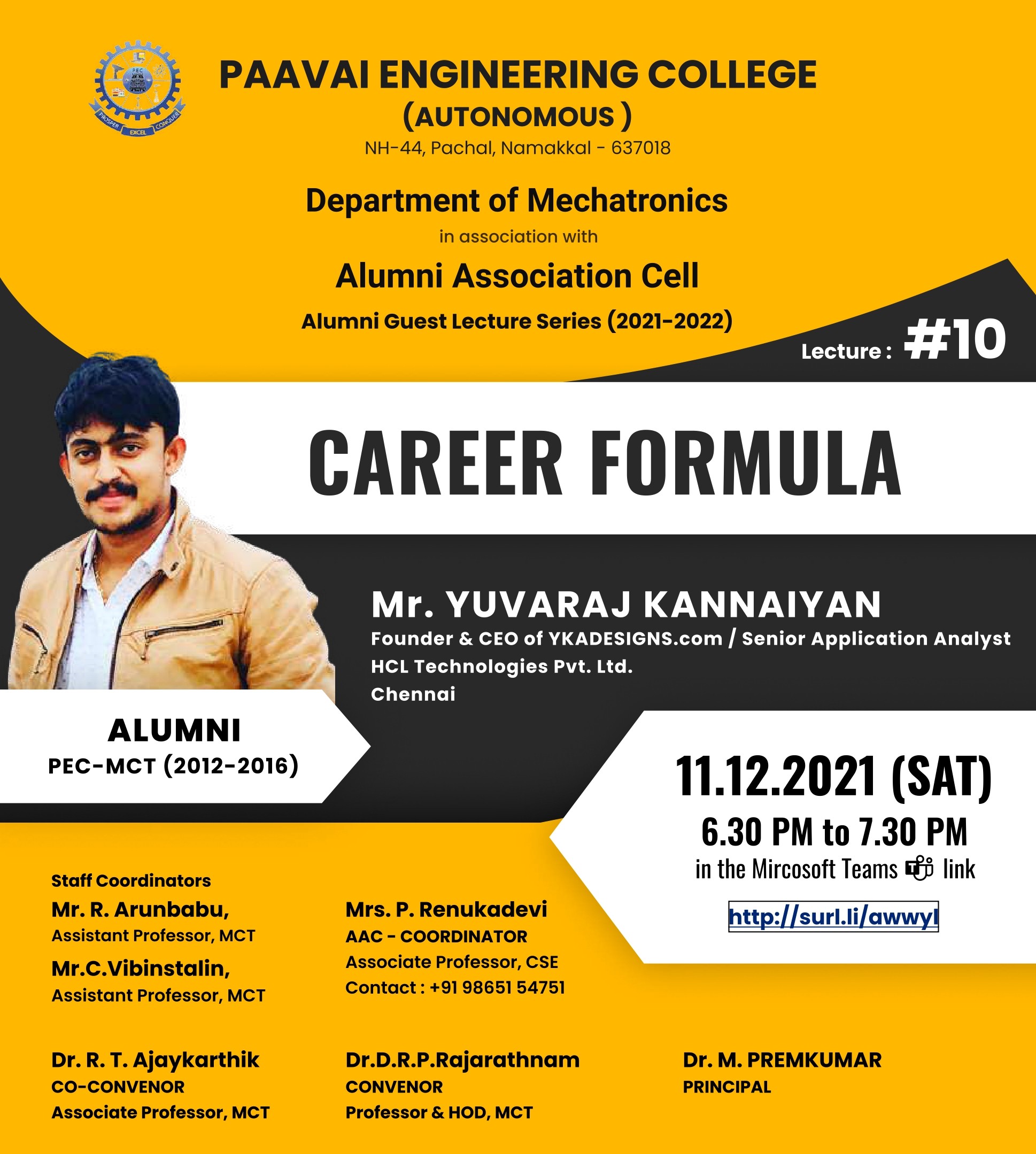 The department of Mechatronics, Paavai Engineering College organized a one-day alumni webinar on “CAREER FORMULA” on 11thDecember 2021. Mr.T. Dilshath Hussain, Final Year B.E/MCT welcomed the gathering. Dr.M. Premkumar, Principal, Paavai Engineering College, in his presidential address mentioned the importance of robot in future world. Mr. Yuvaraj Kannaiyan, Founder and CEO of YKADesigns.com, Senior Application Analyst, HCL Technologies Pvt.Ltd. Chennai was the resource person. Mr. S.B. Thinesh, Final year B.E/MCT introduced the chief guest.