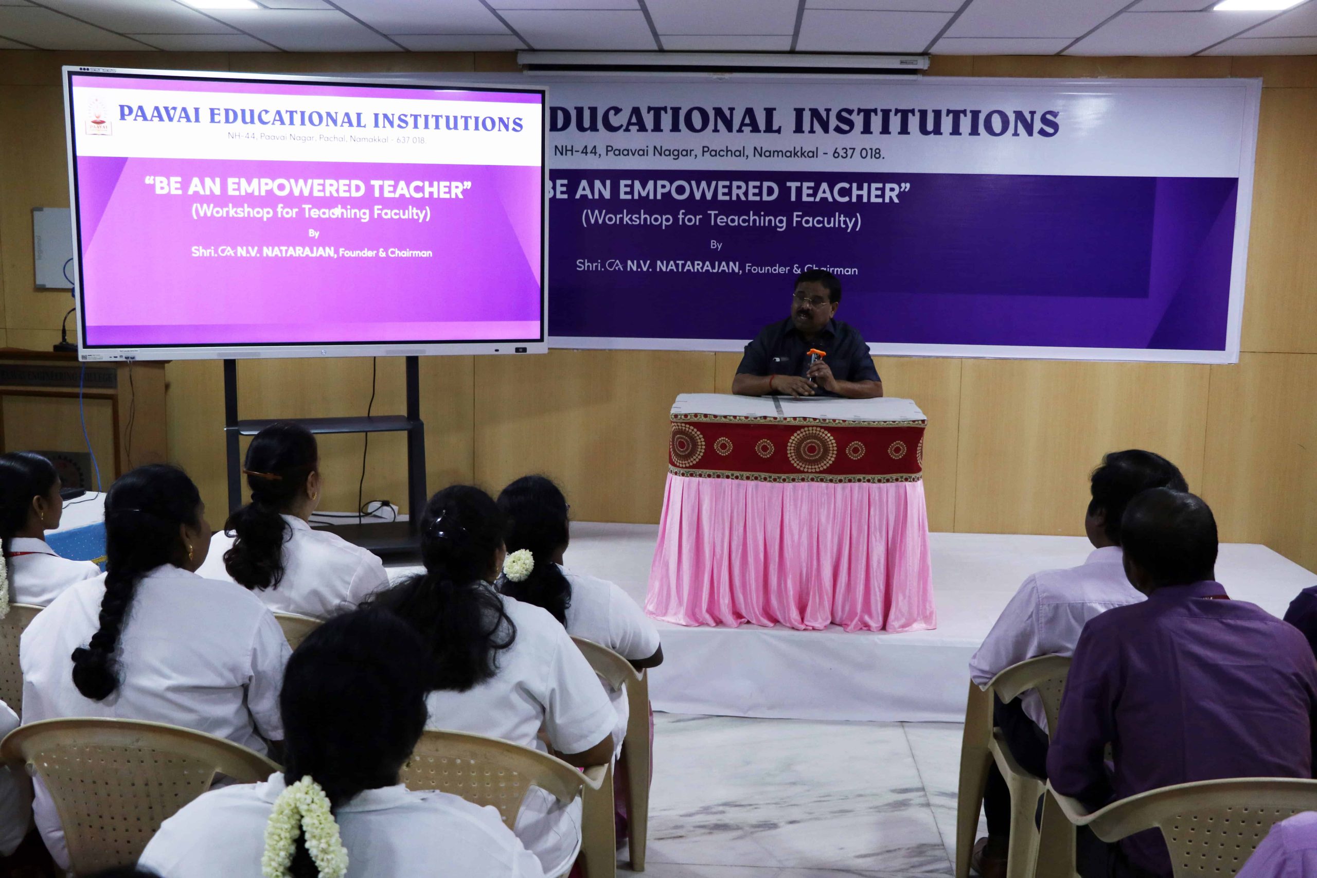 An exclusive workshop was organised on the topic entitled “Be an Empowered Teacher” by Shri.CA.N.V.Natarajan, most revered Chairman of Paavai Educational Institutions for all the faculty members of Paavai Educational Institutions from 20.6.2024 to 24.6.2024. A total of 400 faculty members were present for the workshop which was conducted in four batches.
