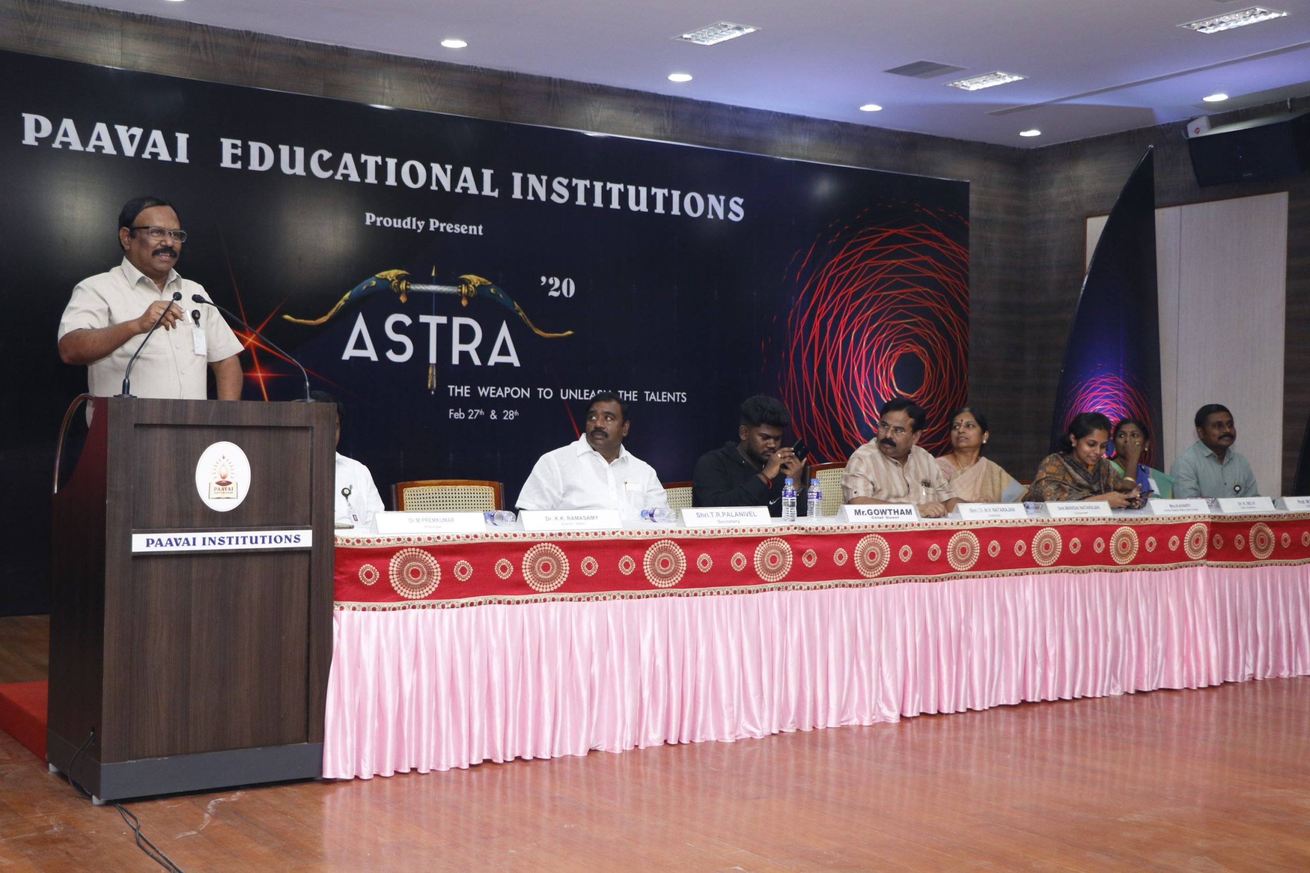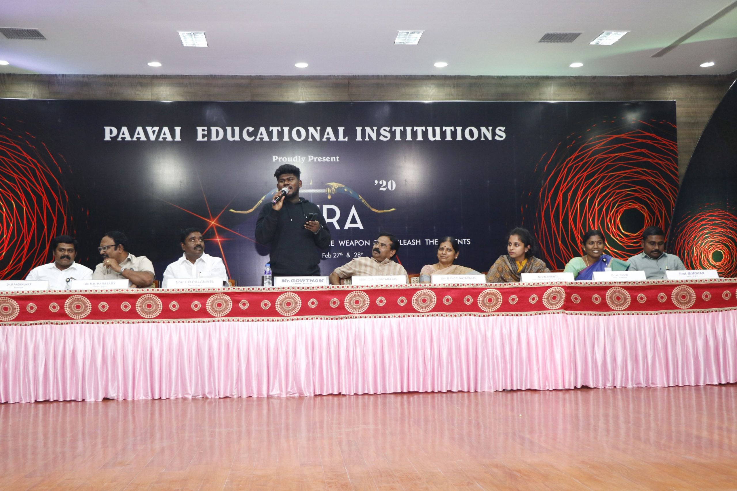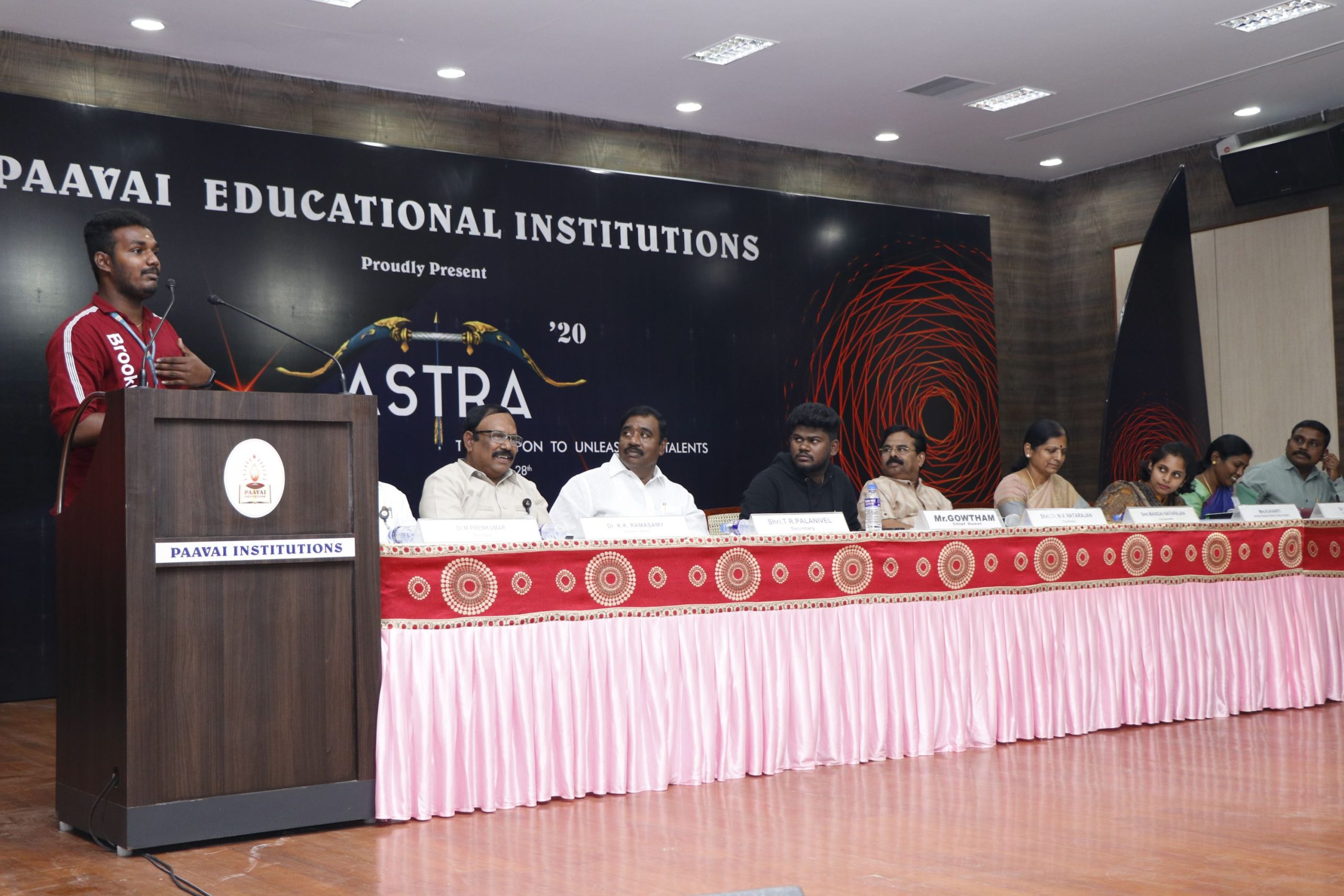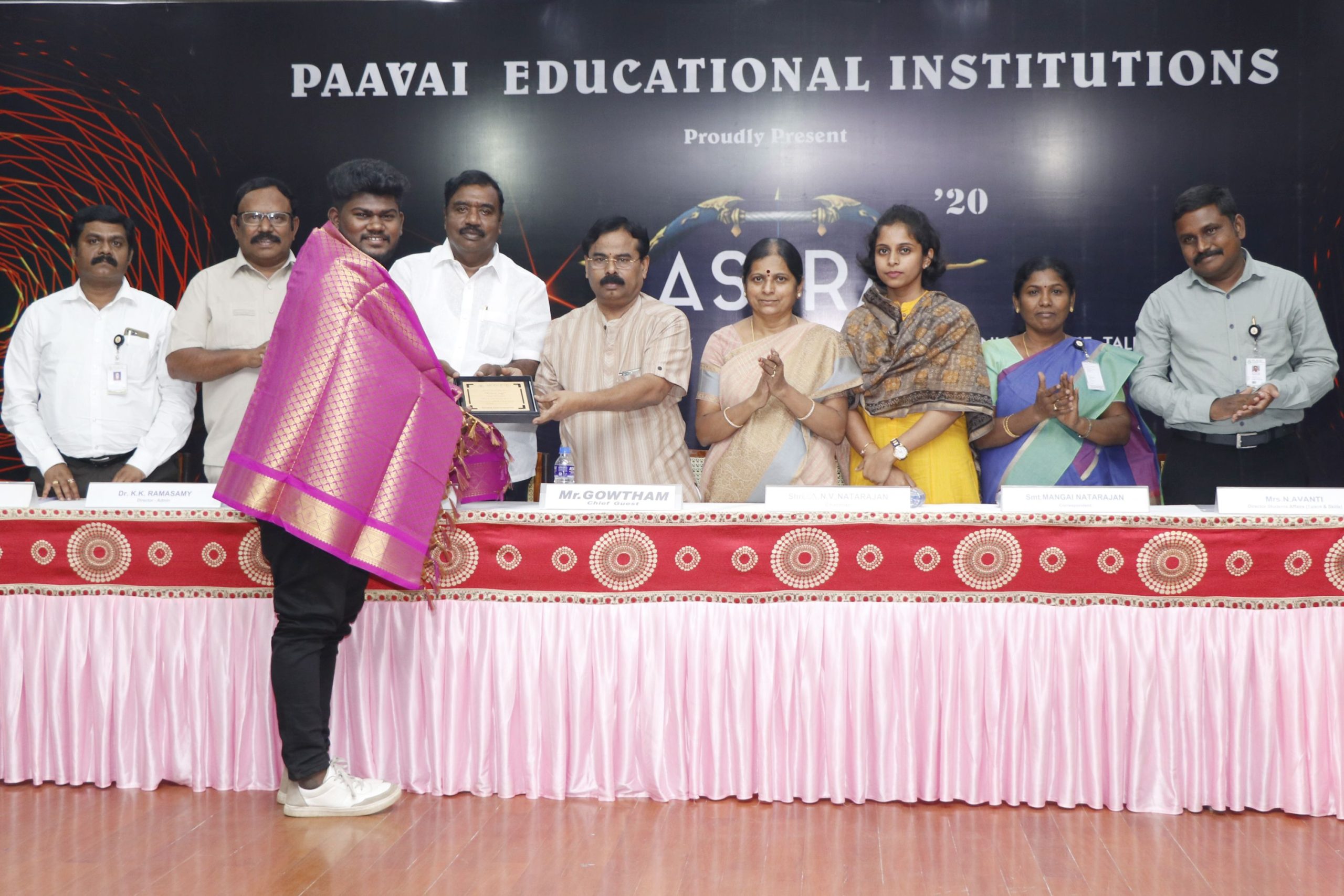 “ASTRA 2020” -A two day intra-collegiate cultural extravaganza was organized by Paavai Institutions under the student activity forum AURA and SPARISM on 27.02.2020 and 28.02.2020 for engineering students headed by Director, Student Affairs. Chairman CA. N.V. Natarajan presided over the function and delivered the presidential address. Mr.Gowtham, Playback Singer and Vijay TV Super Singer finalist season ‘7’was the chief guest. Director Student Affairs cum ASTRA convener Mrs.Avanti Natarajan welcomed the gathering. In the key note address, the chief guest Mr.Gowtham addressed the gathering that, “This ASTRA 20’ has given the students a platform to improvise their skills and interest towards cultural activities. ASTRA 20’, more than being a normal cultural fest, it has given them good experiences to shape their creativity and talents. He also included that these type of cultural fest will encourage and motivate younger minds to overcome fear and hesitation. In-addition he insisted that perseverance with determination will help them to succeed in life and become achievers. ASTRA 20’ had a new visage this year with a total of 40+ grand events grouped under 12 categories like Dance, Music, Singing, Dramatics, Pattimandram, Fashion Runway, Art Attack, Sports etc .These events were conducted to prove students’ strength and unity in this competitive cultural environment. Smt. Mangai Natarajan, Correspondent, Paavai Institutions felicitated the gathering. Chairman, Paavai Institutions greeted the Chief guest with a momento and shawl. ASTRA 20’ trophies were presented to the three teams – Paavai Wizards followed with Paavai Warriors and Paavai Panthers. Finally, Vote of thanks was delivered by Prof. M. Mohan, Head, Science and Humanities, Paavai Engineering College. In this function, Secretary Mr. Palanivel, Director Administration, Principals, Dean, Controller of Examination, juries, faculty members and students were present.