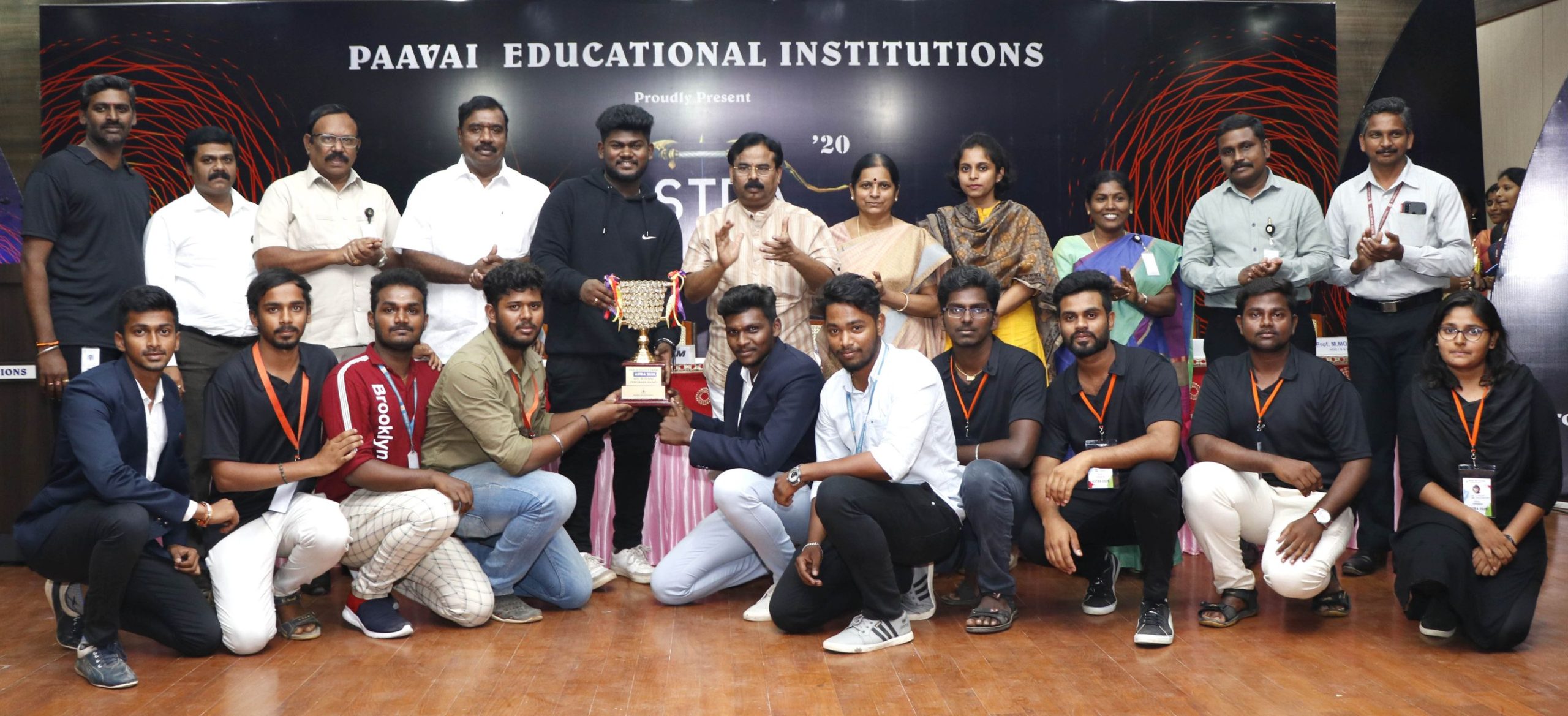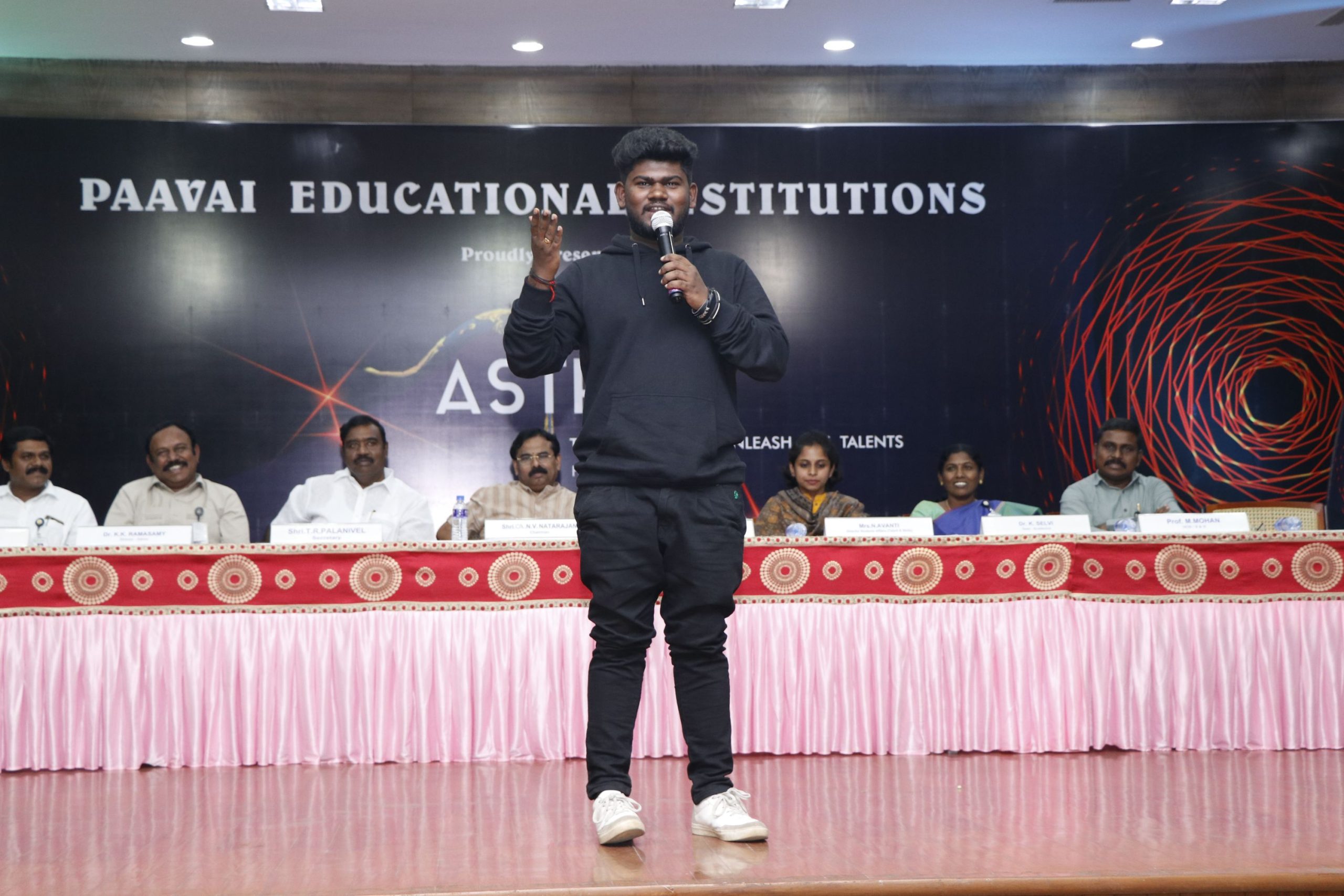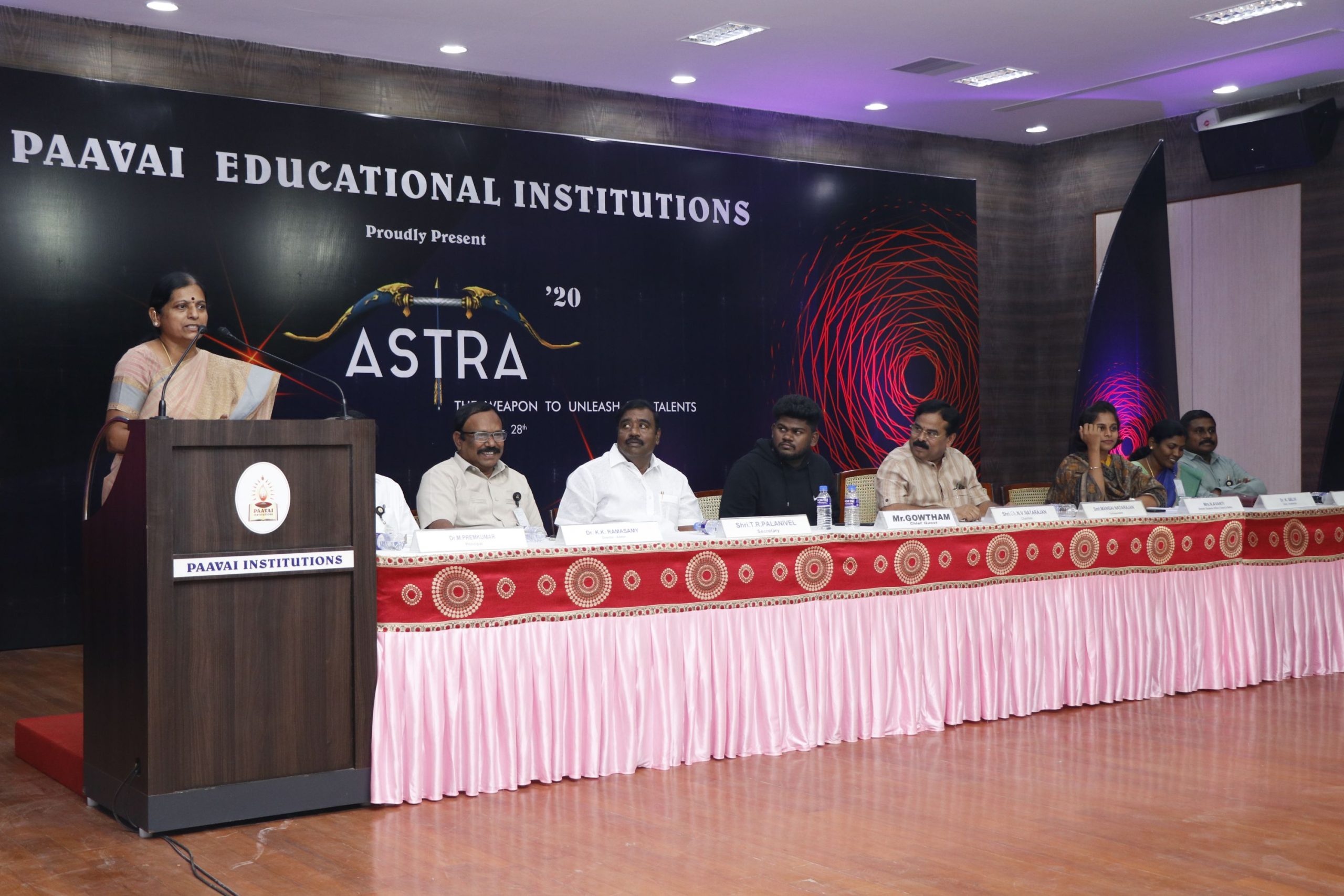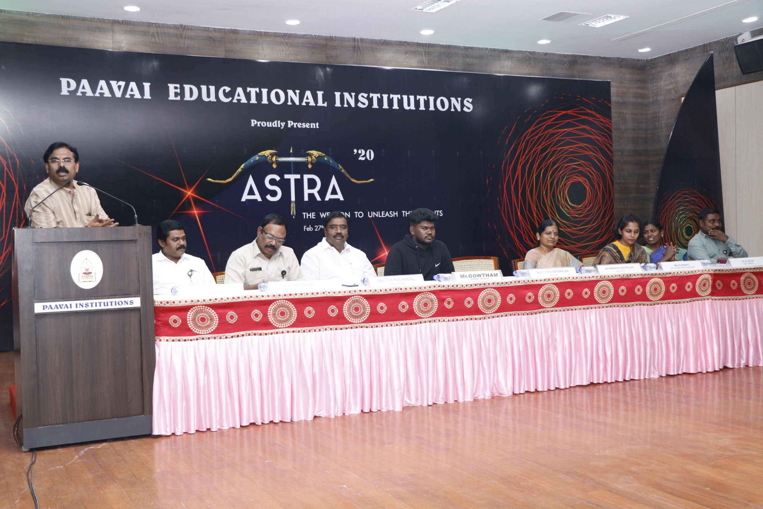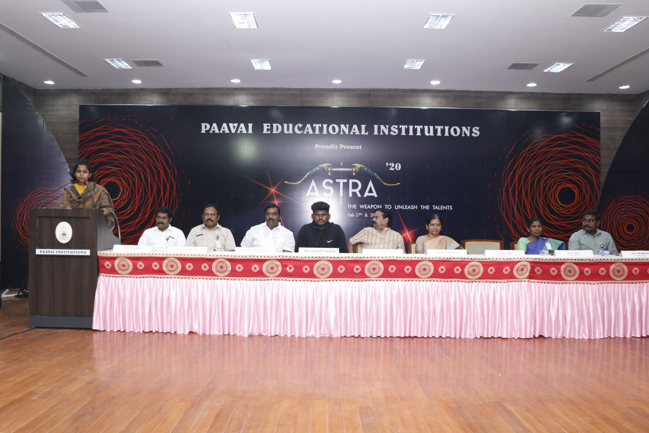 “ASTRA 2020” -A two day intra-collegiate cultural extravaganza was organized by Paavai Institutions under the student activity forum AURA and SPARISM on 27.02.2020 and 28.02.2020 for engineering students headed by Director, Student Affairs. Chairman CA. N.V. Natarajan presided over the function and delivered the presidential address. Mr.Gowtham, Playback Singer and Vijay TV Super Singer finalist season ‘7’was the chief guest. Director Student Affairs cum ASTRA convener Mrs.Avanti Natarajan welcomed the gathering. In the key note address, the chief guest Mr.Gowtham addressed the gathering that, “This ASTRA 20’ has given the students a platform to improvise their skills and interest towards cultural activities. ASTRA 20’, more than being a normal cultural fest, it has given them good experiences to shape their creativity and talents. He also included that these type of cultural fest will encourage and motivate younger minds to overcome fear and hesitation. In-addition he insisted that perseverance with determination will help them to succeed in life and become achievers. ASTRA 20’ had a new visage this year with a total of 40+ grand events grouped under 12 categories like Dance, Music, Singing, Dramatics, Pattimandram, Fashion Runway, Art Attack, Sports etc .These events were conducted to prove students’ strength and unity in this competitive cultural environment. Smt. Mangai Natarajan, Correspondent, Paavai Institutions felicitated the gathering. Chairman, Paavai Institutions greeted the Chief guest with a momento and shawl. ASTRA 20’ trophies were presented to the three teams – Paavai Wizards followed with Paavai Warriors and Paavai Panthers. Finally, Vote of thanks was delivered by Prof. M. Mohan, Head, Science and Humanities, Paavai Engineering College. In this function, Secretary Mr. Palanivel, Director Administration, Principals, Dean, Controller of Examination, juries, faculty members and students were present.