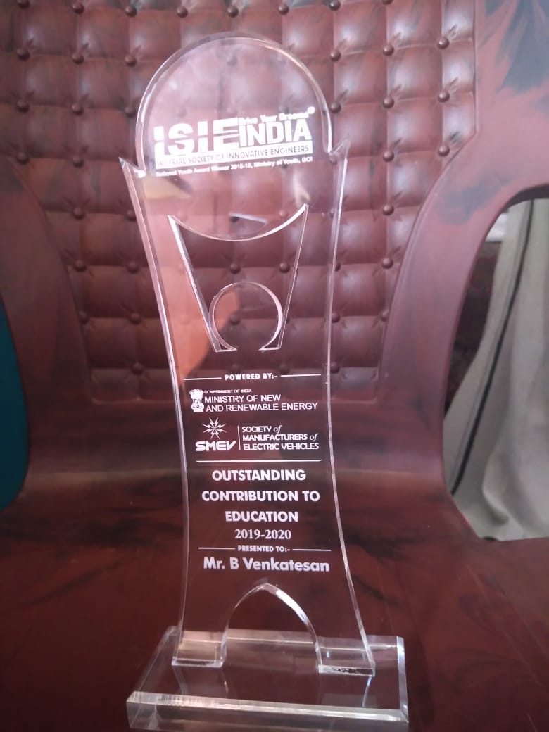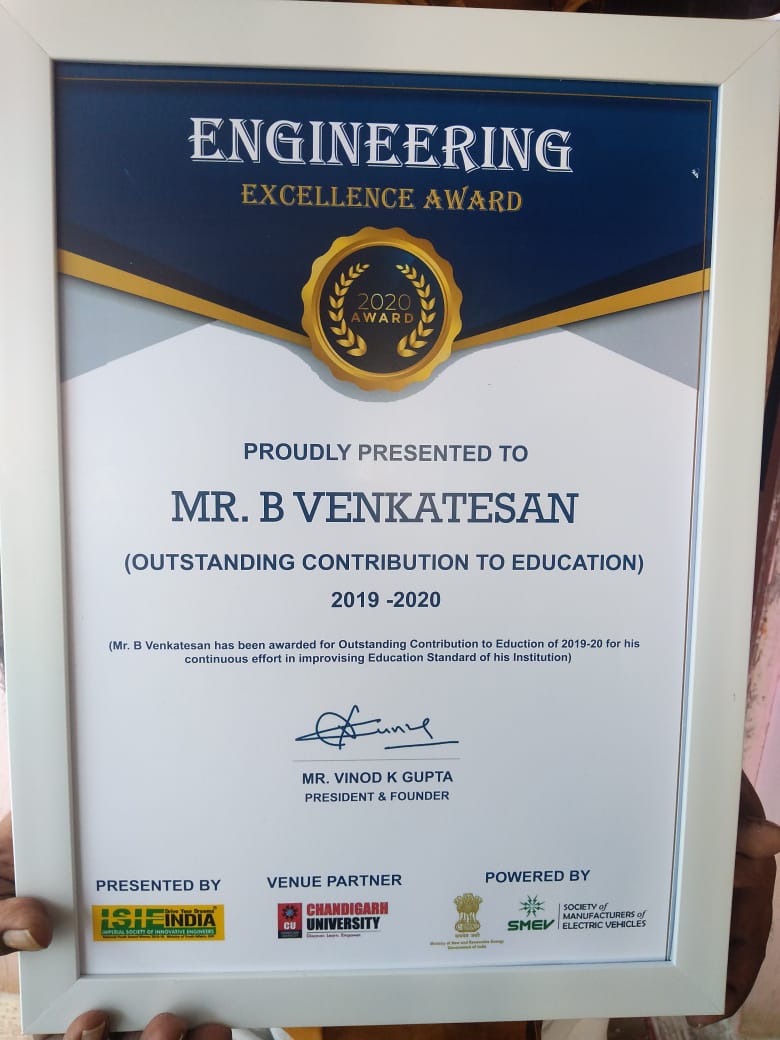 B Venkatesan, HOD / IT has been awarded for “Outstanding Contribution to Education 2019-2020 “ for his continuous effort in improving Education Standard of his Institution from Imperial Society of Innovative Engineers(ISIEINDIA)