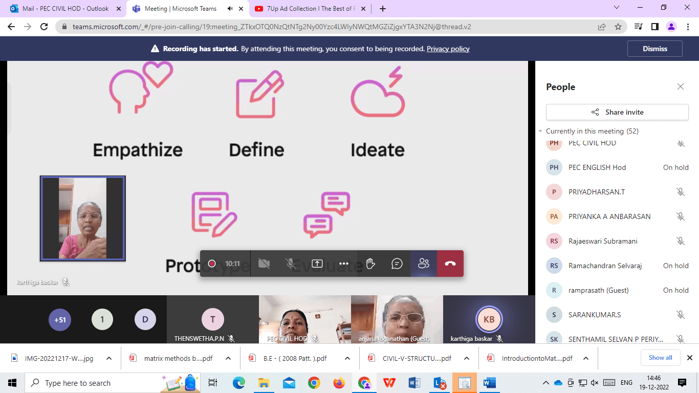 The Department of Civil Engineering in association with the Institution’s Innovation Council of Paavai Engineering College (Autonomous) have organized an Online Workshop on Design Thinking, Critical Thinking and Innovation Design ”on 19.12.2022 from 2.00 p.m. to 3.30 p.m. Dr.R.Kasthuri Bai , Emeritus Professor ,Sri Sarada College for Women , Salem was the resource speaker.