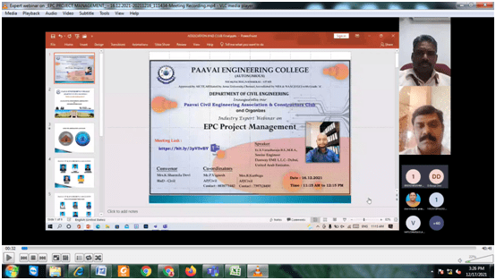 A one day Industry Expert Webinar on the title “EPC Project Management” was organized by the Department of Civil Engineering, Paavai Engineering College on 17.12.2021. Ms. S.U.Sushmaa, Final year student welcomed the gathering. Dr.M.Premkumar, Principal, Paavai Engineering College delivered his presidential address on this event, he elaborated about various opportunities in Civil Engineering for the betterment of students.