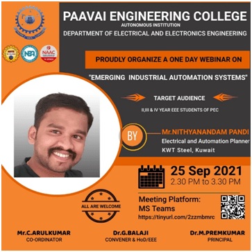 The Department of EEE,Paavai Engineering College has conducted a one-day webinar on “Emerging Industrial Automation Systems” on 25.09.2021 at 02.30 p.m. through Microsoft Team platform.