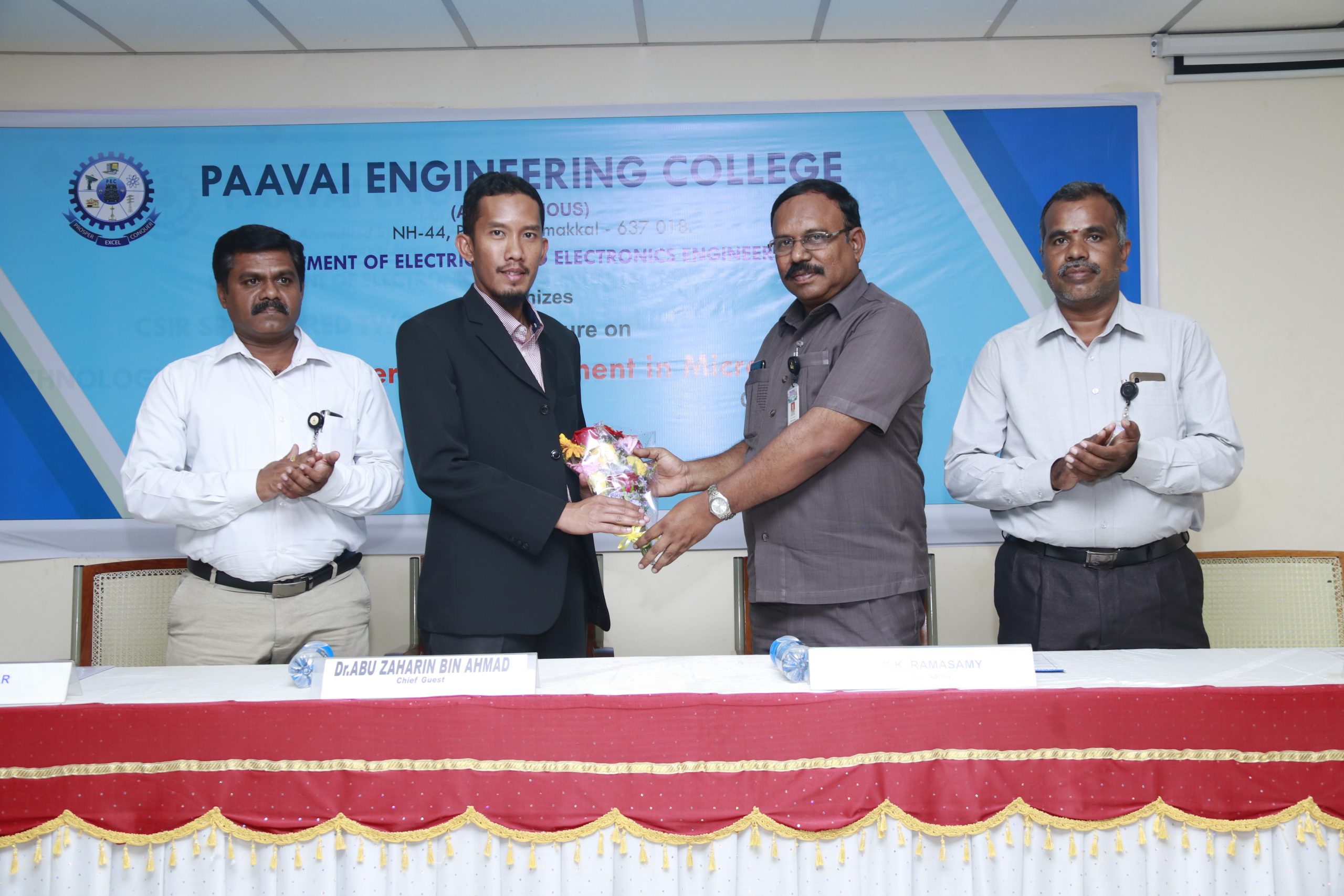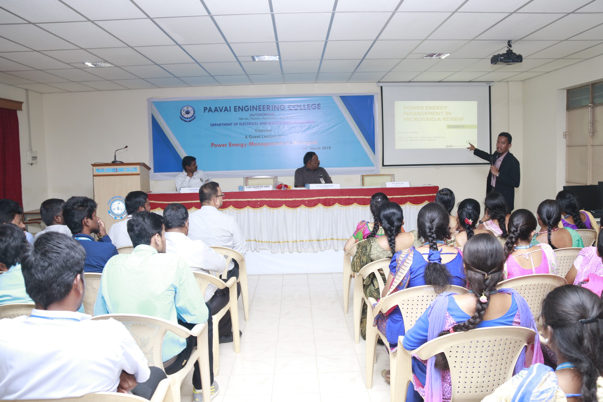 The Department of EEE, Paavai Engineering College (Autonomous), conducted a guest lecture on the title, POWER ENERGY MANAGEMENT IN MICROGRID on 06.03.2019. Dr.K.K.RAMASAMY, Director – Administration, Paavai Institutions and Dr.M.PREMKUMAR, Principal, Paavai Engineering College (Autonomous) graced the occasion. In his presidential address, Dr.K.K.RAMASAMY, Director – Administration, insisted the students to consider this kind of guest lecture as an opportunity to know the advancements in the field of power management in microgrid. He also insisted the need of developing the skills in their respective domains and learning other languages which would help them during their career. Knowledge upgradation is quite necessary and there is always a constant opportunity for effective electrical engineers. Dr. ABU ZAHARIN BIN AHMAD, Senior Lecturer, Faculty of Electrical and Electronics Engineering, University of Malaysia Pahang, Malaysia, was the chief guest. In his lecture, he spoke about the power generation using renewable and conventional energy sources. Interconnection of various energy sources such as PV Cells, wind, fossil fuels, and energy storage equipment such as battery, fuel cell were explained. He mentioned about the hierarchy of microgrid. He also explained about SCADA system concepts for microgrid. He insisted the participants to shape themselves according to the needs of the society as they are in the period of innovation. Ms.S.A.Mubeena Begam of final year EEE welcomed the gathering and Ms.S.Thamarai Selvi of final year EEE proposed the vote of thanks.