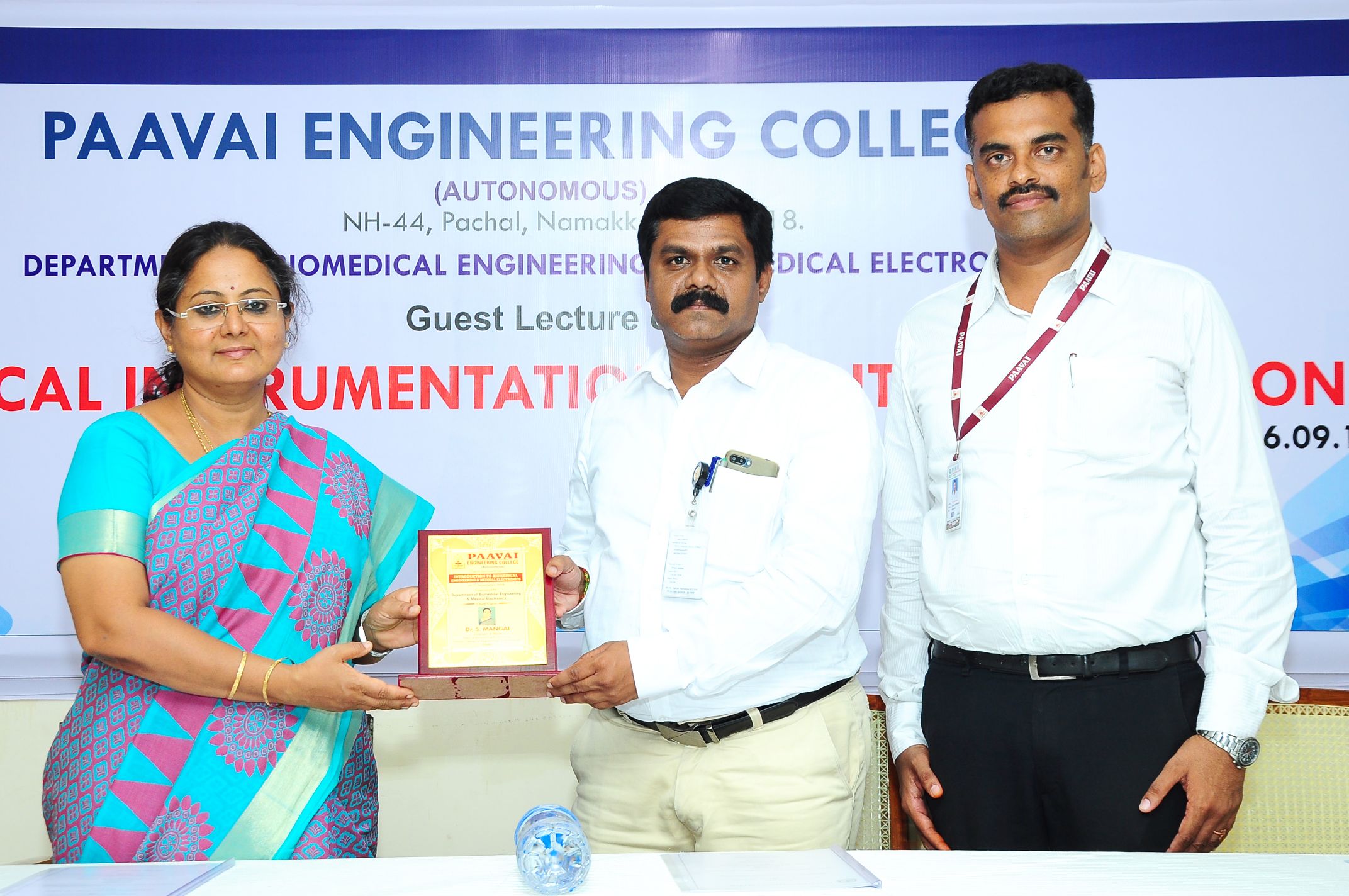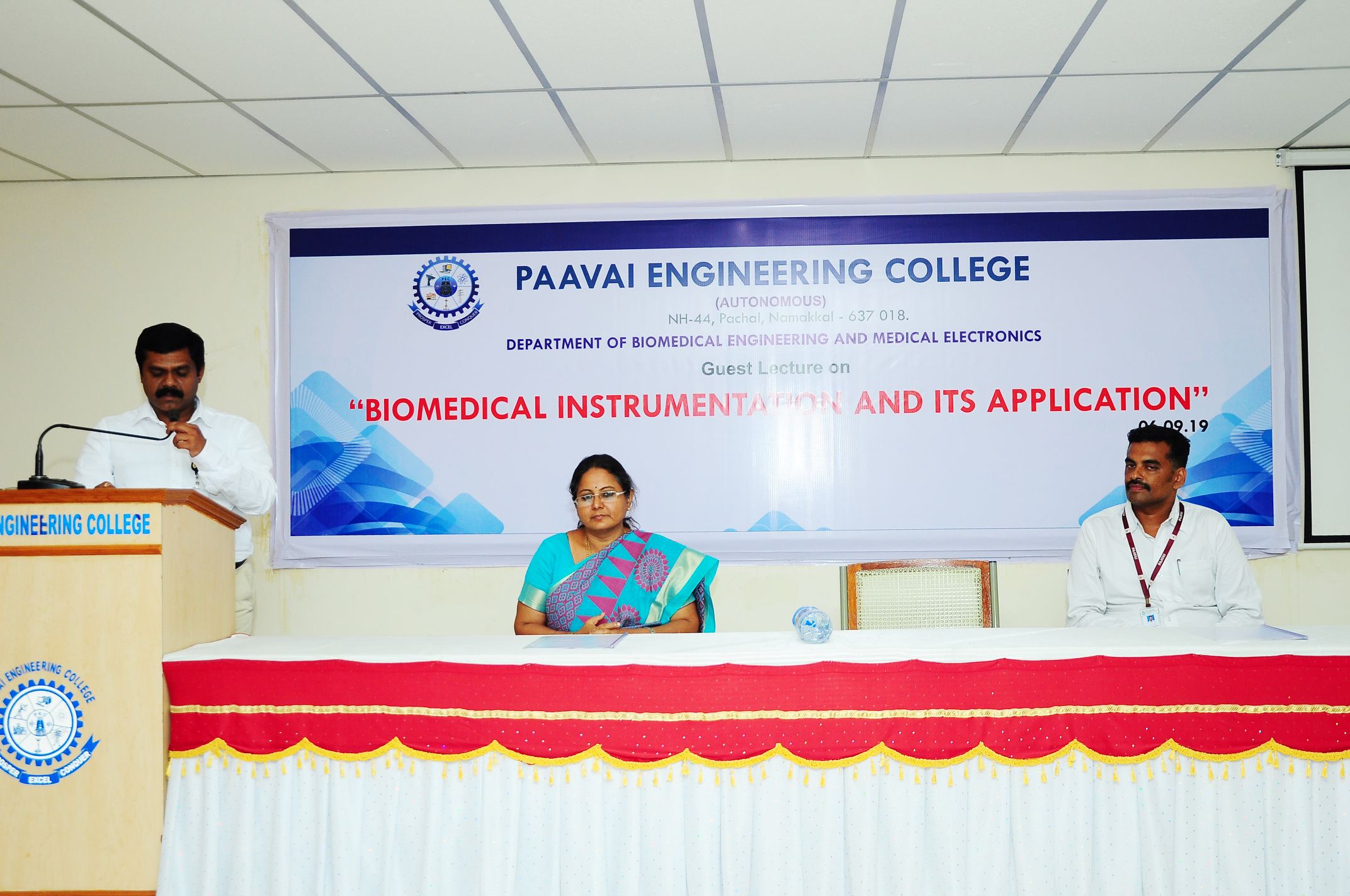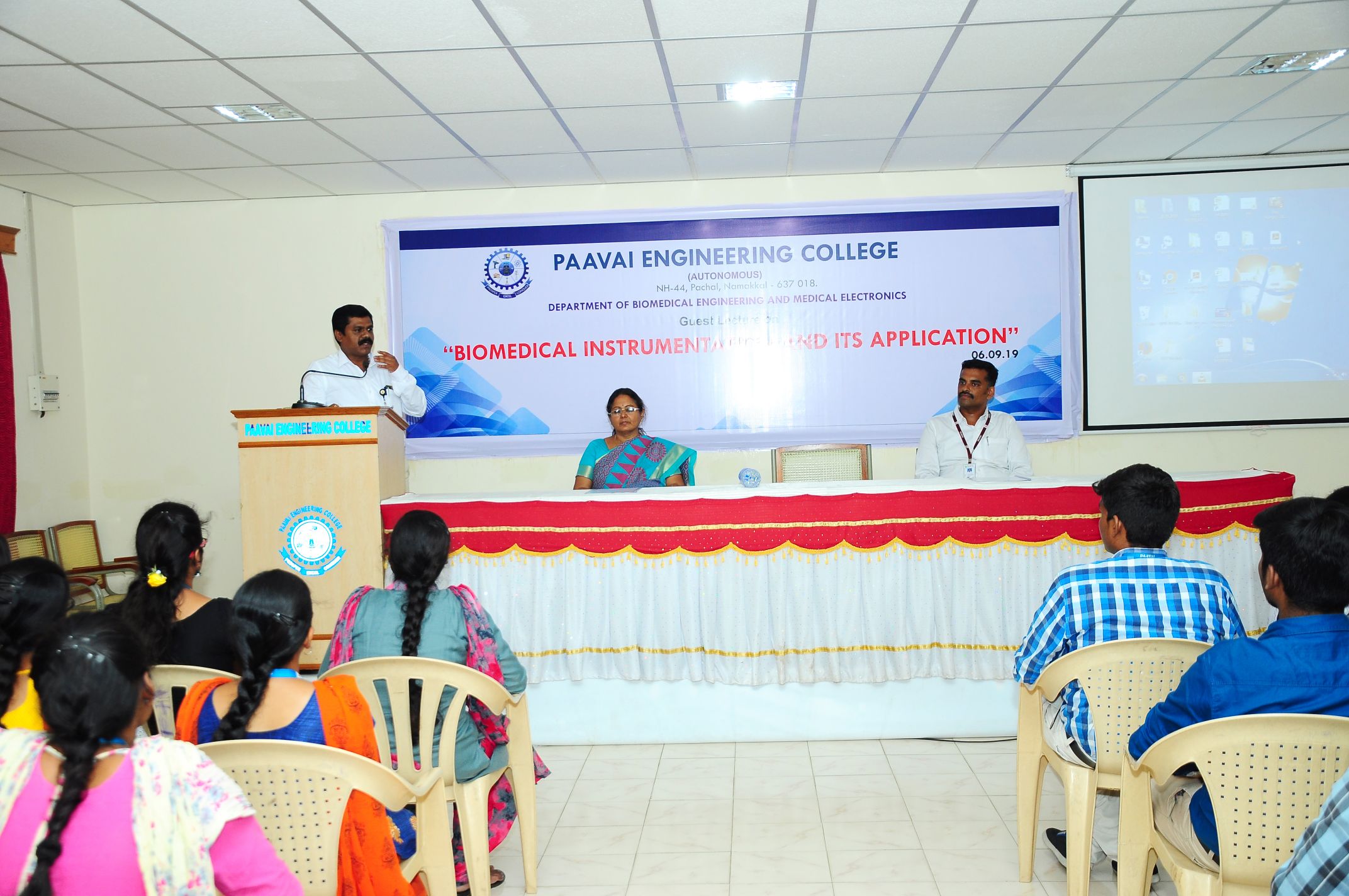 The Department of Biomedical Engineering and Medical Electronics was organized an Industry guest lecture program on the title of “Scope and Opportunities of Biomedical Engineering”. The session was inaugurated at 1.30 p.m. by Dr.M.Prem Kumar Principal, in the presence of Head of the department – Biomedical Engineering and Medical Electronics, faculty members and the participants from departments of Biomedical Engineering and Medical Electronics. In his Presidential Address, the Principal highlighted the importance of the latest technology. The keynote address was given by the guest speaker Dr.S.Mangai, Professor and Head, Department of Biomedical Engineering, Velalar college of Engineering and Techonology, Erode. He expressed his sincere gratitude to the College for their support. He expressed his experience to a student which gave him confidence to face the interviews in worldwide outside the campus. The session was carried over on the title “Scope and Opportunities of Biomedical Engineering”. He shared the information about the importance of the medical engineering students in the companies. He told the student to Pay attention, give the speaker your undivided attention and acknowledge the message. Then he noted the various scope and opportunities in the various environments in the working area of medical engineering. The encouragement was given to all the students to participate in all the trainings in companies. Hospitals and in research areas. He gave the positive motivation to all the students to work at with a positive vibration. He rendered his heartfelt thanks to the Management, Head of the Department – Biomedical Engineering and Medical Electronics and the faculty members. Mr.M.Rajesh, second year Biomedical Engineering, welcomed the gathering. The chief guest introduction was performed by Ms.V.Sathya Priya second year Biomedical Engineering. Master of ceremony was organized by ms.V.Vasunthera Medical Electronics. The session ended around 4:30 p.m. with the vote of thanks proposed by Mr.S.Keerthana, second year Medical Electronics.