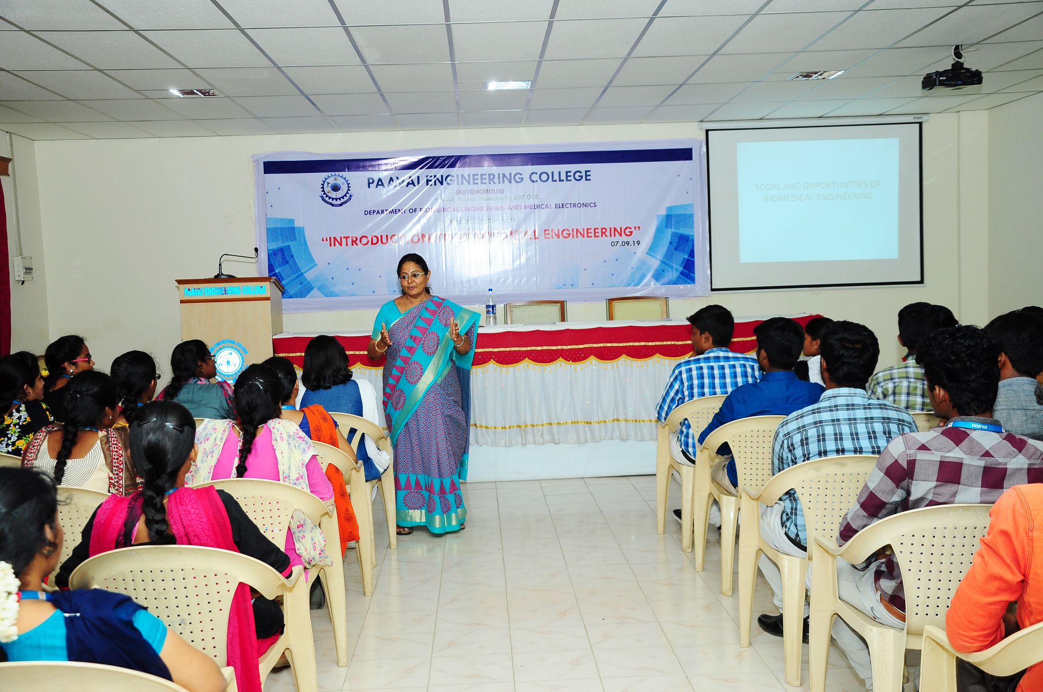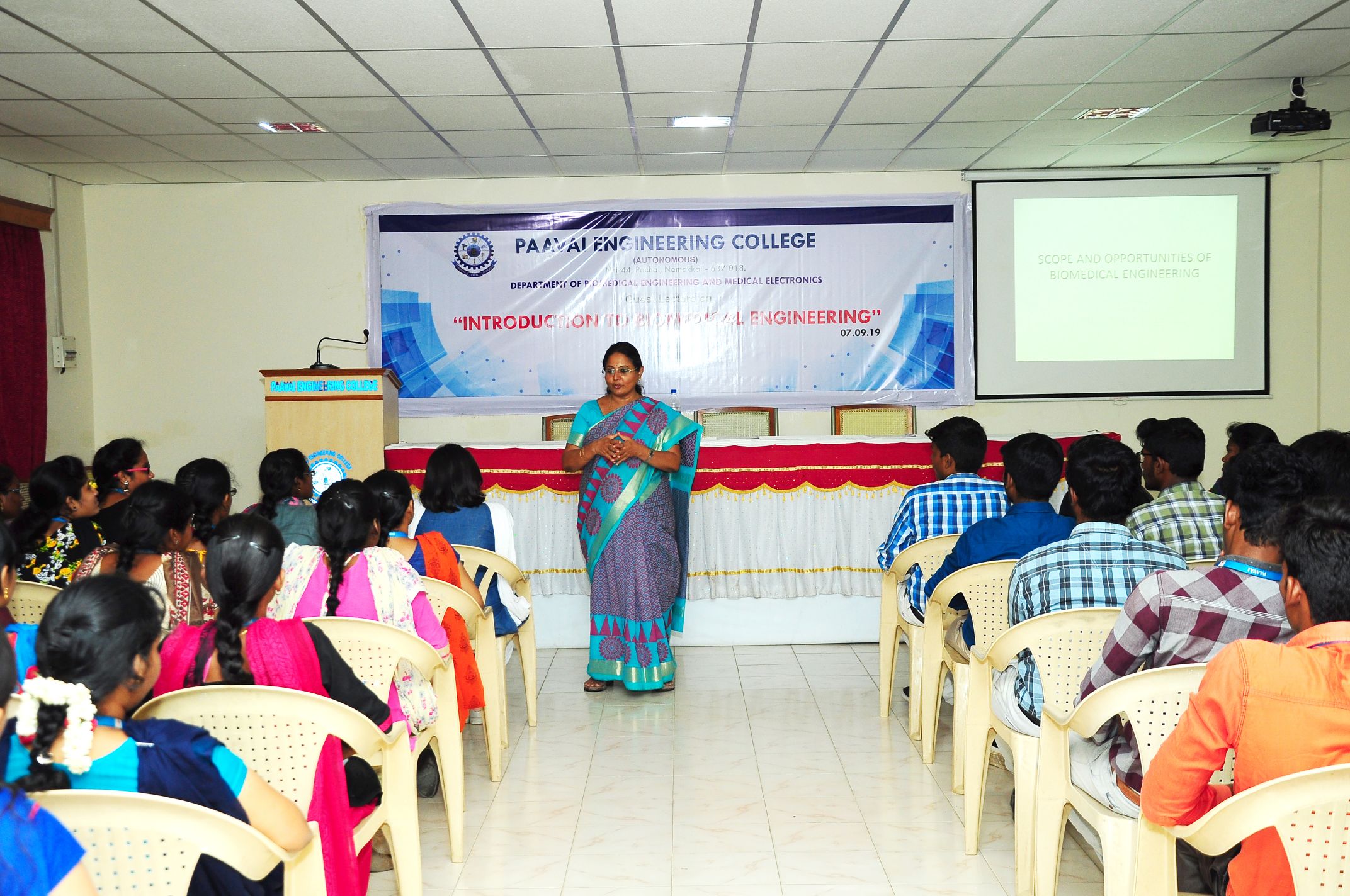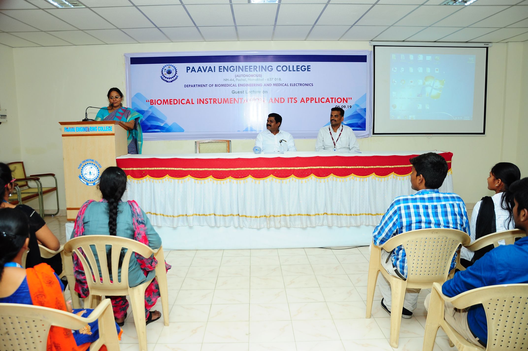 The Department of Biomedical Engineering and Medical Electronics was organized an Industry guest lecture program on the title of “Scope and Opportunities of Biomedical Engineering”. The session was inaugurated at 1.30 p.m. by Dr.M.Prem Kumar Principal, in the presence of Head of the department – Biomedical Engineering and Medical Electronics, faculty members and the participants from departments of Biomedical Engineering and Medical Electronics. In his Presidential Address, the Principal highlighted the importance of the latest technology. The keynote address was given by the guest speaker Dr.S.Mangai, Professor and Head, Department of Biomedical Engineering, Velalar college of Engineering and Techonology, Erode. He expressed his sincere gratitude to the College for their support. He expressed his experience to a student which gave him confidence to face the interviews in worldwide outside the campus. The session was carried over on the title “Scope and Opportunities of Biomedical Engineering”. He shared the information about the importance of the medical engineering students in the companies. He told the student to Pay attention, give the speaker your undivided attention and acknowledge the message. Then he noted the various scope and opportunities in the various environments in the working area of medical engineering. The encouragement was given to all the students to participate in all the trainings in companies. Hospitals and in research areas. He gave the positive motivation to all the students to work at with a positive vibration. He rendered his heartfelt thanks to the Management, Head of the Department – Biomedical Engineering and Medical Electronics and the faculty members. Mr.M.Rajesh, second year Biomedical Engineering, welcomed the gathering. The chief guest introduction was performed by Ms.V.Sathya Priya second year Biomedical Engineering. Master of ceremony was organized by ms.V.Vasunthera Medical Electronics. The session ended around 4:30 p.m. with the vote of thanks proposed by Mr.S.Keerthana, second year Medical Electronics.