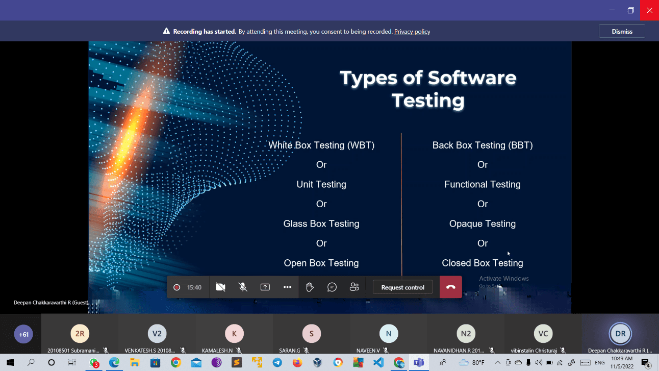 Department of Mechatronics of Paavai Engineering College organized an alumni guest lecture on the topic “Software Testing (Manual Testing)” held on 05/11/2022 in online mode. It was aimed at disseminating knowledge to students about the principles and types of software testing. The welcome address was given by R. Navanidhan III-MCT. Mr.R. Deepan Chakkaravarthi, Software Test Engineer, Tata Consultancy Service, Bangalore was the resource speaker. Naveen V, III-MCT introduced the resource speaker.