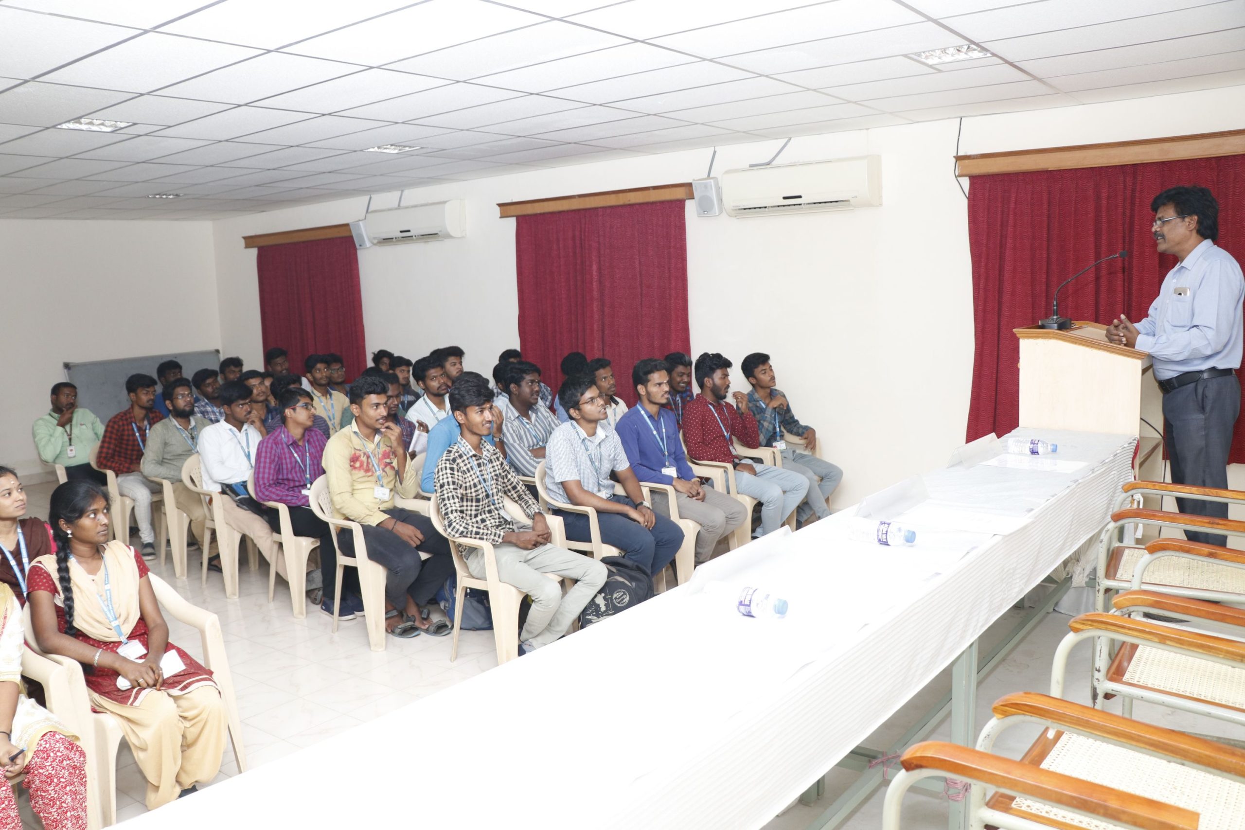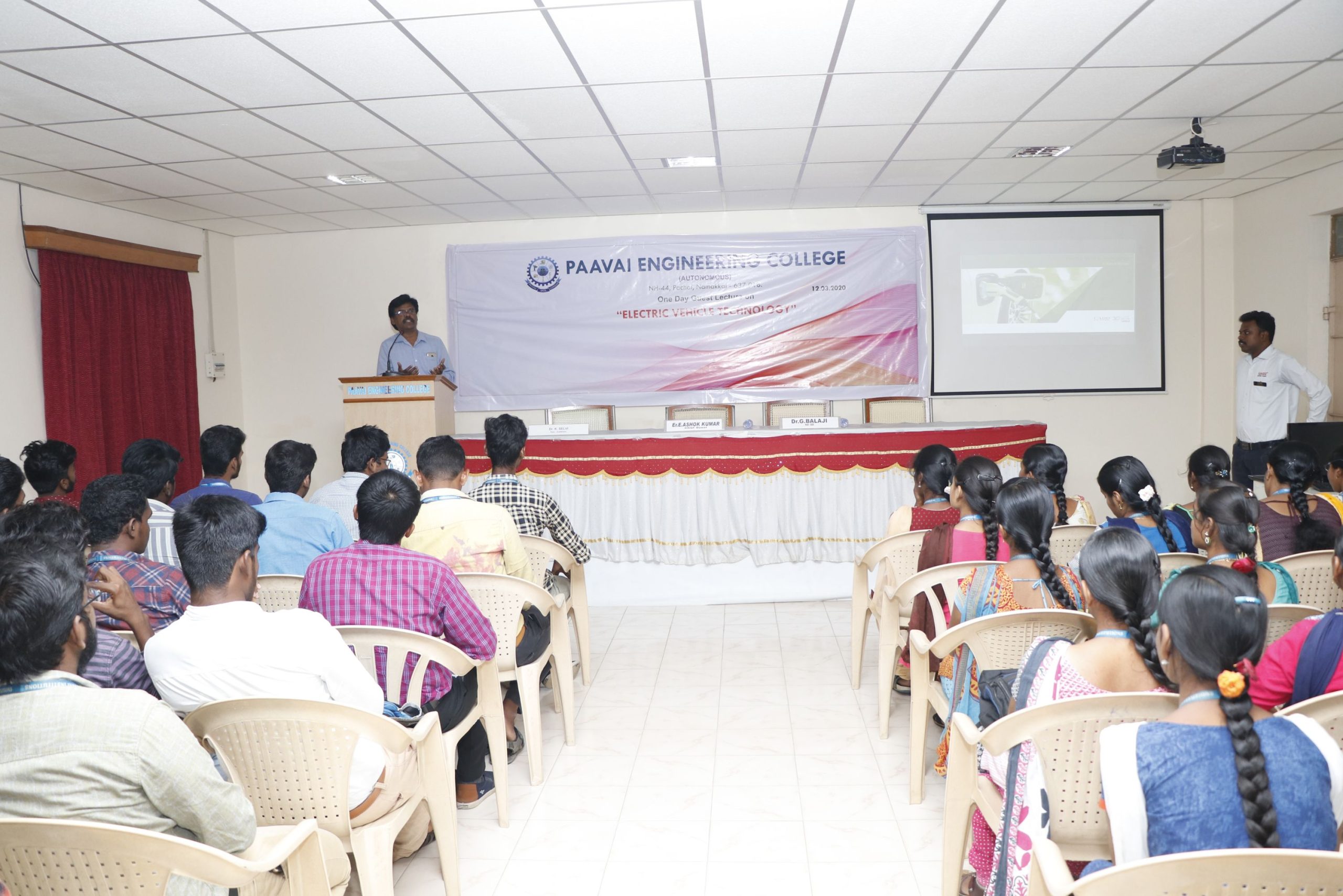 The Department of EEE, Paavai Engineering College has conducted a one day guest lecture on the title, ELECTRIC VEHICLE TECHNOLOGY on 12.03.2020. Dr.K.Selvi, Dean Academics, Paavai Engineering College presided over the function and insisted the students to consider this kind of guest lecture as a forum to gain knowledge on the various technology for becoming effective electrical engineers. Mr.E.Ashok Kumar, CADD Center Manager, Rasipuram was the chief guest. In his lecture, he explained briefly about Electric Vehicle Technology which is an evolving technology in recent trends. He explained the various types, working modules of electric vehicles and made a comparison between the IC engine and the IOT based electric vehicle. He also clarified the job roles of electrical engineers in the automobile domain. He defined about the Battery Management System [BMS] of the electric vehicle and its importance in the economic aspect over the conventional vehicle systems. He enriched the students with the courses related to EV Technology. Ms.N.Janani of Final year EEE welcomed the gathering and Ms.G.Nalina Devi of third year EEE proposed the vote of thanks.