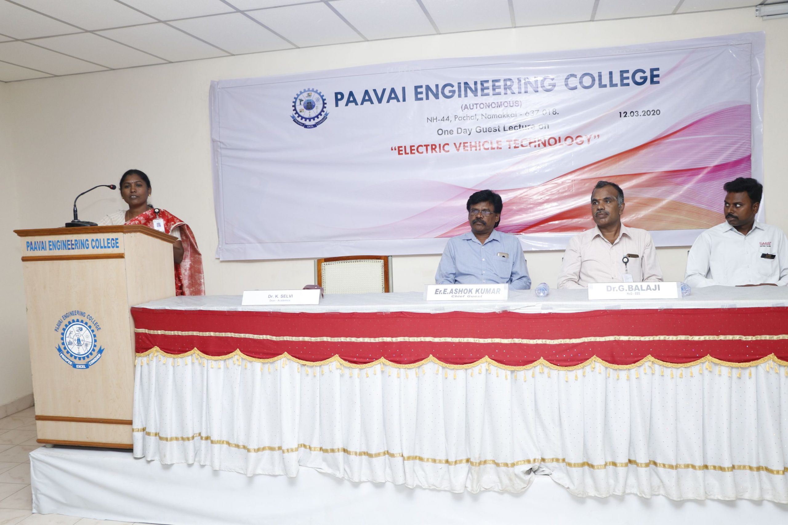 The Department of EEE, Paavai Engineering College has conducted a one day guest lecture on the title, ELECTRIC VEHICLE TECHNOLOGY on 12.03.2020. Dr.K.Selvi, Dean Academics, Paavai Engineering College presided over the function and insisted the students to consider this kind of guest lecture as a forum to gain knowledge on the various technology for becoming effective electrical engineers. Mr.E.Ashok Kumar, CADD Center Manager, Rasipuram was the chief guest. In his lecture, he explained briefly about Electric Vehicle Technology which is an evolving technology in recent trends. He explained the various types, working modules of electric vehicles and made a comparison between the IC engine and the IOT based electric vehicle. He also clarified the job roles of electrical engineers in the automobile domain. He defined about the Battery Management System [BMS] of the electric vehicle and its importance in the economic aspect over the conventional vehicle systems. He enriched the students with the courses related to EV Technology. Ms.N.Janani of Final year EEE welcomed the gathering and Ms.G.Nalina Devi of third year EEE proposed the vote of thanks.