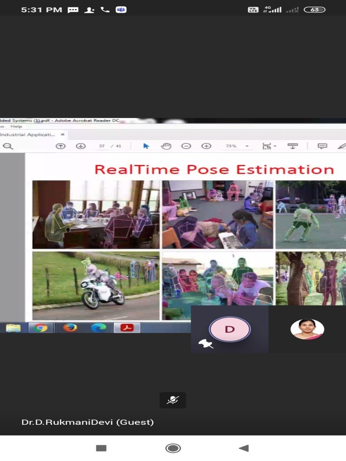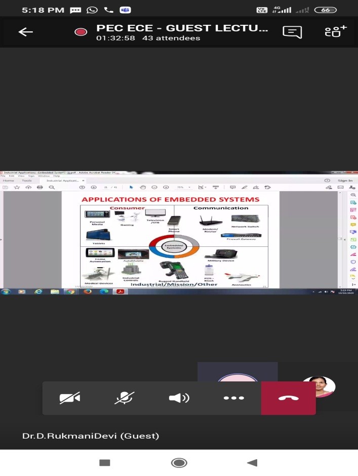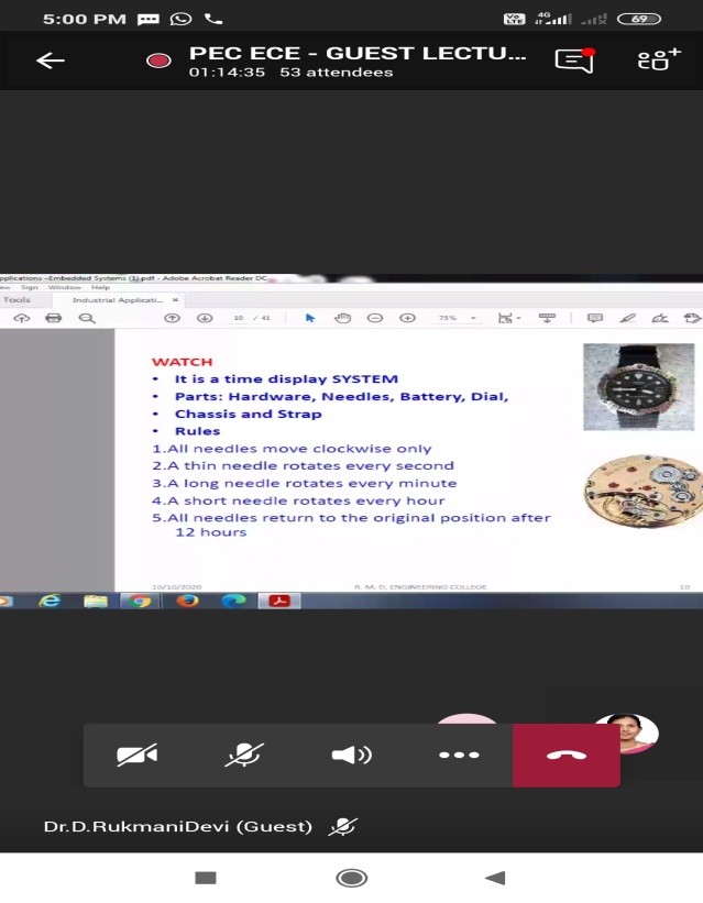 The Department of Electronics and Communication Engineering, Paavai Engineering College (Autonomous) had organized an online guest lecture on “INDUSTRIAL APPLICATIONS OF EMBEDDED SYSTEMS” on 10th October 2020. Dr.R.Mohana Priya, Associate Professor ECE gave the welcome note. Ms.Supraja from Third year ECE introduced the Chief Guest Dr.D.Rukmani Devi, Professor,ECE,R.M.D Engineering College. In her lecture, she gave an introduction about Microprocessor and Microcontroller and the differences between the two. She also highlighted the importance of Embedded Systems and explained the various industrial applications such as Digital camera, Digital wall clock, washing machines and other applications. She also elucidated about Industrial automation and the operations involved in it such as the Integrated Network Smart transducer and Direct Torque control. In addition, she also explained the real time pose estimation for different applications. She also clarified various queries posted by the students at the end of the session. The vote of thanks was proposed by Mr.Yuthan from Third year ECE.
