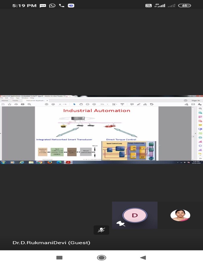 The Department of Electronics and Communication Engineering, Paavai Engineering College (Autonomous) had organized an online guest lecture on “INDUSTRIAL APPLICATIONS OF EMBEDDED SYSTEMS” on 10th October 2020. Dr.R.Mohana Priya, Associate Professor ECE gave the welcome note. Ms.Supraja from Third year ECE introduced the Chief Guest Dr.D.Rukmani Devi, Professor,ECE,R.M.D Engineering College. In her lecture, she gave an introduction about Microprocessor and Microcontroller and the differences between the two. She also highlighted the importance of Embedded Systems and explained the various industrial applications such as Digital camera, Digital wall clock, washing machines and other applications. She also elucidated about Industrial automation and the operations involved in it such as the Integrated Network Smart transducer and Direct Torque control. In addition, she also explained the real time pose estimation for different applications. She also clarified various queries posted by the students at the end of the session. The vote of thanks was proposed by Mr.Yuthan from Third year ECE.
