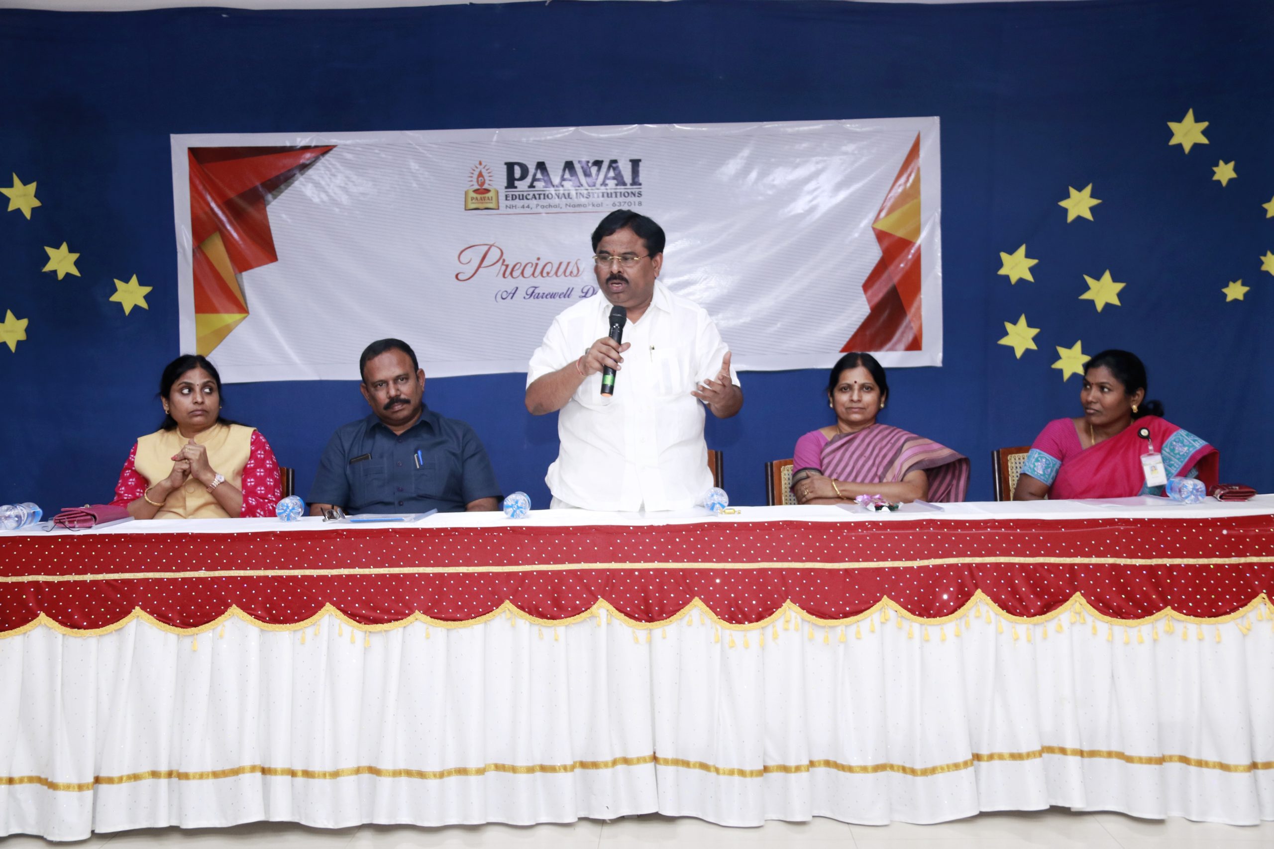 The Farewell function for the final year students, Paavai Institutions, was held on 10th April 2019 at Pragathi Hall by 5.30p.m. Shri.CA.N.V.Natarajan, Chairman, Paavai Institutions, presided over the function. The function started with a Prayer song. Ms.R.Sweshika II-ECE welcomed the gathering. The chairman delivered his Presidential Address and he expressed his happiness by witnessing growth of the students as well matured in their behaviour. He pointed out that students learned many things in their college days apart from the academics such as handling situations, proper planning and decision making etc. He blessed and wished the students to be successful in their career and personal life. Smt.N.Mangai Natarajan, Correspondent, Paavai
