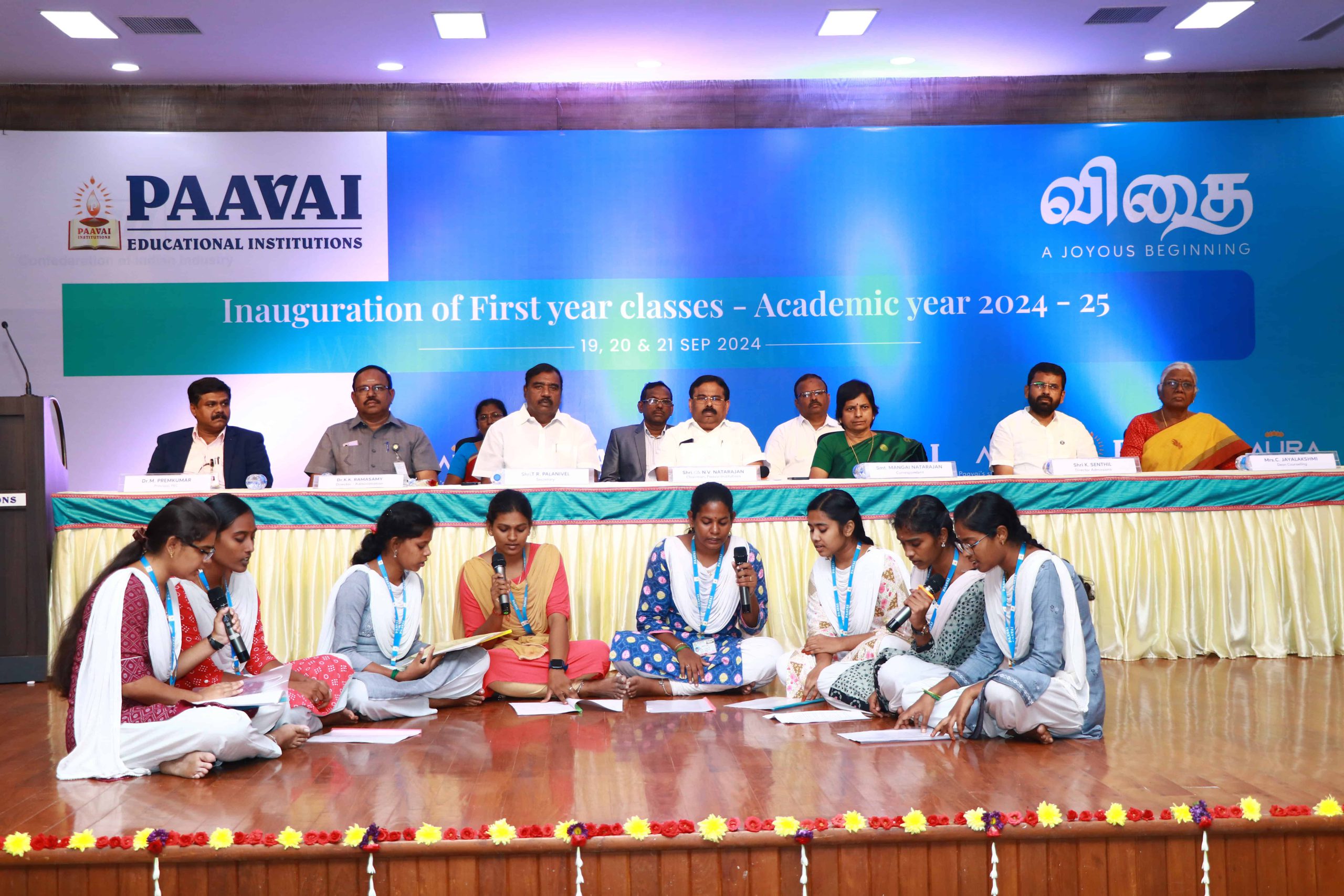 The inauguration ceremony for the first-year classes of engineering students for the 2024-2025 academic year at Paavai Engineering Colleges was held. The event began with an invocation and the Tamil Thaai Vaazhthu (a Tamil song of praise). Shri CA N.V. Natarajan, the Chairman of Paavai Educational Institutions, presided over the function. Dr. K.K. Ramasamy, the Director (Administration), delivered the welcome address and greeted everyone.