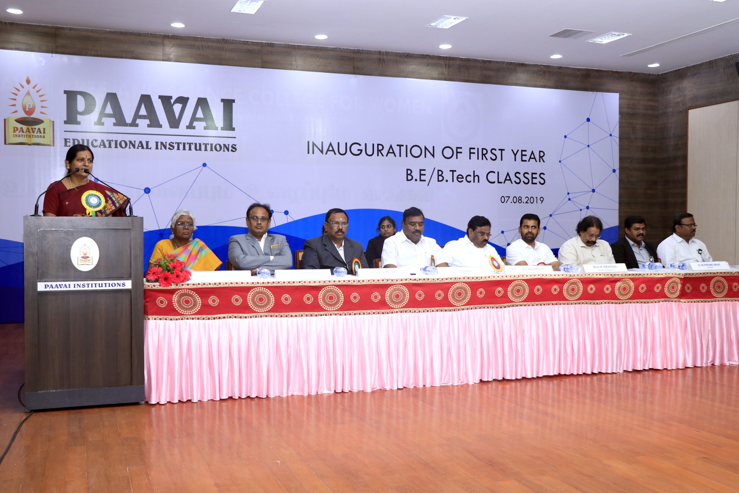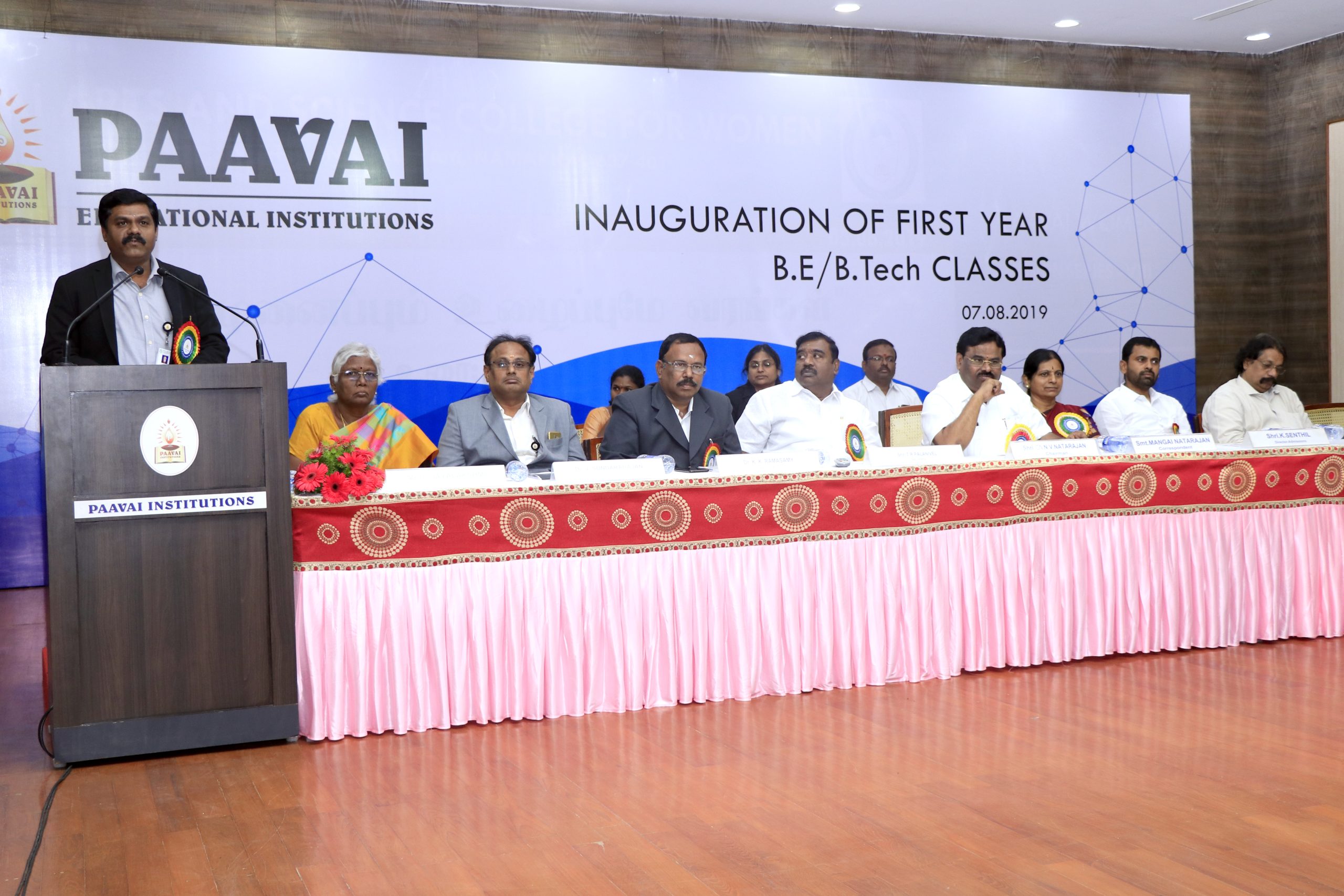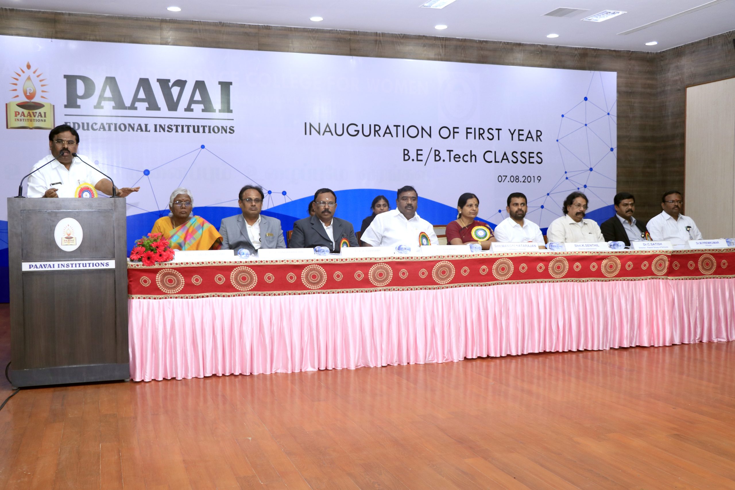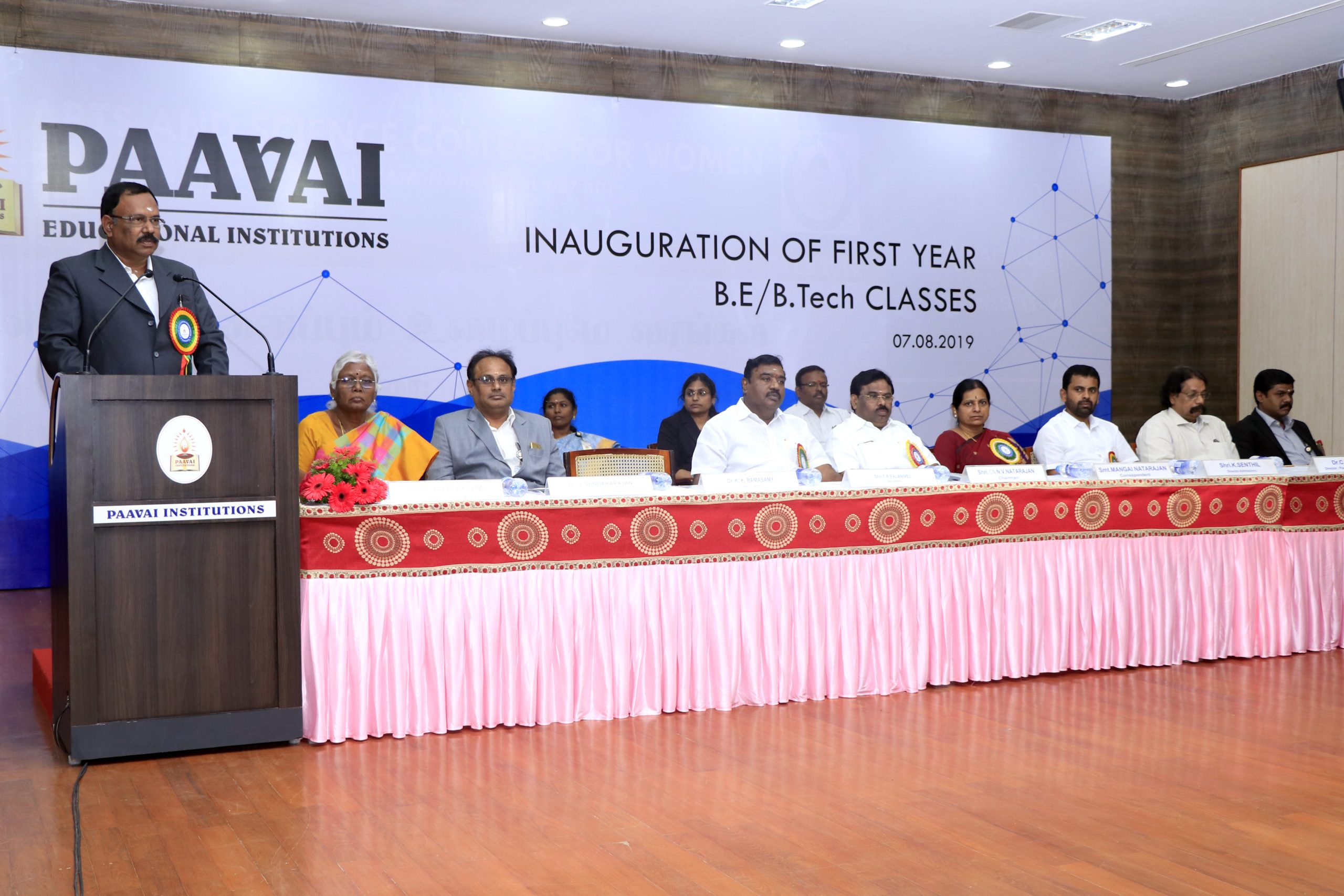 Paavai Educational Institutions Pachal, Namakkal. Conducted Inauguration for first year classes of Paavai Educational Institutions comprising of Paavai Engineering College , Paavai College of Engineering and Pavai College of Technology for the academic year 2019 – 2020 was started with the blessings of almighty on 07/08/2019. The Chairman of Paavai Educational Institutions Auditor Mr N.V. Natarajan presided over the function. Director Administration of Paavai Educational Institution Dr.K.K.Ramaswamy proposed the welcome address to the gathering. The Correspondent of Paavai Institutions Mrs,Mangai Natarajan inaugurated the function by lighting the Kuthu Villaku. The Chairman Auditor Mr N.V. Natarajan hoisted the Paavai flag and inaugurated the Classes for the first year students. In his presidential address he stated that, “Paavai educational institutions are student-centered and it functions as a guiding light for Students lives. He also mentioned that self-control is one of the most important components which help the students to reach their success and the value of time. He also emphasized that spending such precious time in the social media will do no good to us and he gave awareness about the security issues that we may have to face by using social media. The teachers of Paavai Institutions can explore the talents of students and mold them in to achievers, the administration is also committed to it. Therefore, students should take the guidance of teachers and make good use of their technology to improve their lives, only when they are doing well in college, they will be able to find a better job in the future. There are plenty of careers in engineering, only a shortage of qualified engineers. For example, engineers are referred to as the mother of innovation. The astronauts who designed the spacecraft, the Chandrayaan-2, are also engineers. So there is no doubt that student can become good engineers and go on to do good work as they develop their individuality and innovation skills. Every parent should be concerned with the welfare and education of their children. The five faces of flames indicate the parents, students, teachers, administration and the society, only when all the faces shines together can get a brighter future of India. Then the principals and the Head of the Departments of all the colleges were introduced. Mrs. Mangai Natarajan felicitated the gathering. Then, Padhapooja was done by students to their parents. The Principal of Paavai Engineering College Dr.M. Premkumar delivered the vote of thanks. Finally the ceremony concluded, on the occasion of Paavai educational institutions. The Secretary D. R. Palanivel, Director Administration Dr K. K. Ramasamy, Director Admission Mr. K.Senthil, principals, Heads, professors, first-year students and their parents were present over there.