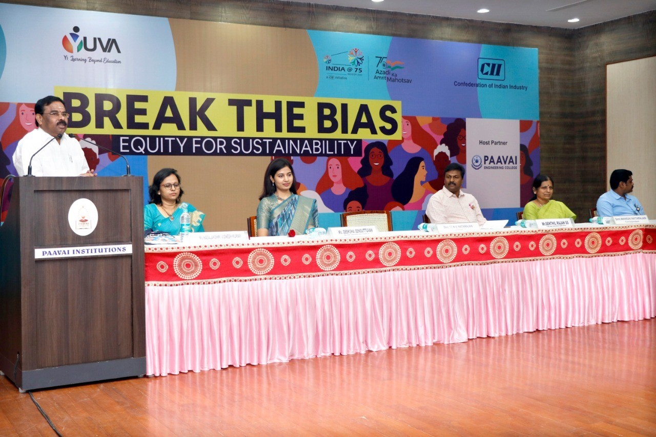 Commemorating International Women’s Day, a special address on “Break the Bias” was conducted in Paavai Institutions on 8th March 2022 at 11.00 a.m. in Anandha Arangam on behalf of Young Indian, Salem Chapter. The programme commenced with the prayer song. Shmt.Mangai Natrajan, Correspondent of Paavai institutions along with the dignitaries inaugurated the programme by lighting the kuthuvilaku.