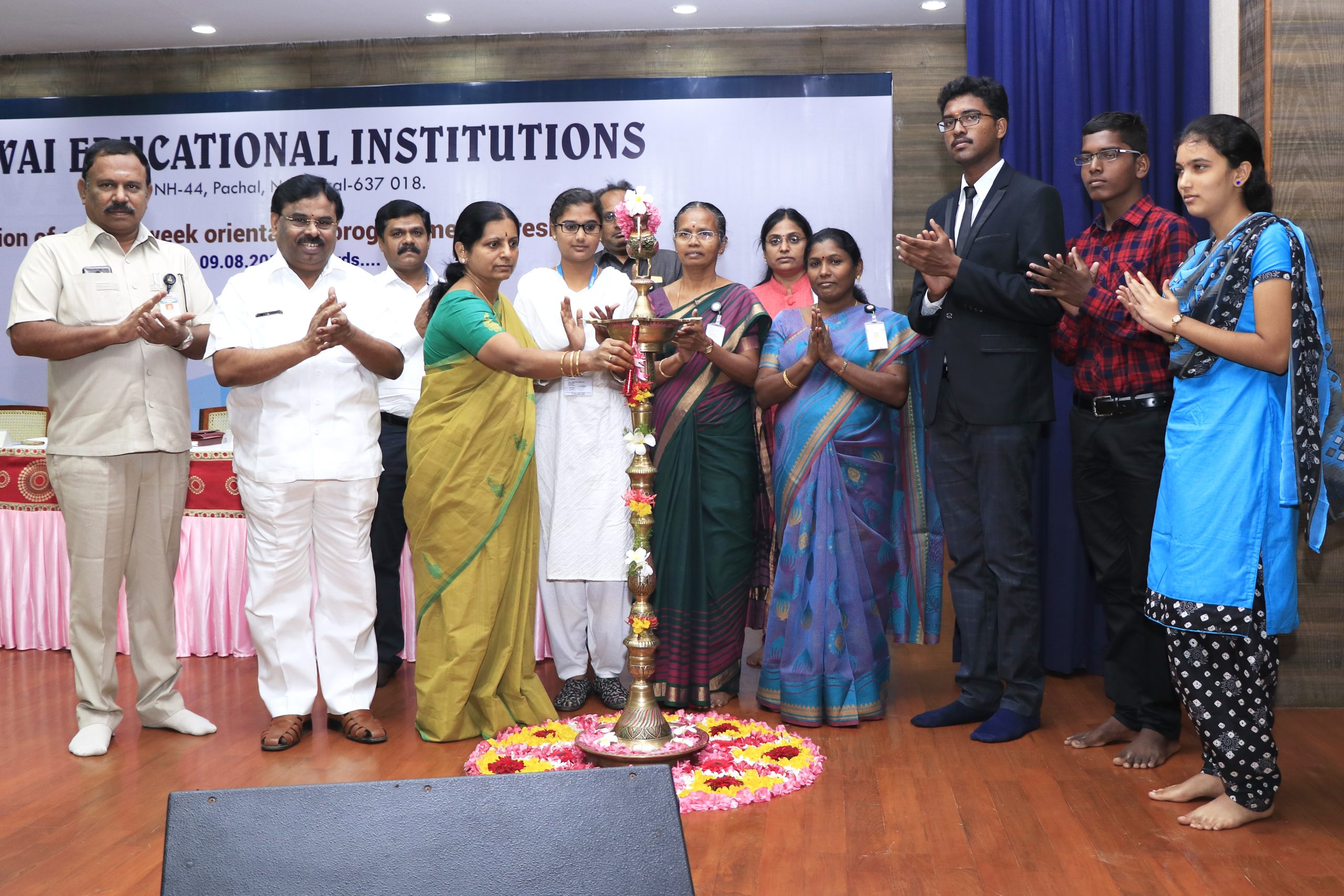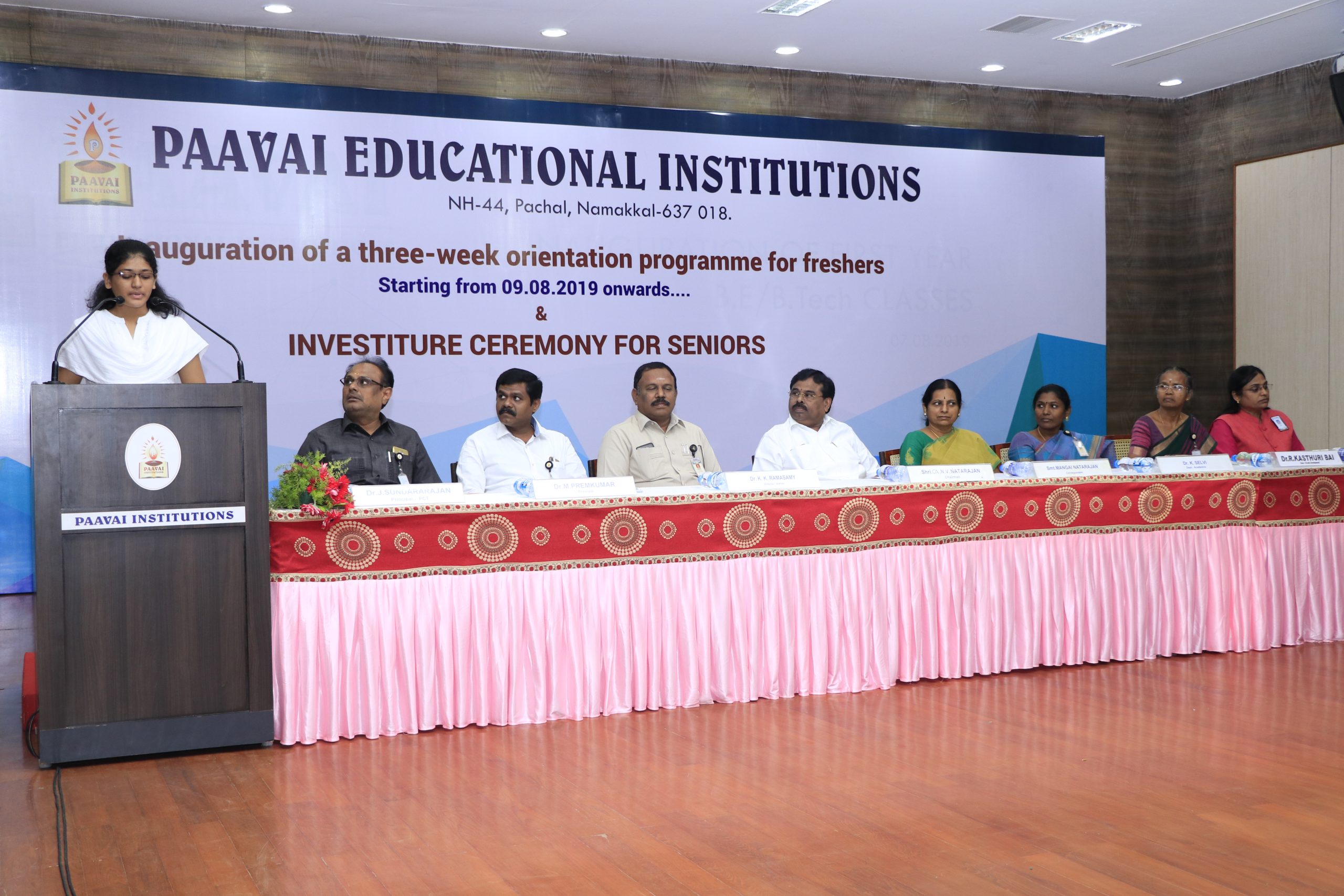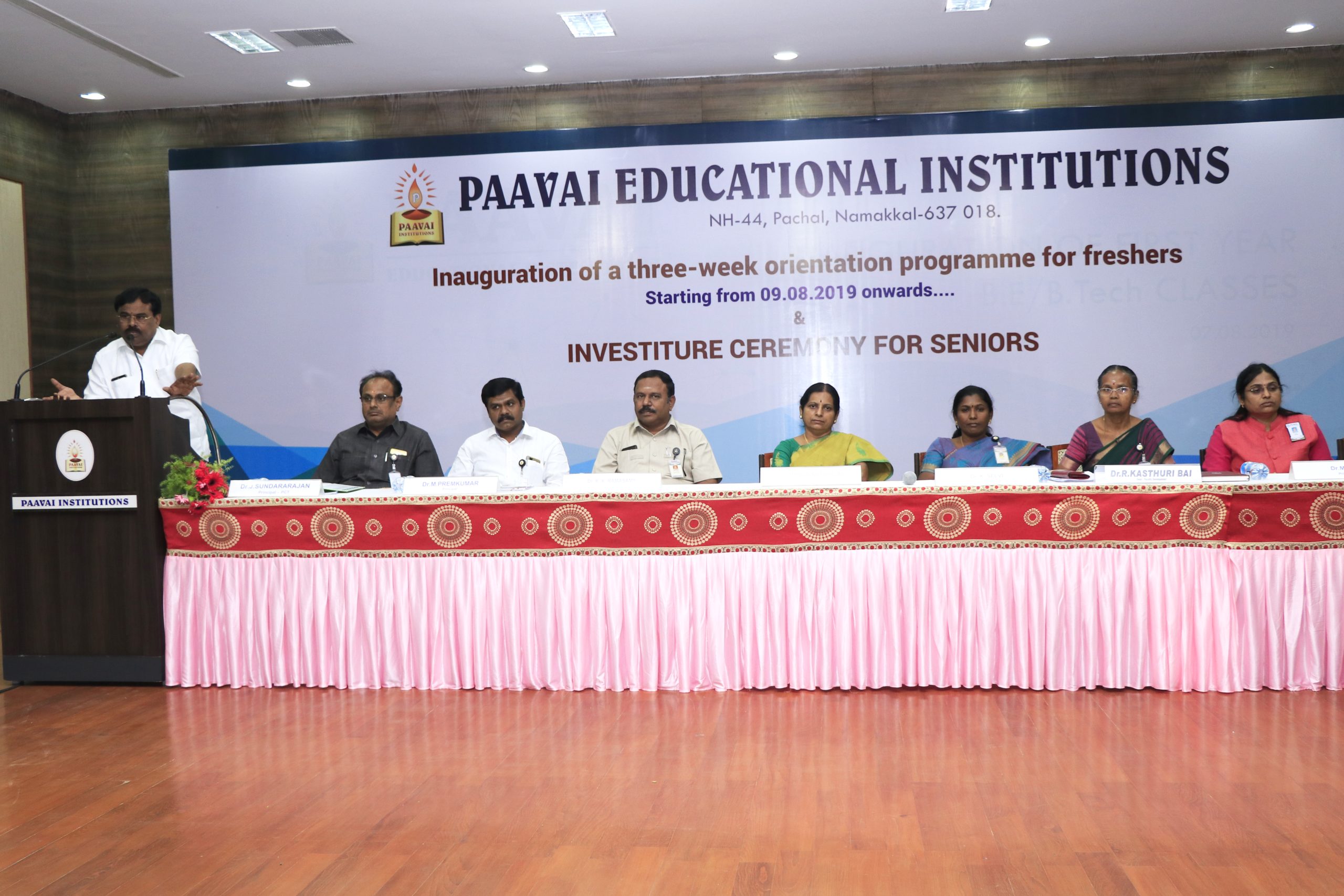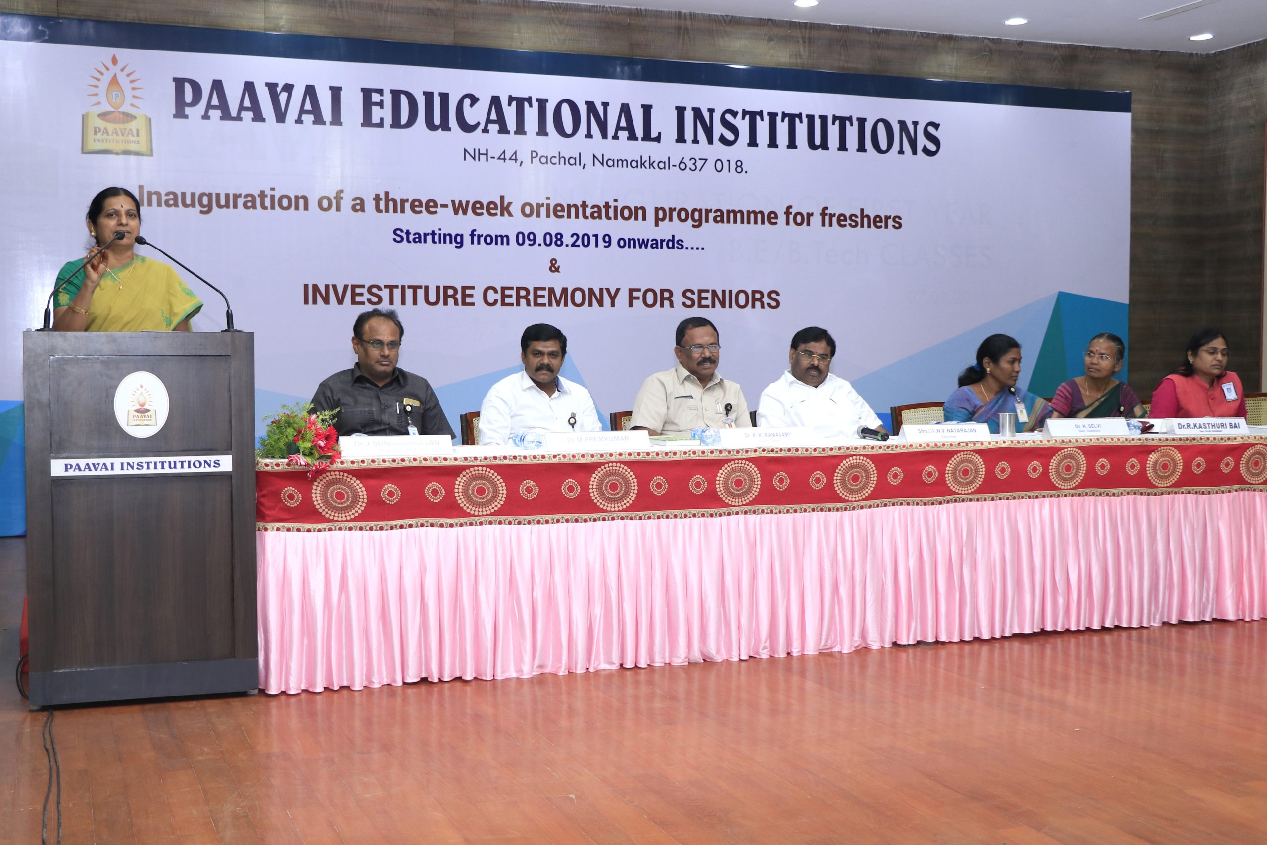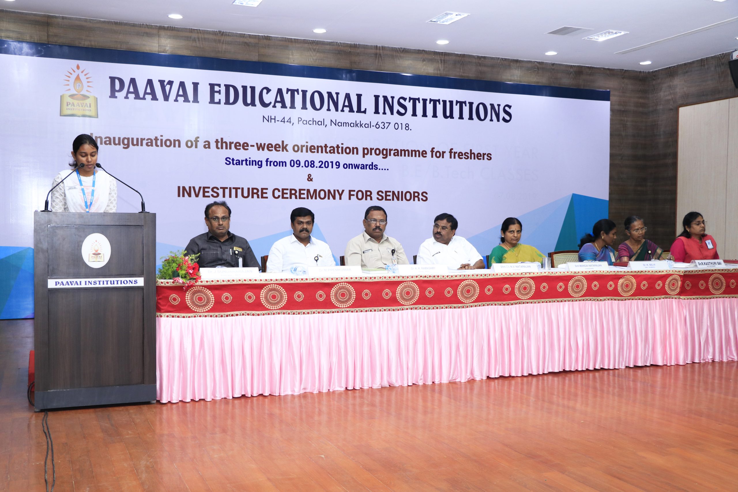 Paavai Institutions organized an Investiture Ceremony for senior students of Paavai Engineering colleges on 09.08.2019 at ANANDHA ARANGAM, Paavai Engineering College. Presiding over the function Shri.CA N.V.NATARAJAN greeted the members of various committees such as Discipline committee, Cultural committee, Communication committee, Gardening committee, Event committee, Prayer committee, Temple committee, Health & Hygiene committee and Hostel committee consisting of members from Paavai Engineering College, Paavai College of Engineering, and Paavai College of Technology. He honoured the captains with badge and solemnised the appointment. He also administered the oath which stated that “the leader will discharge their duties without fear or favour and also that they will not do anything which demeans their appointment or lessen the image of the institution”. The first year students were given opportunity to come on to the stage to recite Paavai slogans “Healthy Paavai! Wealthy Paavai! Powerful Paavai! ” Following the recital of Paavai slogans, ’Paavai procedure’ had been read out both in English and Tamil. The procedure entails “When we try and try, we will see the determined progress”. Hence the progress is due to one’s continuous and constant efforts. After this, Chairman delivered his inaugural address describing the various characteristics of the leaders and the responsibilities. He said “A captain should be exemplary at all times”. There must be a goal for the leaders and ceaseless effort is necessary to achieve that goal. The captain must always encourage himself and also execute various tactics and techniques to motivate others too. The main quality for the captain is that, he must have courage, confidence, ability to handle challenges easily, honest thoughts and ability to make decisions according to the situations under any circumstances, the desire to know anything deeper in order to reach the goal. Equally it is important to have qualities such as passion, devotion, modesty, humanity, compassion, empathy and effective communication. The Chairman highlighted incident from the lives of great leaders like Karmavirar Kamarajar, Dr A.P.J.Abdul Kalam saying that “Every leader should be on the path that no one has travelled and create the path for the followers”. After the inaugural address, Mrs MANGAI NATARAJAN, the Correspondent, Paavai Institutions felicitated the gathering. She reiterated the accountability and responsibility of a leader and concluded that self-esteem, self-confidence, self-management and professionalism in every walk of life will bring joy, peace and prosperity. She pointed out that, proper direction and good inspiration will help everyone to reach their destination. Earlier the correspondent led the lighting of the Kuthuvilakku along with the dignitaries on the dias. Directors, Deans and Principal graced the occasion. CHERUB EBENEZER, first year ECE of Paavai Engineering College welcomed the audience and SANDRA ELIZABETH, Second year Biomedical of Paavai Engineering College proposed the vote of thanks.