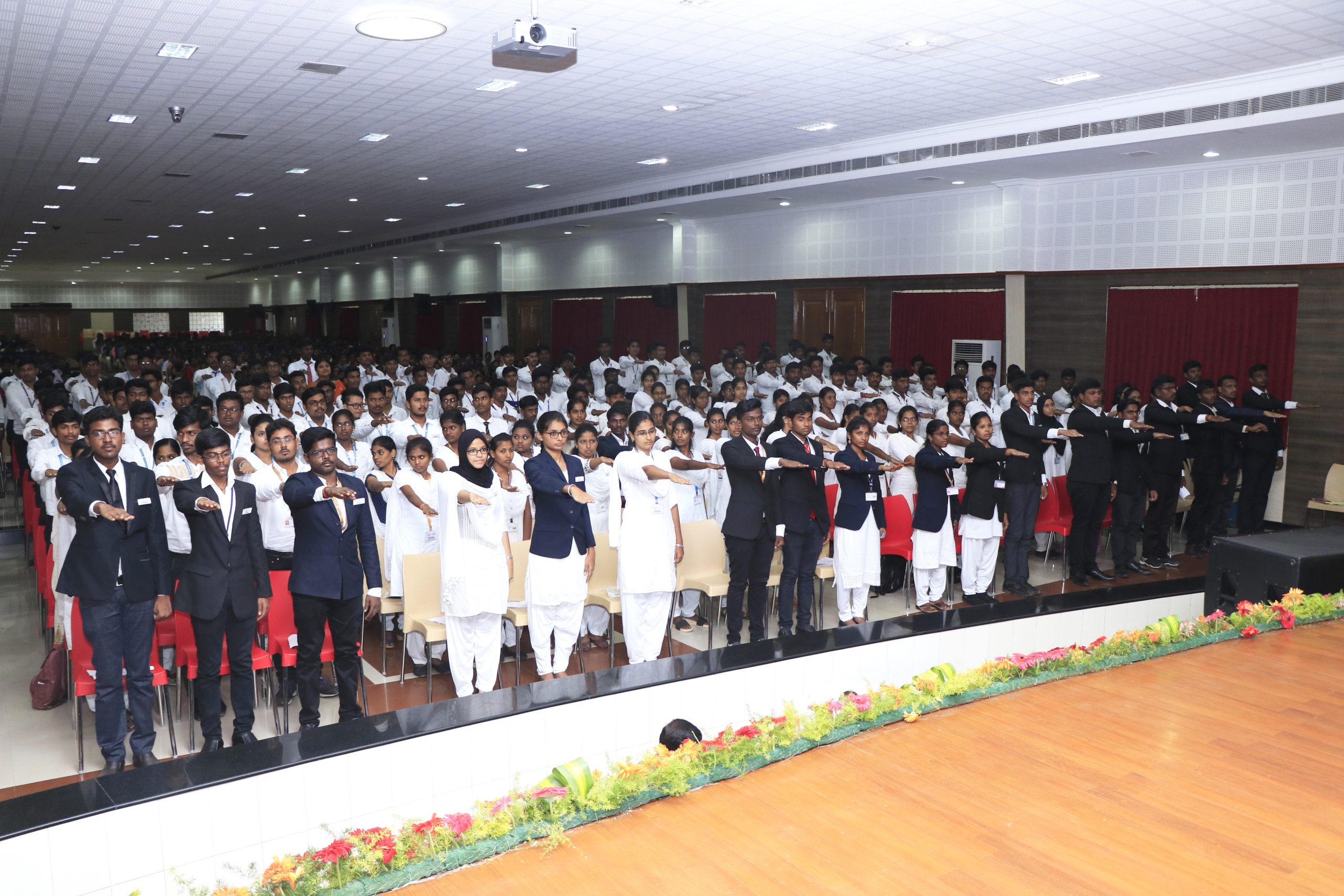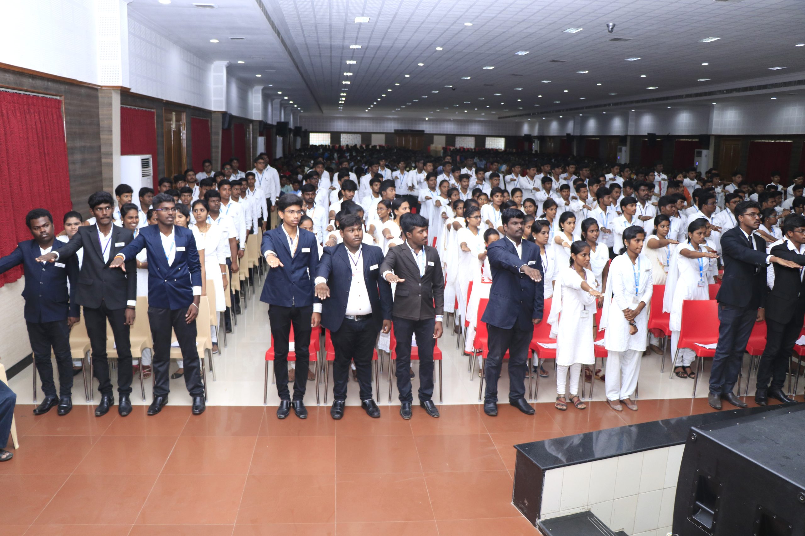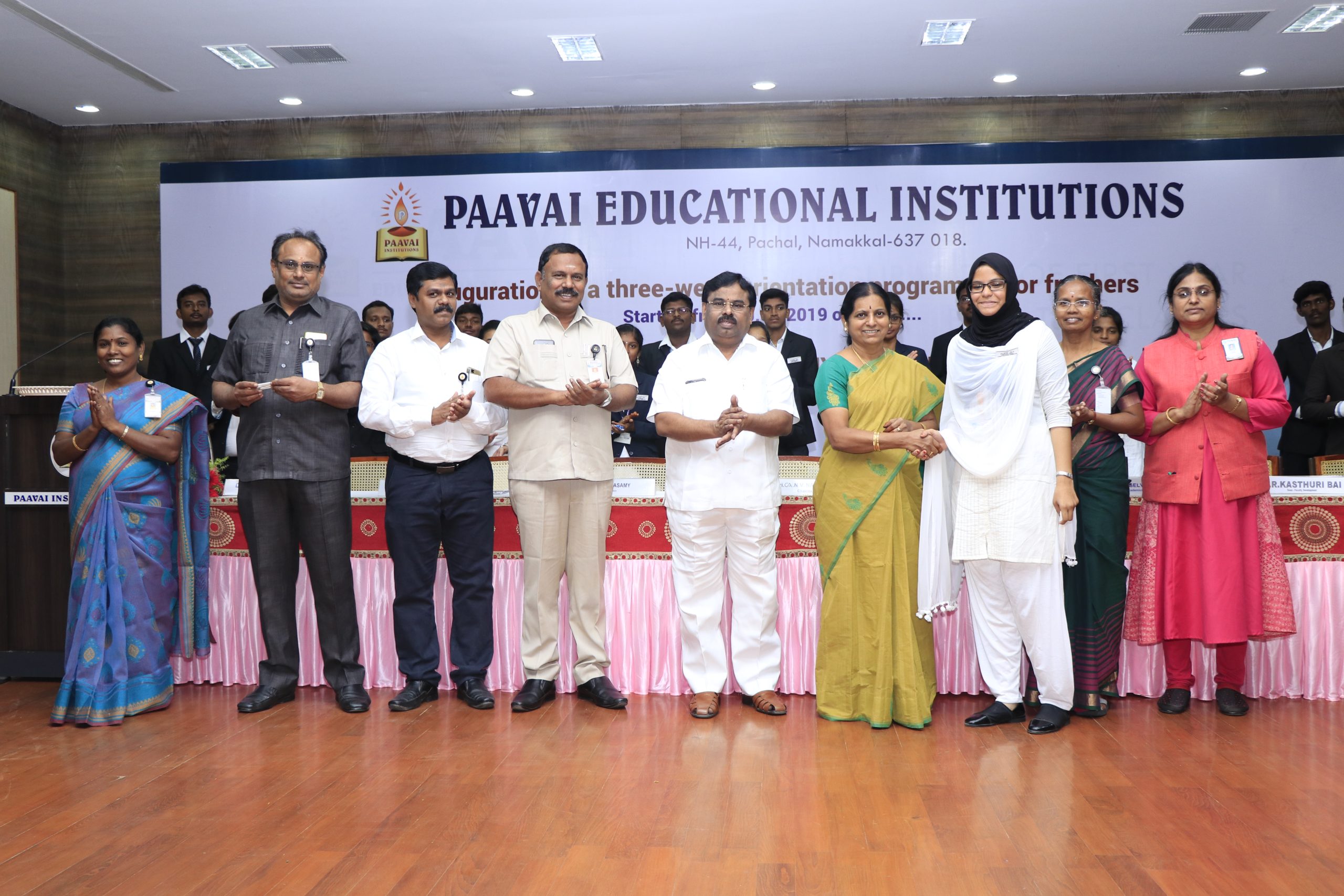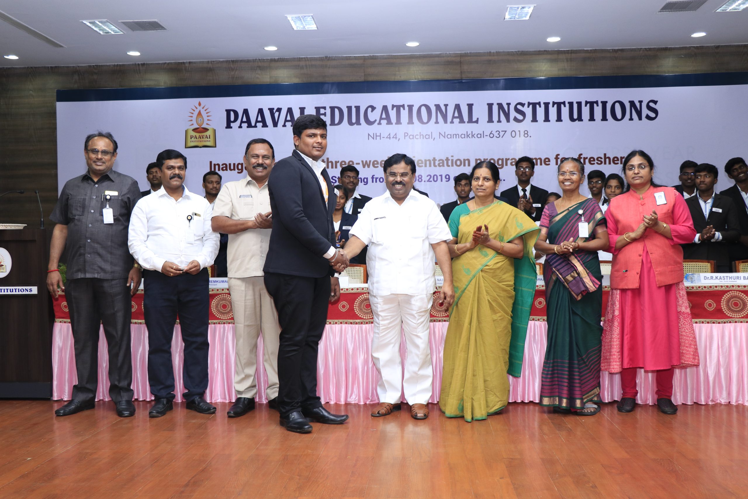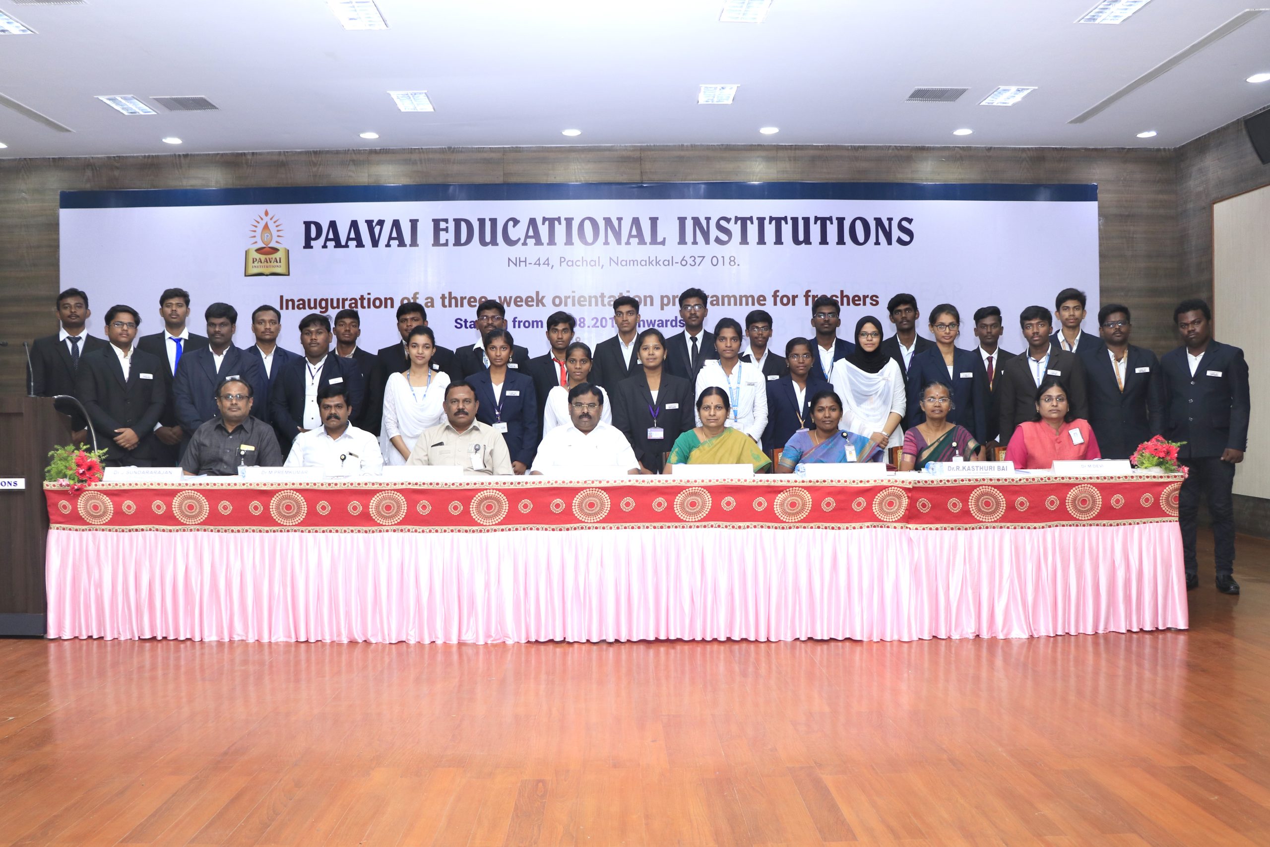 Paavai Institutions organized an Investiture Ceremony for senior students of Paavai Engineering colleges on 09.08.2019 at ANANDHA ARANGAM, Paavai Engineering College. Presiding over the function Shri.CA N.V.NATARAJAN greeted the members of various committees such as Discipline committee, Cultural committee, Communication committee, Gardening committee, Event committee, Prayer committee, Temple committee, Health & Hygiene committee and Hostel committee consisting of members from Paavai Engineering College, Paavai College of Engineering, and Paavai College of Technology. He honoured the captains with badge and solemnised the appointment. He also administered the oath which stated that “the leader will discharge their duties without fear or favour and also that they will not do anything which demeans their appointment or lessen the image of the institution”. The first year students were given opportunity to come on to the stage to recite Paavai slogans “Healthy Paavai! Wealthy Paavai! Powerful Paavai! ” Following the recital of Paavai slogans, ’Paavai procedure’ had been read out both in English and Tamil. The procedure entails “When we try and try, we will see the determined progress”. Hence the progress is due to one’s continuous and constant efforts. After this, Chairman delivered his inaugural address describing the various characteristics of the leaders and the responsibilities. He said “A captain should be exemplary at all times”. There must be a goal for the leaders and ceaseless effort is necessary to achieve that goal. The captain must always encourage himself and also execute various tactics and techniques to motivate others too. The main quality for the captain is that, he must have courage, confidence, ability to handle challenges easily, honest thoughts and ability to make decisions according to the situations under any circumstances, the desire to know anything deeper in order to reach the goal. Equally it is important to have qualities such as passion, devotion, modesty, humanity, compassion, empathy and effective communication. The Chairman highlighted incident from the lives of great leaders like Karmavirar Kamarajar, Dr A.P.J.Abdul Kalam saying that “Every leader should be on the path that no one has travelled and create the path for the followers”. After the inaugural address, Mrs MANGAI NATARAJAN, the Correspondent, Paavai Institutions felicitated the gathering. She reiterated the accountability and responsibility of a leader and concluded that self-esteem, self-confidence, self-management and professionalism in every walk of life will bring joy, peace and prosperity. She pointed out that, proper direction and good inspiration will help everyone to reach their destination. Earlier the correspondent led the lighting of the Kuthuvilakku along with the dignitaries on the dias. Directors, Deans and Principal graced the occasion. CHERUB EBENEZER, first year ECE of Paavai Engineering College welcomed the audience and SANDRA ELIZABETH, Second year Biomedical of Paavai Engineering College proposed the vote of thanks.