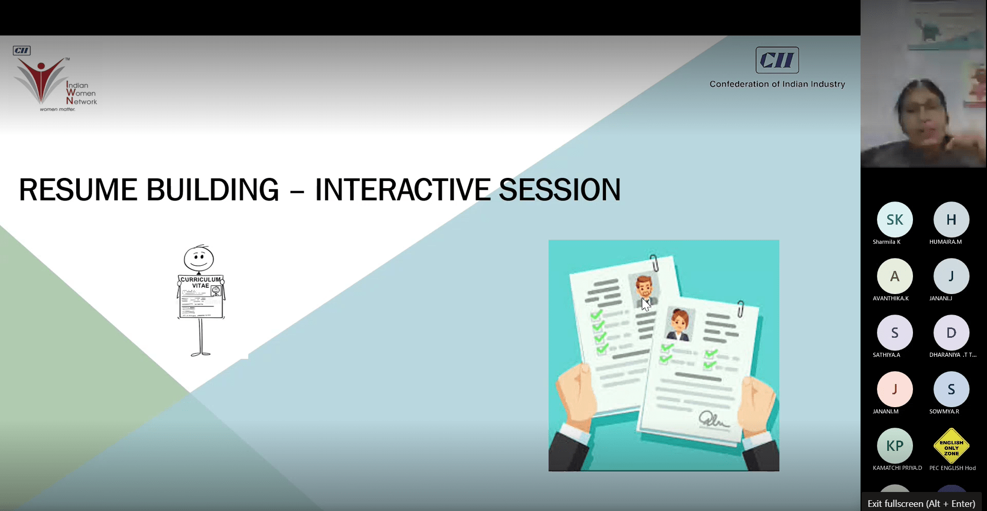 Paavai Engineering college along with CII-IWN(TN) conducted a webinar on “RESUME BUILDING”on 03.09.2022 (Saturday) for all third-year girls. The resource person of the day Ms. Rajeswari Natarajan appraised the students with the necessary sections a resume should contain and enlightened them about the importance of including their unique skill sets, contact details, education details with specificity etc., She also suggested the students do their SWOT analysis along with the help of the faculty members and create a Linkedin account and explained the importance of it. She also alerted the students with some Do’s and Don’ts to be followed in a resume. The students raised their queries and interacted with the resource person.