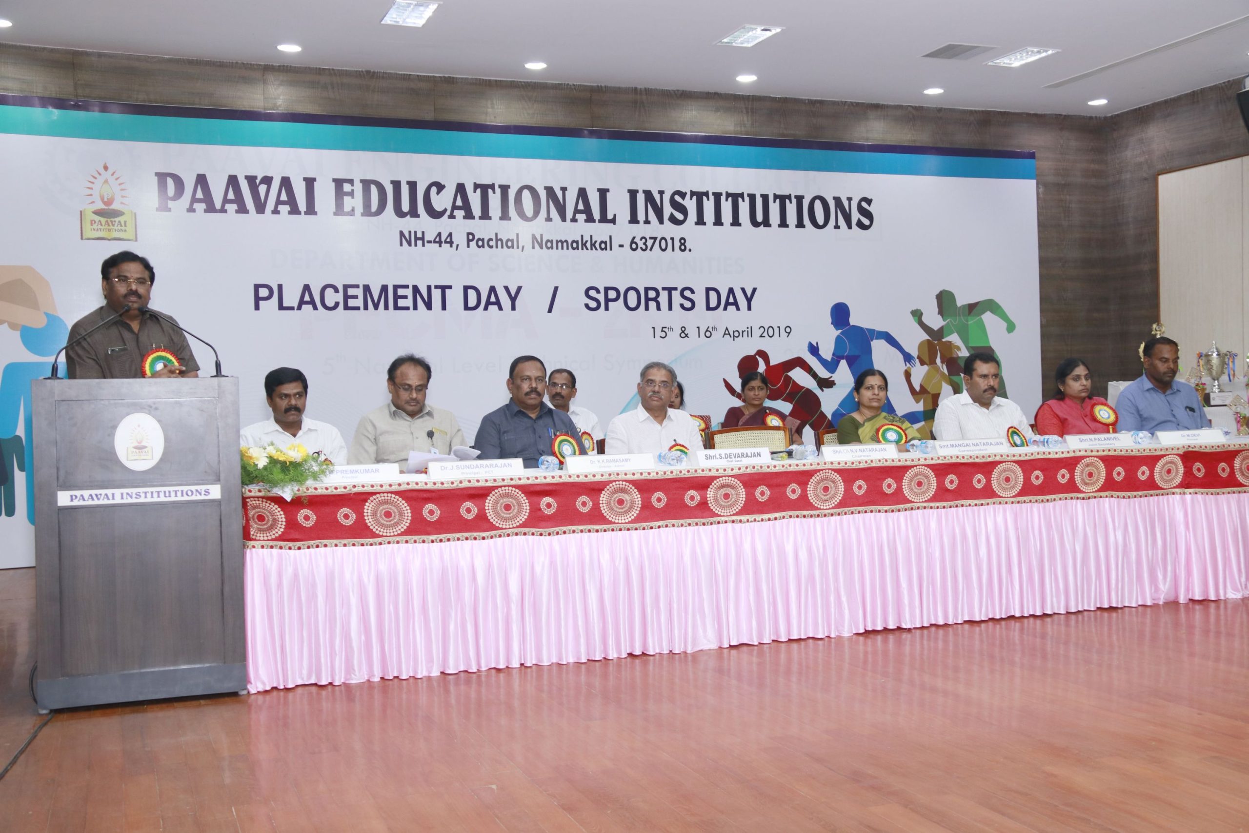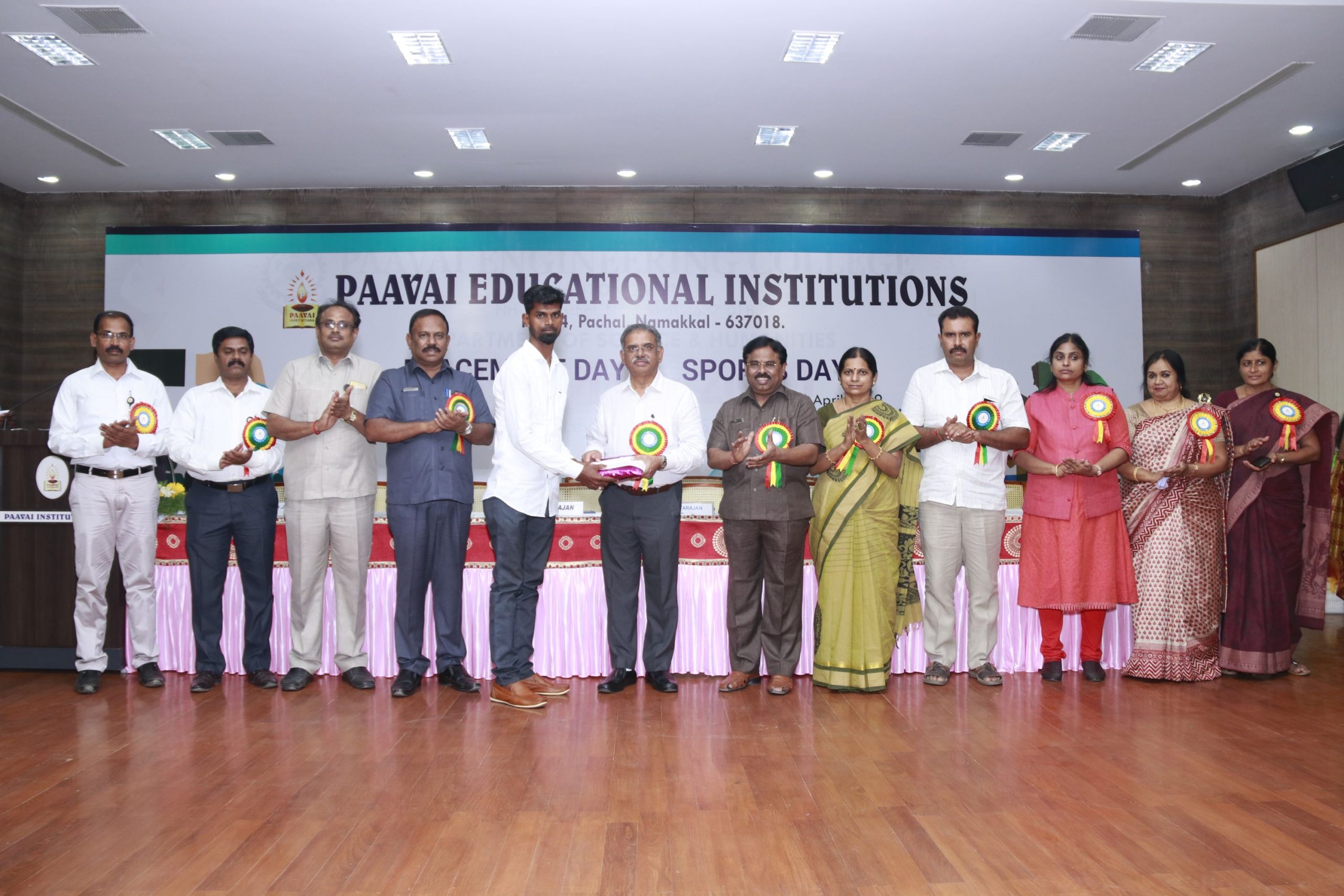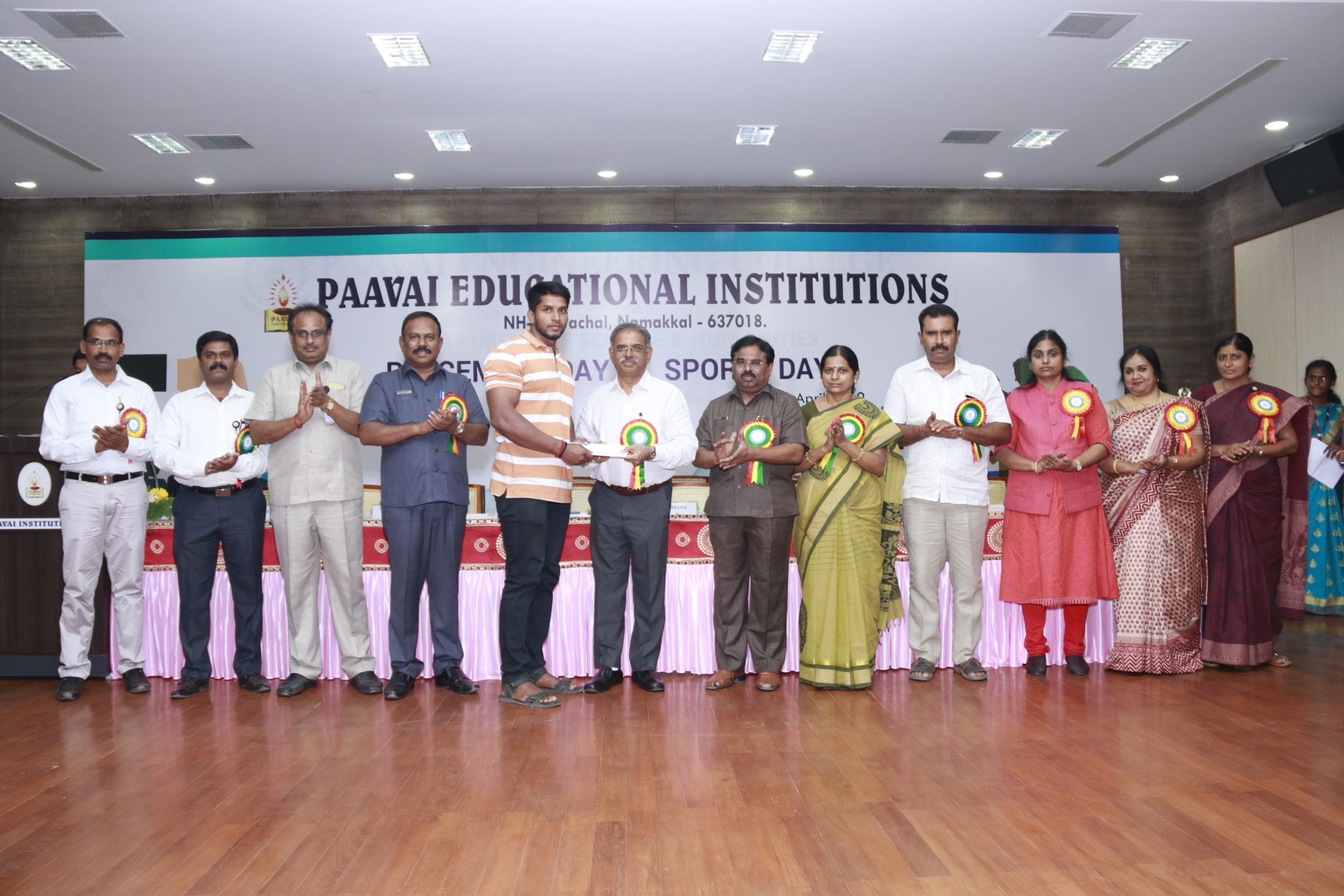 Paavai Institutions celebrated its Sports Day on 16th April 2019. Our C.A.N.V.Natarajan, Chairman, Paavai Institutions presided over the function and delivered the presidential address. The Managing Director and Chairman of Sambantham group of spinning mills Mr. S. Devarajan was the Chief Guest of the day. Ms.Swesika II ECE welcomed the gathering. The Chief Guest Mr. S. Devarajan inspired the gathering by his inspiring speech. He appreciated our sport persons for their outstanding achievements and he mentioned that sports & games play a vital role in developing the physical as well as mental health of the person. It teach us qualities such as Intelligence, achieving the goal, concentration, patience and facing the challenges. We should follow all these qualities to be successful in our professional life. He highly appreciated and praised Paavai Engineering College for securing Overall Championship with 780 points in the Anna University Inter Zone Tournament and bagged Champions of Champions Trophy for the 5th consecutive year. The chief guest with the dignitaries distributed the prizes to the Inter University students who won Gold medals. Our chairman honoured the chief guest with the memento. Our Correspondent Srimathi.Mangai Natarajan, Directors, Principals, head of the Department, faculty members & students of Paavai Institutions were present. Ms.R.Abinaya II ECE delivered the vote of thanks.The function ended up with National anthem.