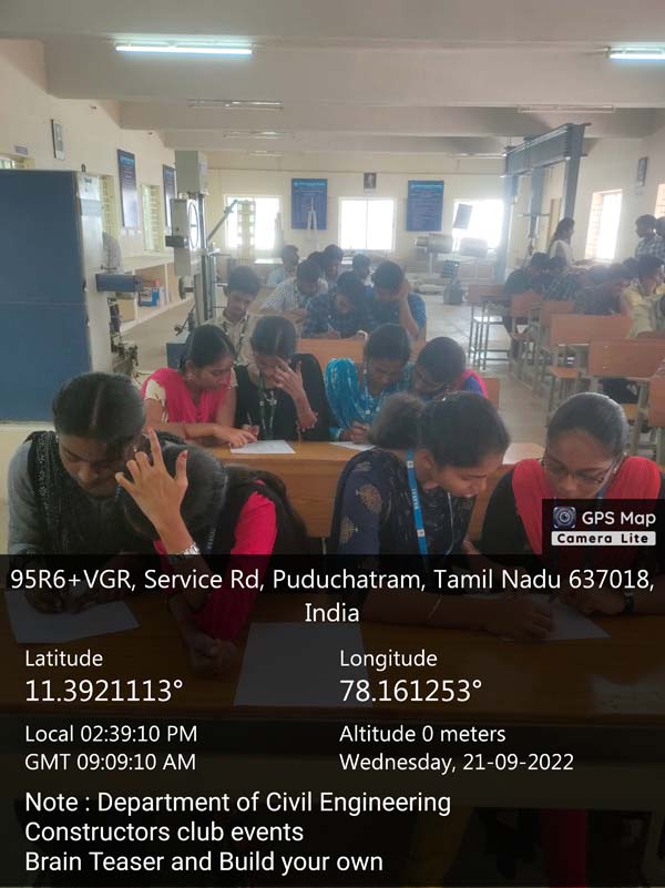 The Constructors club, Department of Civil Engineering, Paavai Engineering College organized “Brain Teaser and Build your own” on 21.09.2022 from 2.00 p.m. to 4.00 p.m. as a part of club activity.