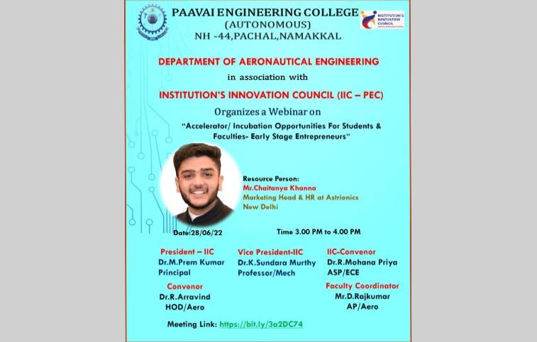 A One-day webinar was conducted by the Department of Aeronautical Engineering and Institution’s Innovation Council (IIC-PEC) on 28.06.2022 on the title “Accelerator/ Incubation Opportunities For Students & Faculties- Early Stage Entrepreneurs” at Paavai Engineering College (Autonomous).  The students of Aeronautical engineering attended the Webinar given by Mr. ChaitanyaKhanna, COO Aero.in,HR& Marketing Head,Astrionics,New Delhi. He gave a brief presentation among the students regarding theentrepreneurship efforts to transform individual academic expertise and research results into intellectual property, marketable commodities, and economic development, thereby enhancing faculty and student professional status. He elaborated Incubation Opportunities for students and faculties as Early-Stage Entrepreneurs. Earlier, Welcome address and Chief Guest Introduction was given by Ms M Sathyaand vote of thanks by Ms K Premiga of Third year Aeronautical Engineering. The Head of Department, faculty members of the Aeronautical department and IIC members graced the function with their presence and a total of  90 students  attended  the  Webinar.