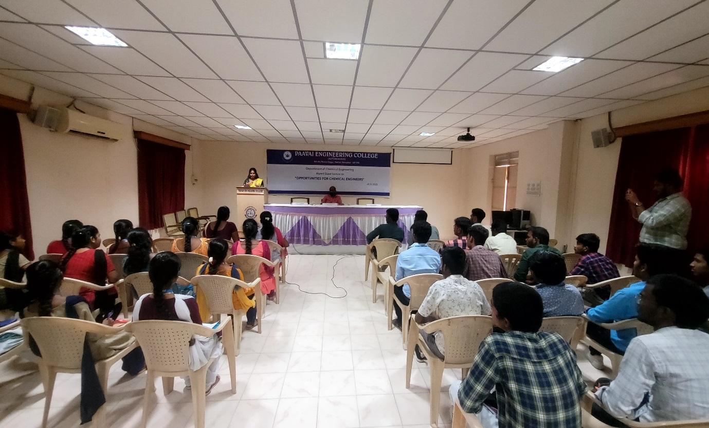 The Department of Chemical Engineering in association with the Alumni Association cell organised an Alumni guest lecture titled “Opportunities for Chemical Engineers” on 29.12.2023. The welcome address was given by Ms.G.Devadharshini of II Chemical Engineering. Dr.M.Premkumar, Principal gave the presidential address. In his address, he appreciated the alumni speaker and motivated the students to utilize this opportunity and be interactive during the session. Ms.P.Yogasri, from II year Chemical Engineering introduced the resource speakers.