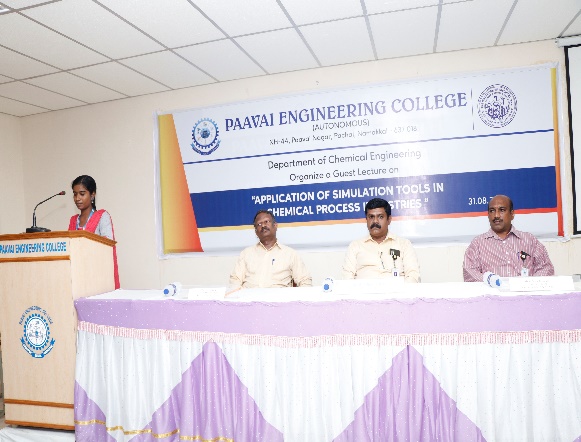 The Department of Chemical Engineering, PAAVAI ENGINEERING COLLEGE in association with the Institution of Engineers India (IEI), Salem Local Chapter, Salem has conducted a Guest Lecture on the topic “Applications of Simulation Tools in Chemical Process Industries”on 31.08.2023. The guest lecture started with welcome address by Selvi. R.Hemavathi of Third year Chemical Engineering. The function was felicitated by Dr.M.Premkumar, Principal of Paavai Engineering College. The programme was convened by Mr. R. Balasubramani, Head of the Department and faculty members of the department. The chief guest introduction was given by Selvan.N.Gokul of III year Chemical. The Resource Person of the day is Dr.C.Gomadurai, Associate Professor of Chemical Engineering, Kongu Engineering College, Perundurai, Erode district.