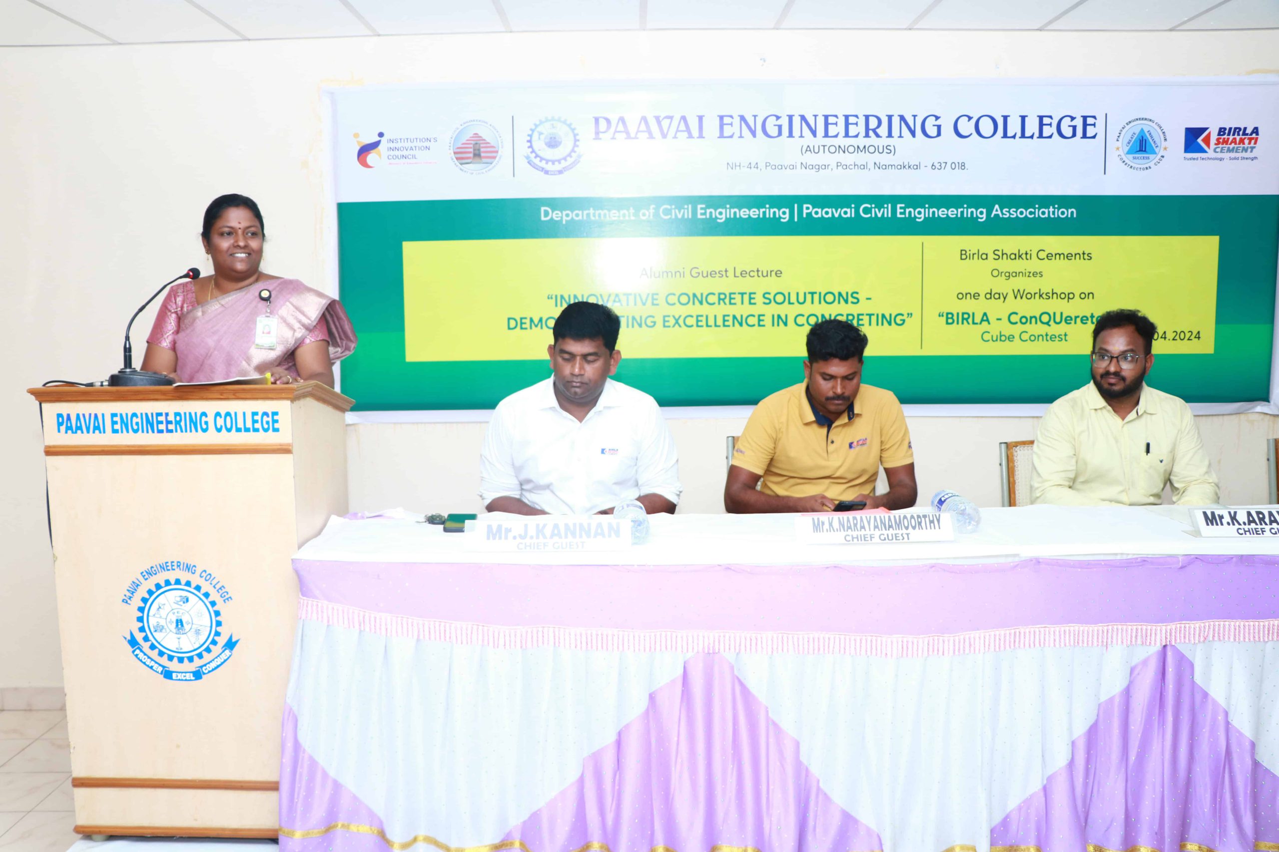 The Department of Civil Engineering, Paavai Engineering College (Autonomous) and Paavai Civil Engineering Association, Institution’s Innovation Council (PEC-IIC) jointly organized Alumni guest lecture titled “Innovative Concrete Solutions – Demonstrating Excellence in Concreting” and One Day Workshop titled “BIRLA – CONQUERETE” Cube Contest on 16.04.2024 from 9.30 a.m. to 4.30 p.m. as a part of experimental learning activity. Ms.P.N. Thenswetha, Final year student welcomed the gathering & Mr.L.Dhanush, Third year student gave the Chief Guest introduction.