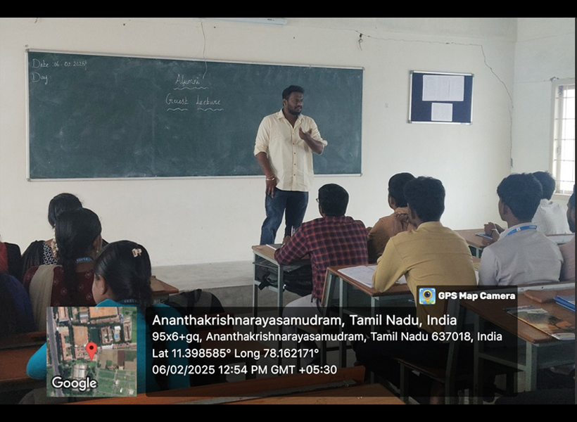 The Department of Electrical and Electronics Engineering at Paavai Engineering College (Autonomous) organized an Alumni Guest Lecture on “Career Guidance” on 6th February 2025. The session featured Mr. Thirumalai Subramanyan, Project Manager at Techinnova, Jubail, Saudi Arabia, as the guest speaker.