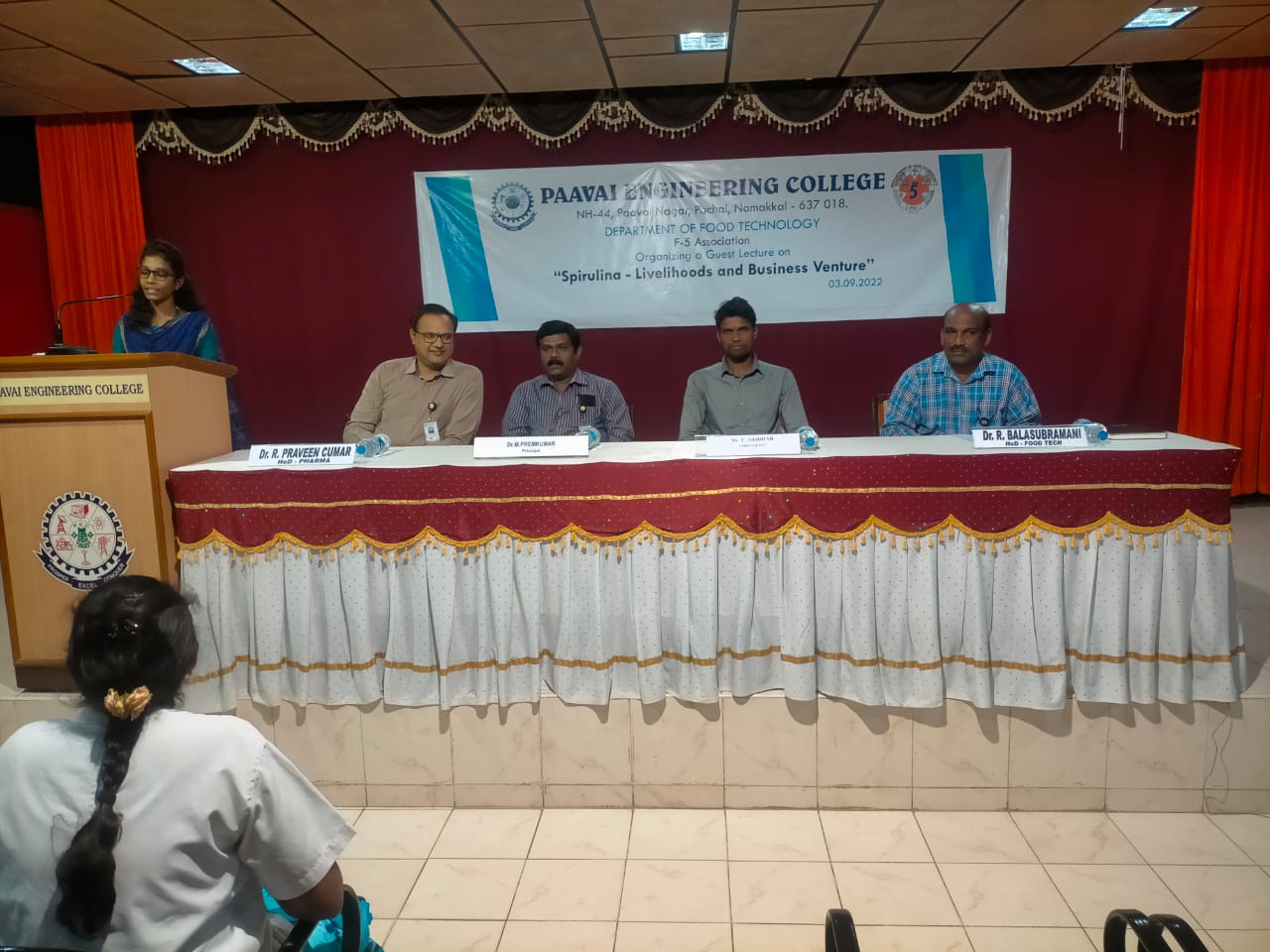 The Department of Food Technology has conducted a guest lecture entitled “SPIRULINA – LIVELIHOODS AND BUISNESS VENTURE” on 03.09.2022 (Saturday). The students of Food Technology, Chemical Engineering, Agricultural Engineering of Paavai Engineering College&Biotechnology students of Paavai College of Technology attended the guest lecture. The resource person of the day Mr.C. Sridhar, proprietor, A Spiruv-V flabbergasted the students with various cultivation processes of Spirulina, Mushroom and Azolla. He also enlightened the students about the health benefits of spirulina and its scope as a business venture. The students interacted with the subject expertise with their queries and illuminated themselves.