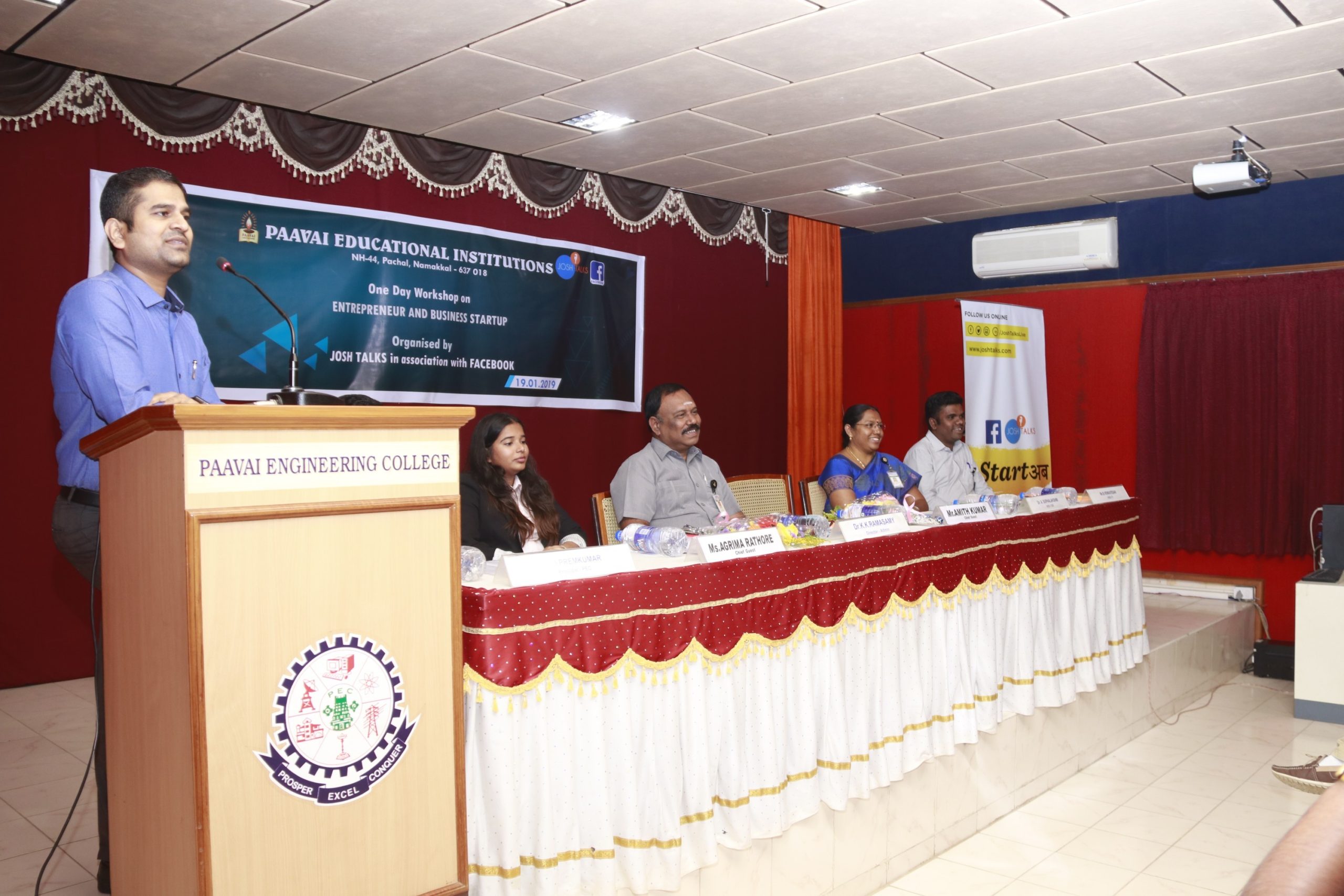 The departments of Information Technology and Computer Science and Engineering organized a one day workshop on “ENTREPRENEUR AND BUSINESS STARTUP” in association with Josh Talks and Facebook on 19.01.2019 in Kalam’s Chamber at Paavai Engineering College. The function started with the prayer song. Dr.K.K.Ramasamy, Directior-Administration, presided over the function. In his presidential address, he asked the students how many of them would become an entrepreneur after graduation and also motivated the students to start their own businesses. Mr.Amith Kumar, Co-Founder, Servercake, India and Mrs.Agrima Rathore, Campaign Manager, Josh Talks were the chief guests. In the session , Mr.Amith Kumar gave a brief introduction about the salient features of entrepreneurship and the basic qualities required for this task. He elaborated on giving guidelines to start and run a business successfully. He suggested that a good entrepreneur has to be determined in marketing. He highlighted the art of buying and selling by creating curiosity among people towards products. He listed out the government compliances for young graduates to start a business. Mrs Agrima Rathore, advised the students that they need to realize their self and they have to decide what they wish to become after their graduation. In her presentation, she visualized how the Facebook and Instagram were helpful to launch startups. At the end of the session feedbacks were given. The students Rishi Rahul, III year IT and Soundarya Final year CSE of Paavai Engineering College, introduced the chief guests. The valedictory function held at 4.30pm at Kalam’s Chamber. Mrs.Shanmika gave the vote of thanks.