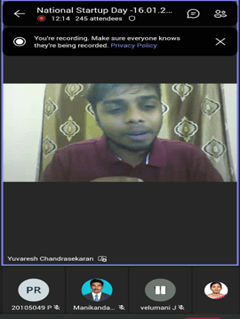 The Institution’s Innovation Council in association with the Entrepreneurship Development Cell organized a webinar to celebrate “National Startup Day” on 16.01.2023. The objective of the webinar was to celebrate and stress the importance of National Start-up Day. Mr.Yuvaresh Chandrasekaran, Founder and CEO – FUINN Tech, Founder and COO – MNMarketzy Solutions, Chennai was the resource speaker.