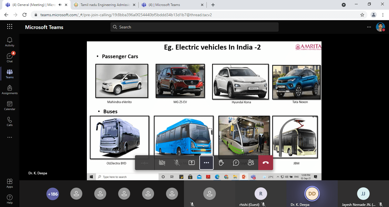 Dr.K.DEEPA Associate Professor, Electrical and Electronics Engineering, School of Engineering, Amrita Vishwa Vidyapeetham (Deemed to be University), Bengaluru, was the guest speaker. In her special address, she explained about the role, needs and importance of electric vehicle technology in this era. In her presentation, she elaborated the basic concepts of greenhouse gases and its effects. She insisted that EV adoption plays a major role in reducing pollution and to improve efficiency when compared with IC engine. She related the basic courses with the formation of EV technology. She described electrical machines, power electronic converters, batteries, control system plays a vital role in designing an EV.