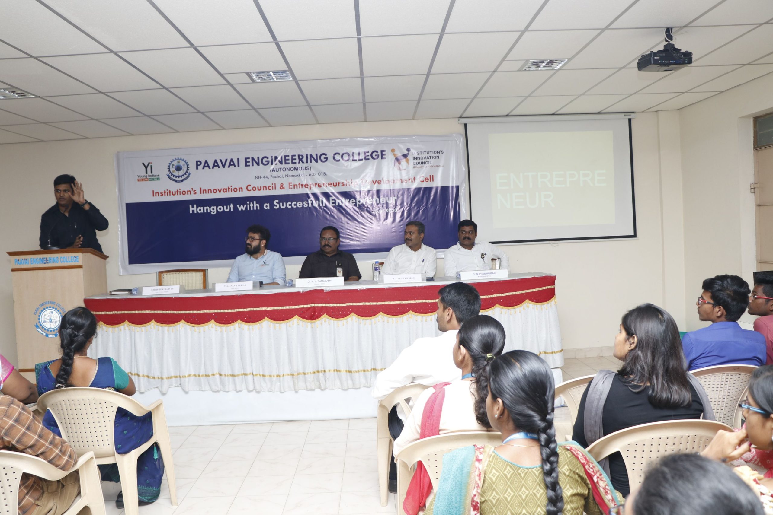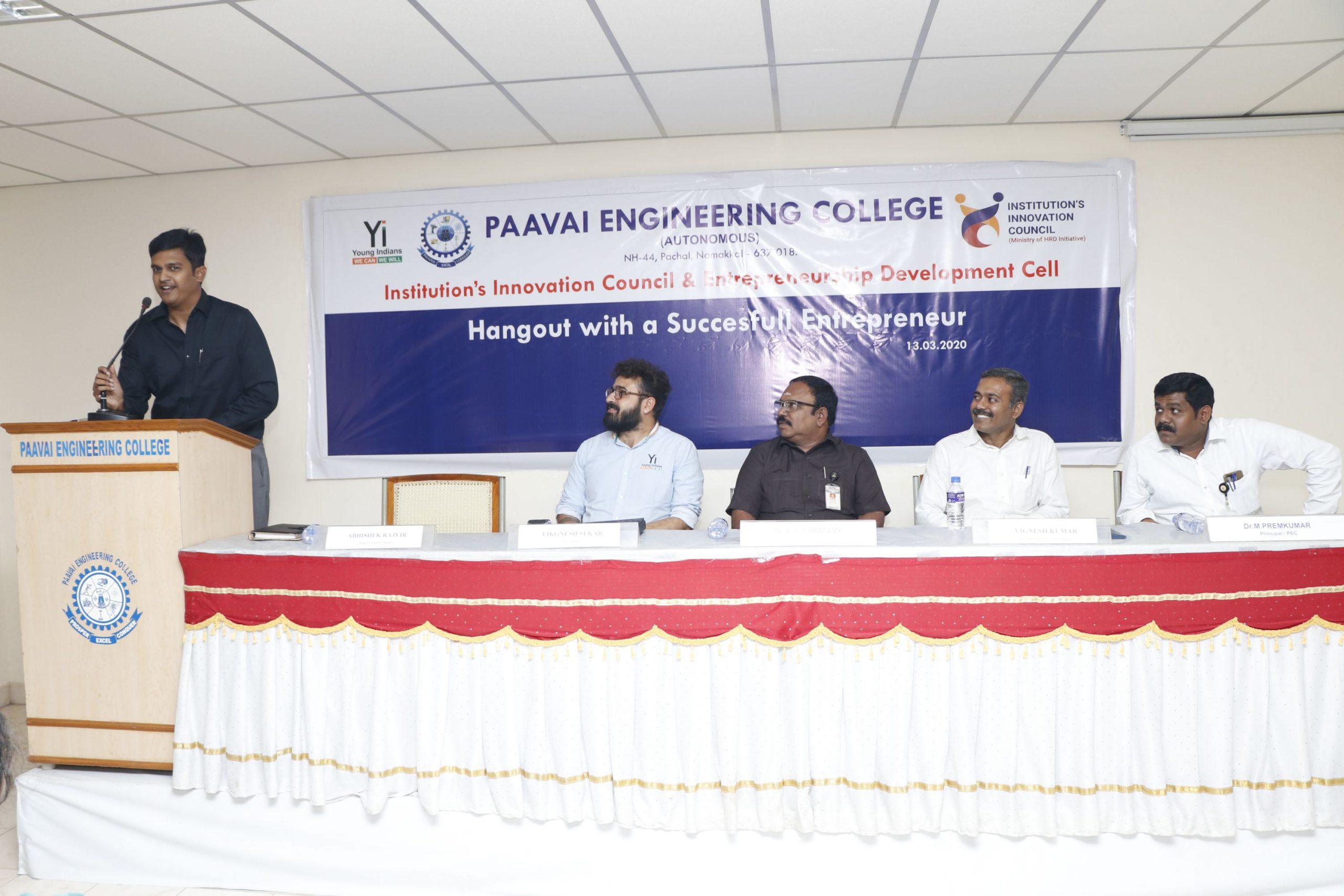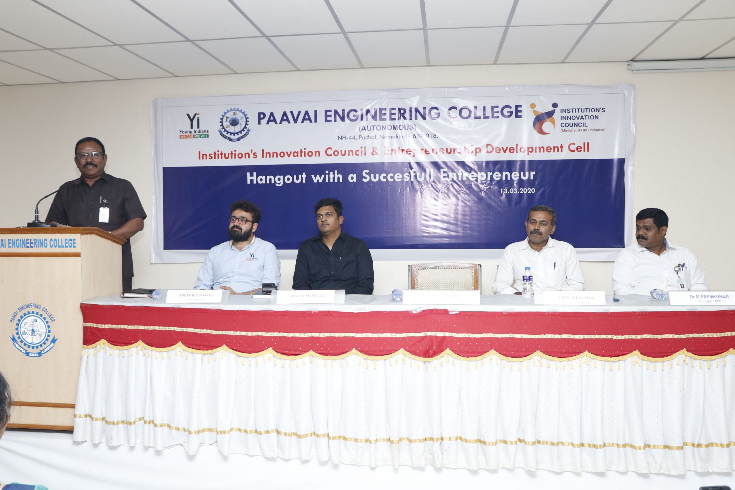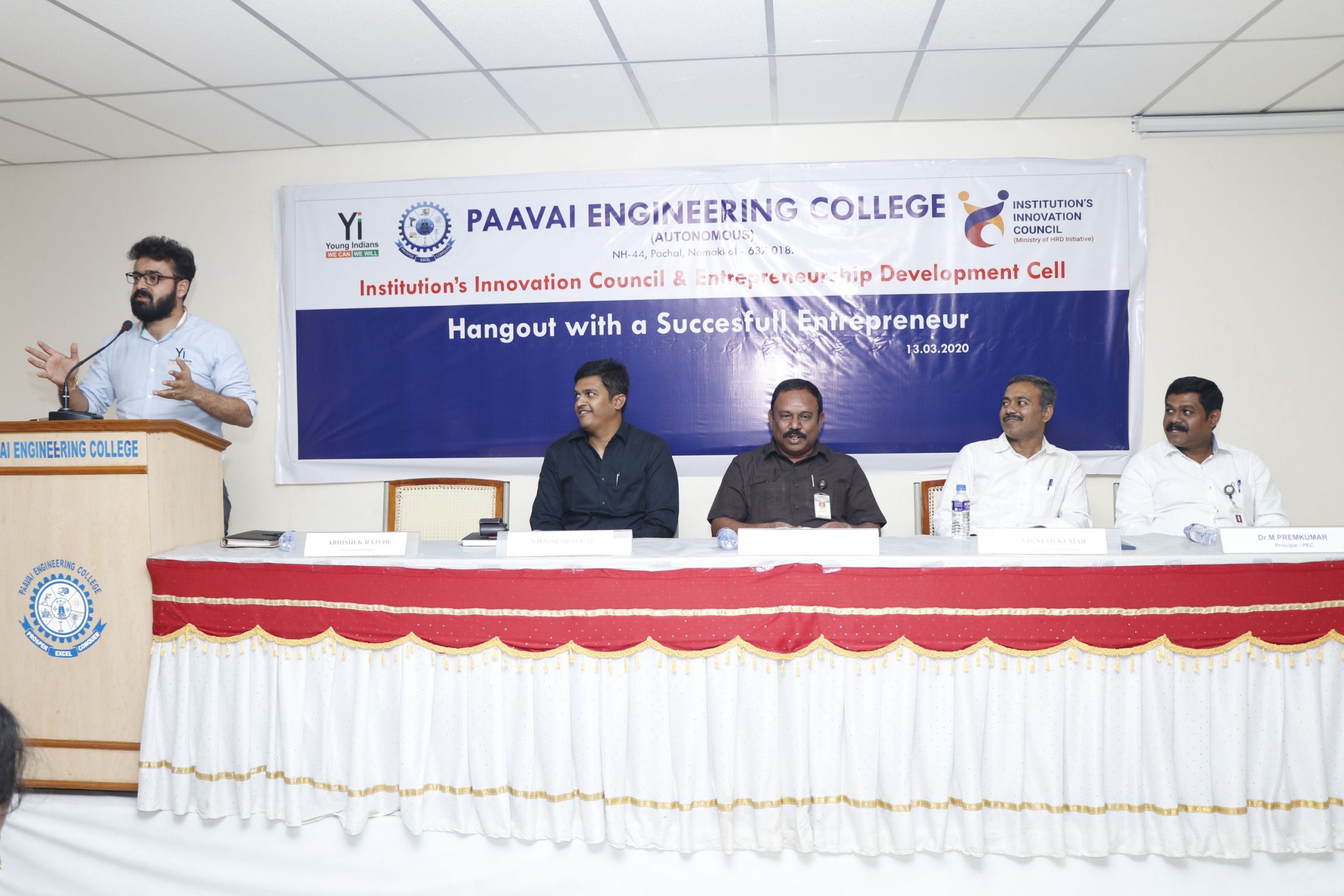 The workshop was inaugurated with the prayer song at 11:00 am in the presence of chief guest Mr.Vikgnesh Sekar, Guest Speaker, Director Admin, Principal, Mr. Abhishek Rajvir, Chair, Yi-Salem Chapter, Mr.Vignesh Kumar, Co-Chair, Yi-Salem Chapter, Faculty Coordinators of Young Indians, IIC and EDC along with the student participants. The Presidential address was delivered by Dr.K.K.Ramasamy, Director Admin, Paavai Institutions, in which he highlighted the importance of ideas in this competitive world. With a short story, he motivated the students to supplement their skills by practicing themselves in the available global market. The session was carried over by the guest speaker. Mr.Vikgnesh Sekar, Past Chair, Yi Salem Chapter, Director of VR Suzuki, gave a brief introduction about case studies of the success stories behind OYO groups, BYJU’s, Nativespecial.com, Caratlane, Fyndus.com, Ullavar bhoomi, etc. He interacted with the students and involved them in the discussion about the same. Mr Abhishek Rajvil, Chair, Yi Salem Chapter, gave a brief introduction about “Yi – YUVA”. Mr.Vignesh Kumar, Co-Chair, Yi Salem Chapter, explained about the various vertical of Yi- YUVA. Mr.D.Harichandar, II MCT, PEC welcomed the gathering, Mr.S.Prechiti Sinha,III MCT, PEC introduced the guest speaker and the session ended with the vote of thanks proposed by Ms.P.Tharani, II MCT, Paavai Engineering College.