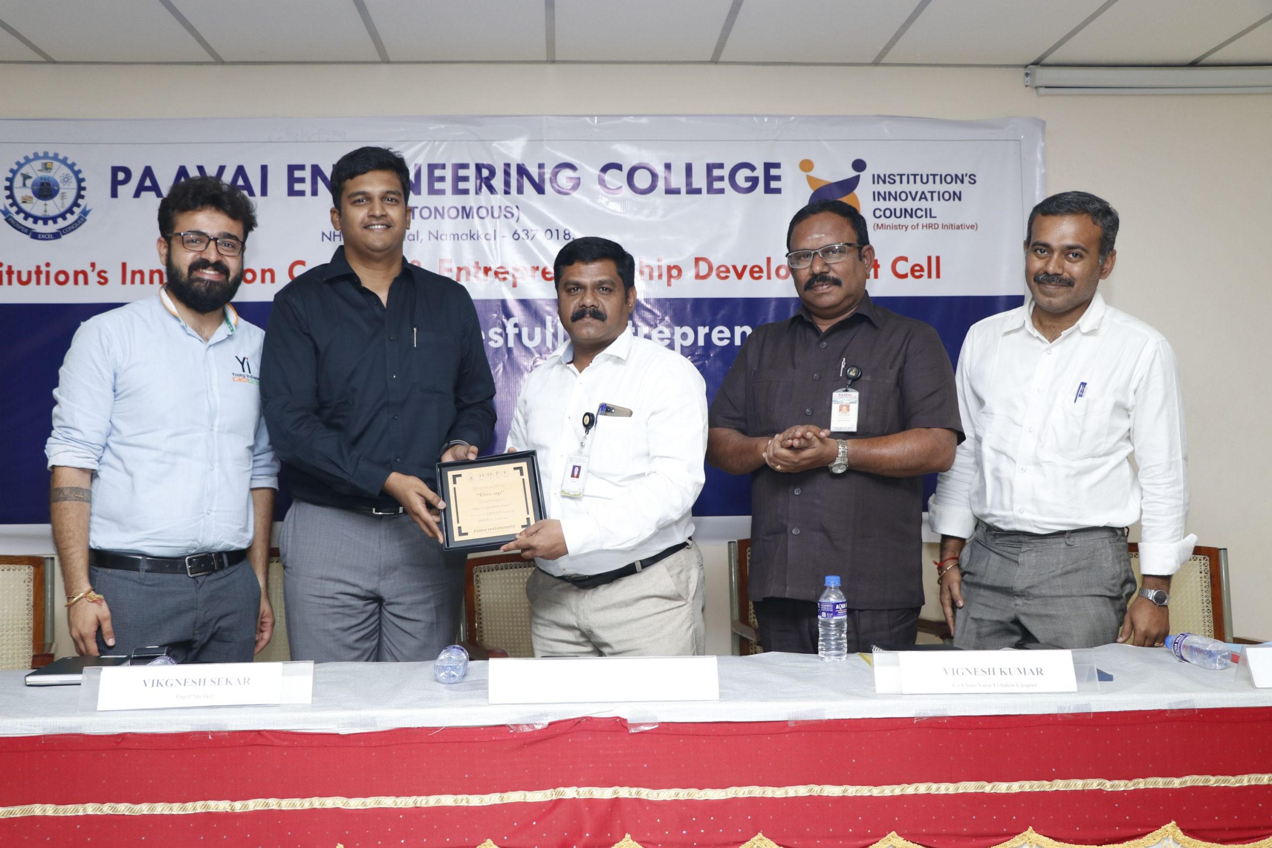 The workshop was inaugurated with the prayer song at 11:00 am in the presence of chief guest Mr.Vikgnesh Sekar, Guest Speaker, Director Admin, Principal, Mr. Abhishek Rajvir, Chair, Yi-Salem Chapter, Mr.Vignesh Kumar, Co-Chair, Yi-Salem Chapter, Faculty Coordinators of Young Indians, IIC and EDC along with the student participants. The Presidential address was delivered by Dr.K.K.Ramasamy, Director Admin, Paavai Institutions, in which he highlighted the importance of ideas in this competitive world. With a short story, he motivated the students to supplement their skills by practicing themselves in the available global market. The session was carried over by the guest speaker. Mr.Vikgnesh Sekar, Past Chair, Yi Salem Chapter, Director of VR Suzuki, gave a brief introduction about case studies of the success stories behind OYO groups, BYJU’s, Nativespecial.com, Caratlane, Fyndus.com, Ullavar bhoomi, etc. He interacted with the students and involved them in the discussion about the same. Mr Abhishek Rajvil, Chair, Yi Salem Chapter, gave a brief introduction about “Yi – YUVA”. Mr.Vignesh Kumar, Co-Chair, Yi Salem Chapter, explained about the various vertical of Yi- YUVA. Mr.D.Harichandar, II MCT, PEC welcomed the gathering, Mr.S.Prechiti Sinha,III MCT, PEC introduced the guest speaker and the session ended with the vote of thanks proposed by Ms.P.Tharani, II MCT, Paavai Engineering College.